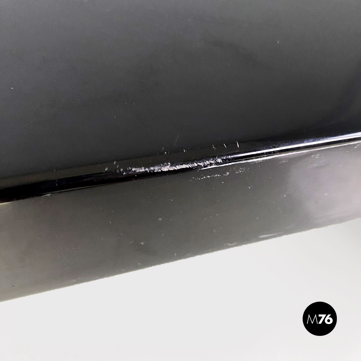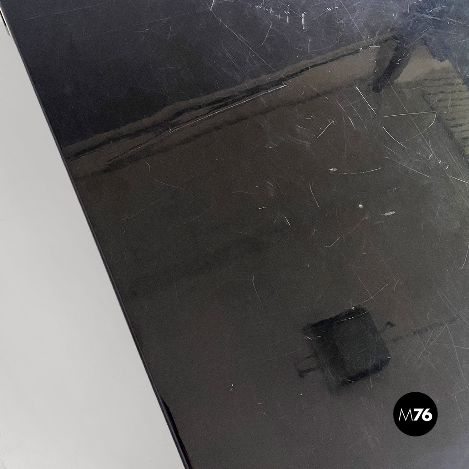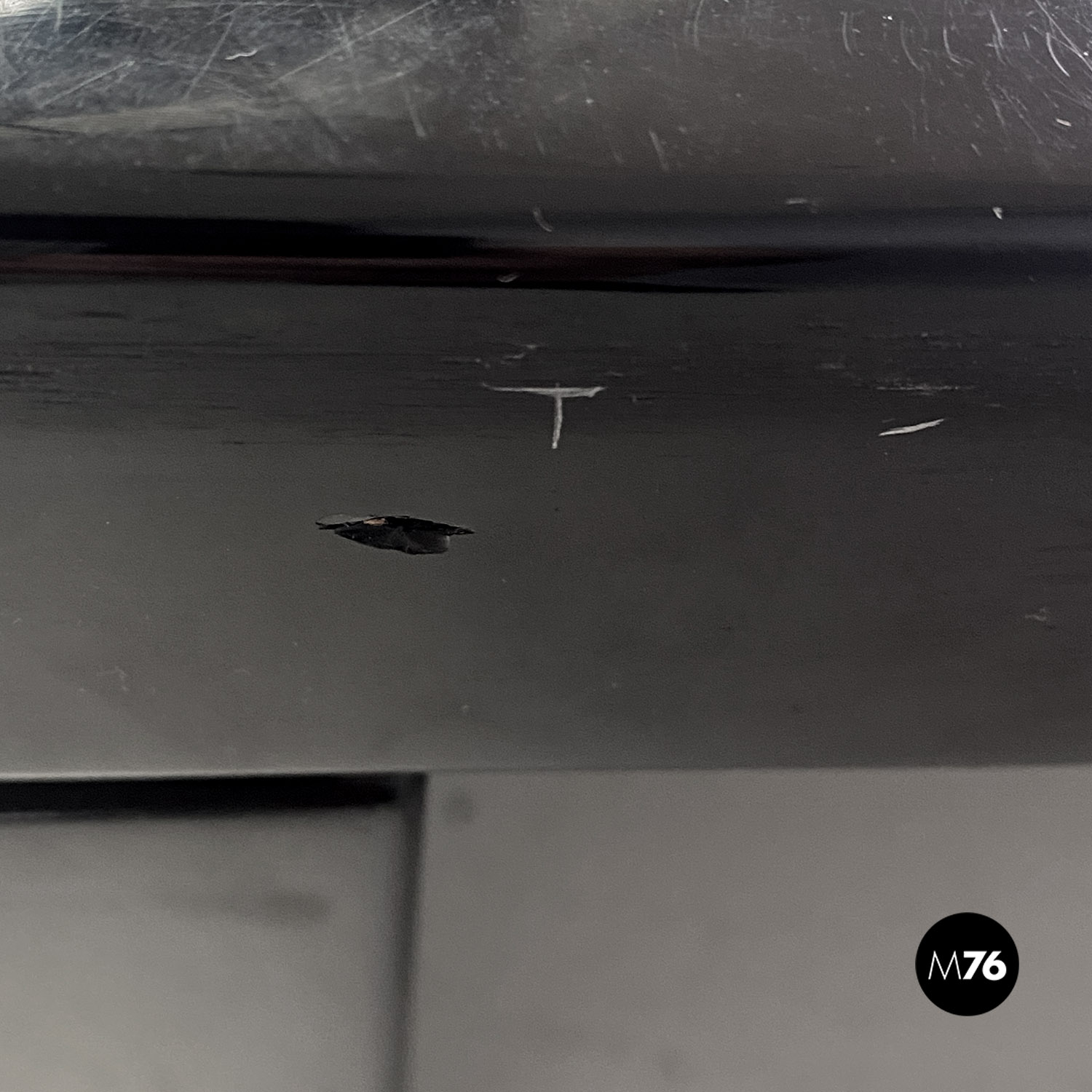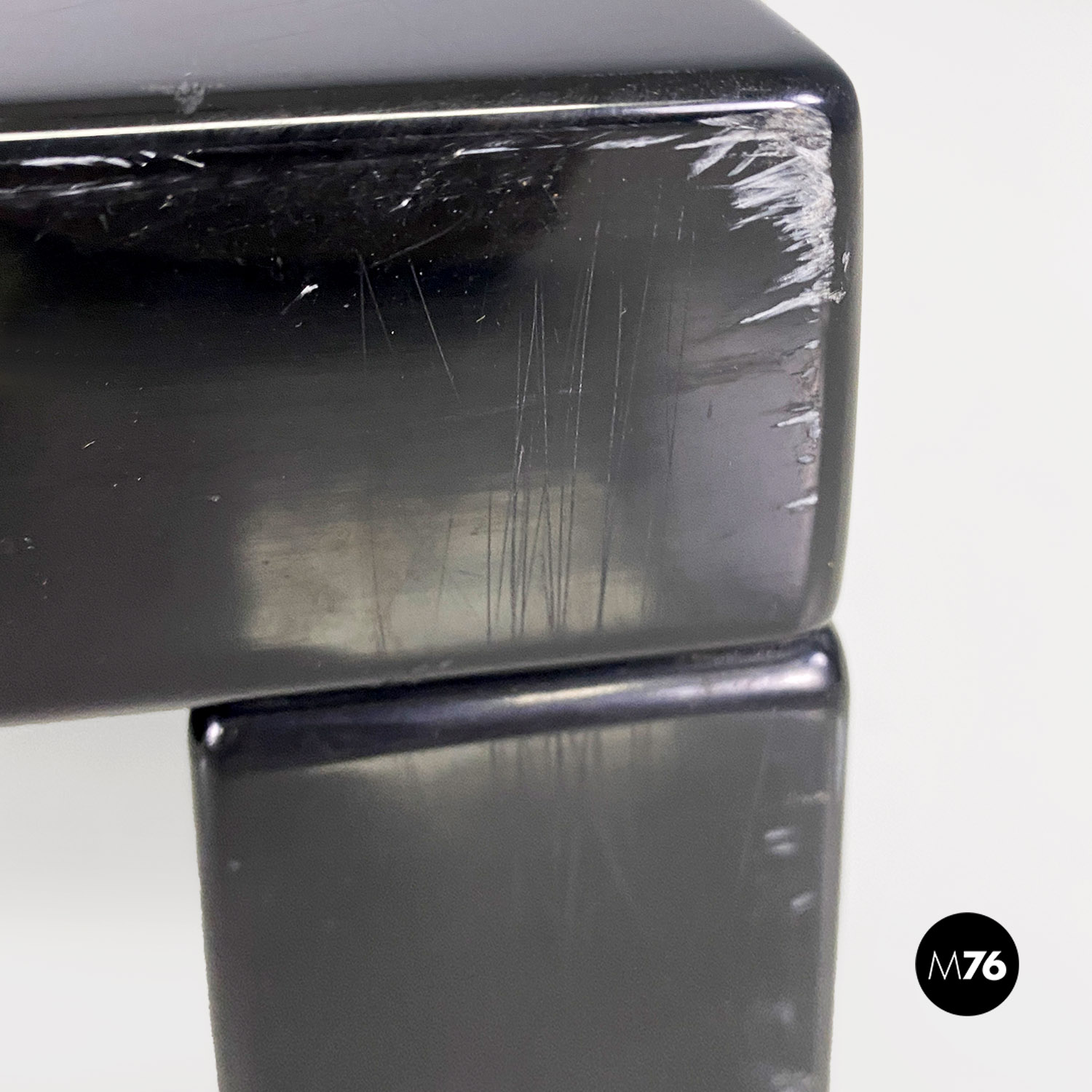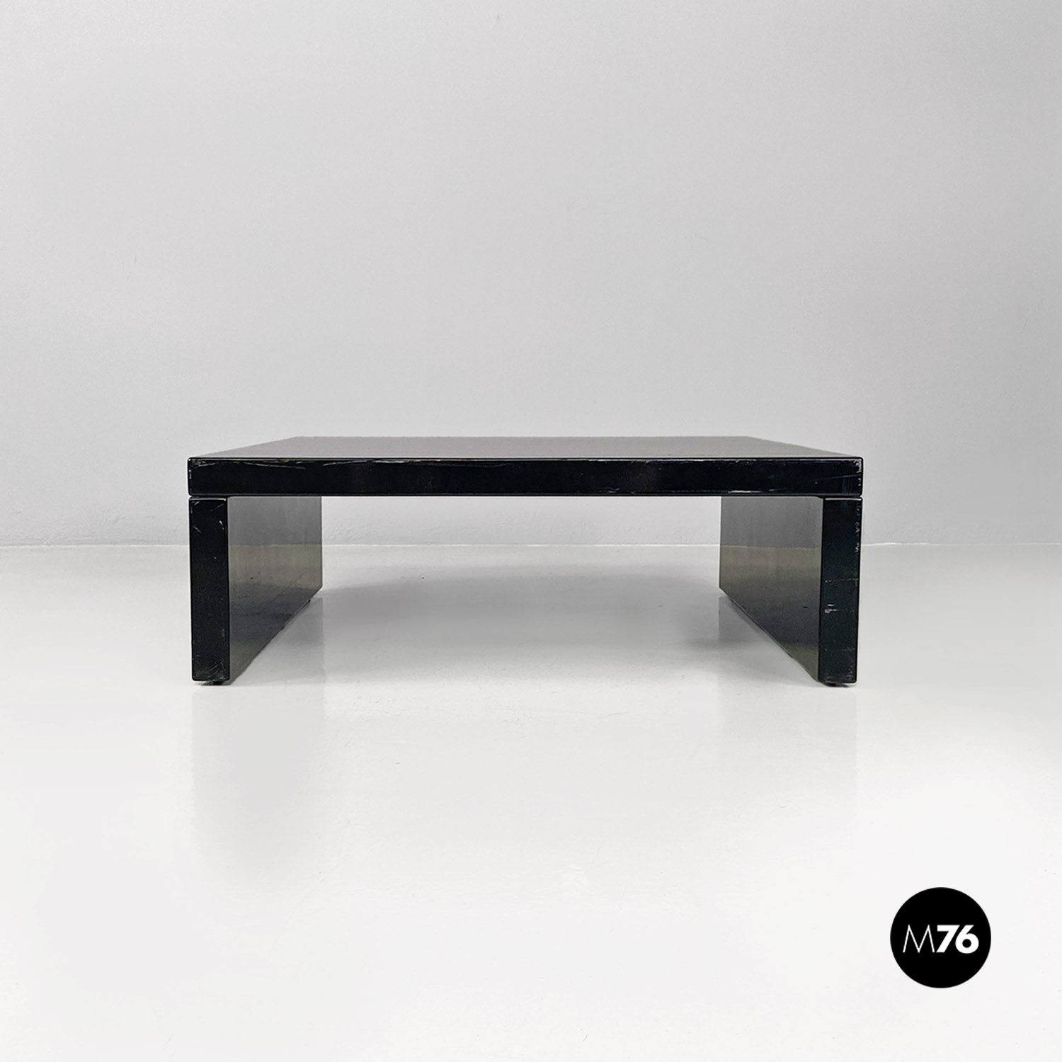 Tavolo da caffè appartenente alla serie Saratoga, quadrato con una struttura rigida realizzata assemblando tre elementi di uguale spessore in legno laccato e verniciato in colore nero, di cui i due laterali di uguale lunghezza a fare da lato e da appoggio.