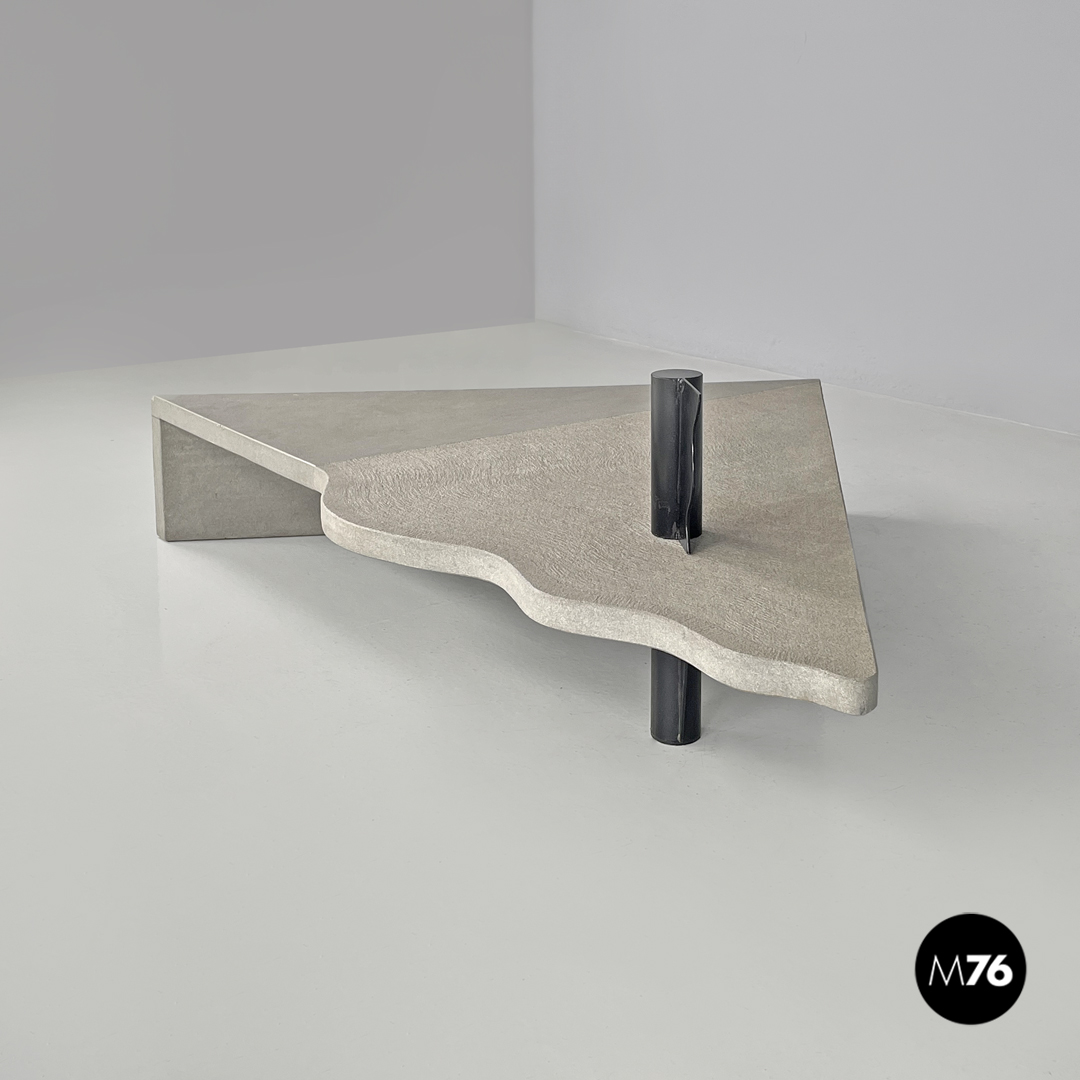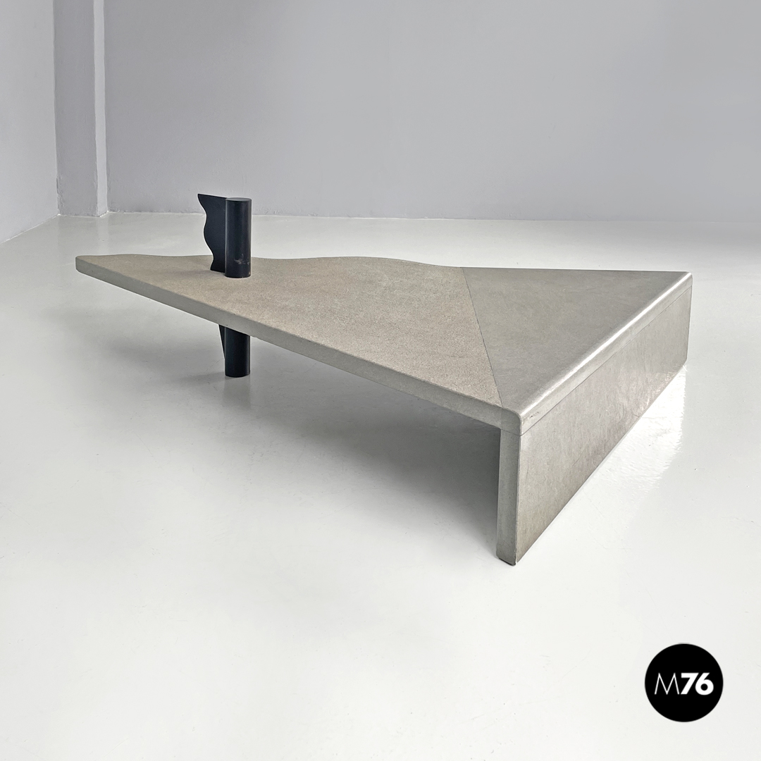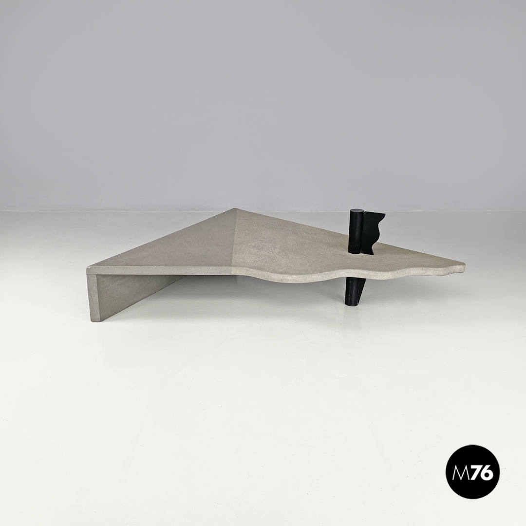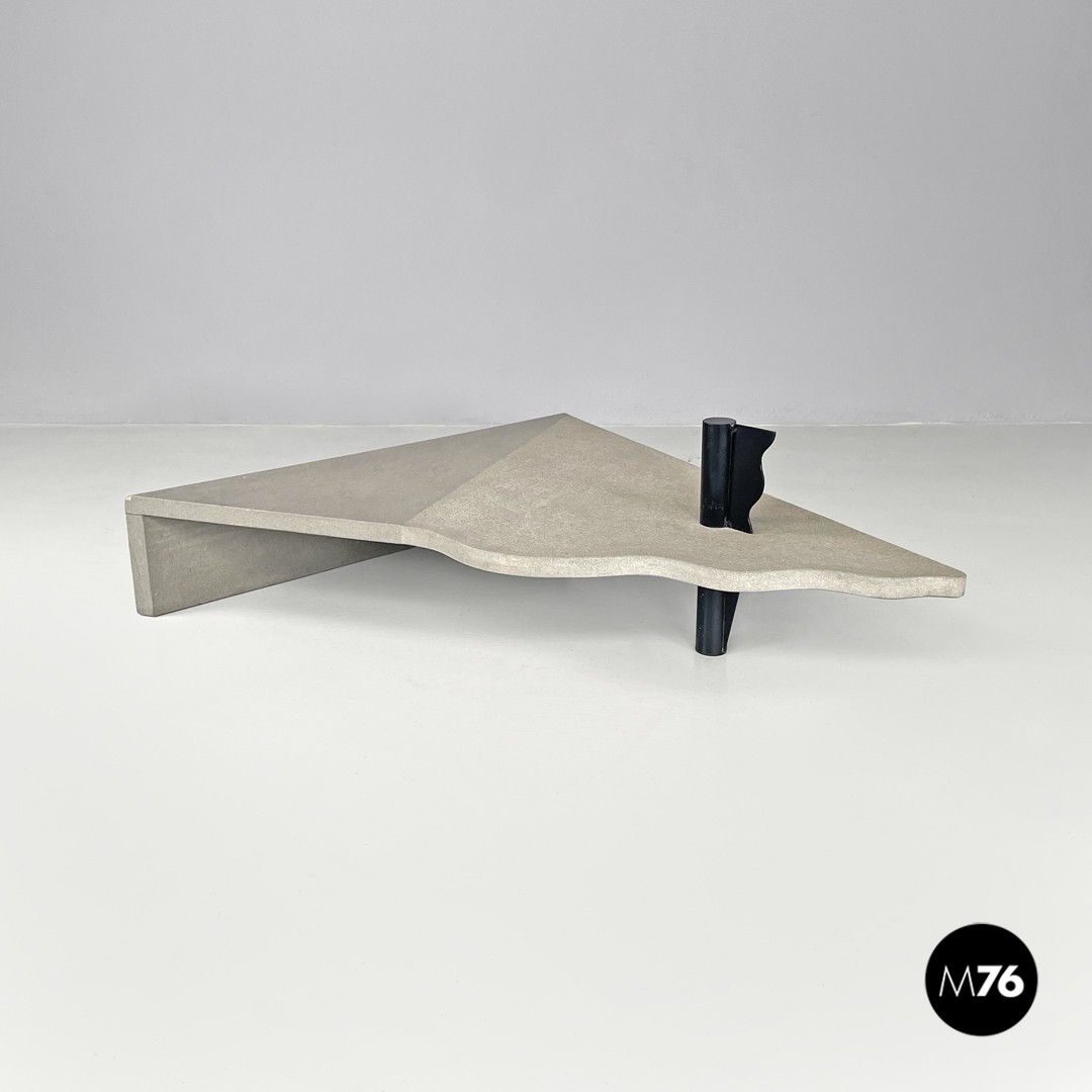 Tavolo da caffè triangolare. Il piano è in cemento, presenta due lati dritti e il terzo sagomato con linee ondulate. Un lato del tavolo presenta una gamba della stessa lunghezza, mentre il “vertice” del triangolo presenta una gamba in metallo nero a sezione tonda, che si trova anche sul piano a formare una decorazione con lo stesso motivo ondulato. La finitura del piano è per metà liscia come il resto della struttura e per metà texturizzata.