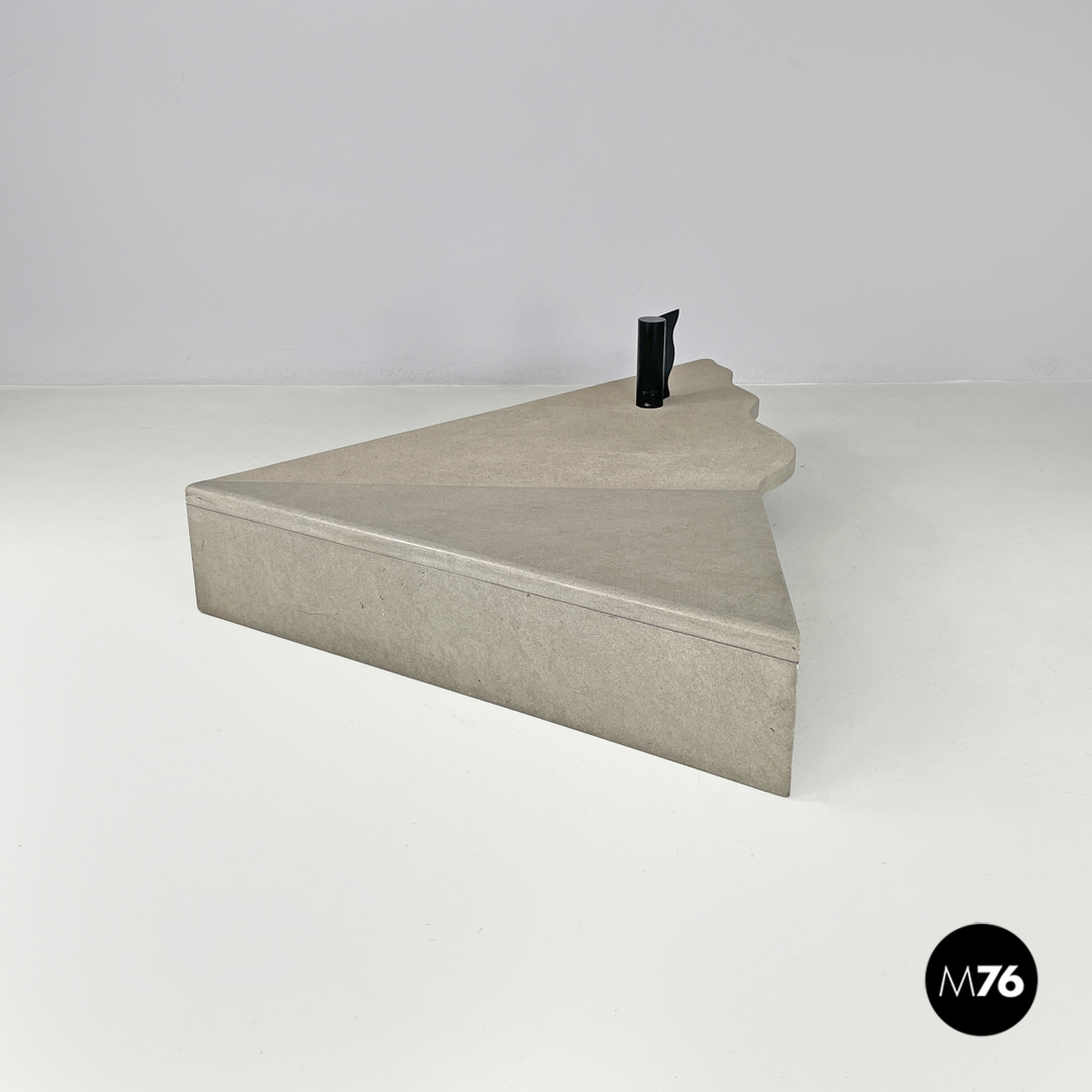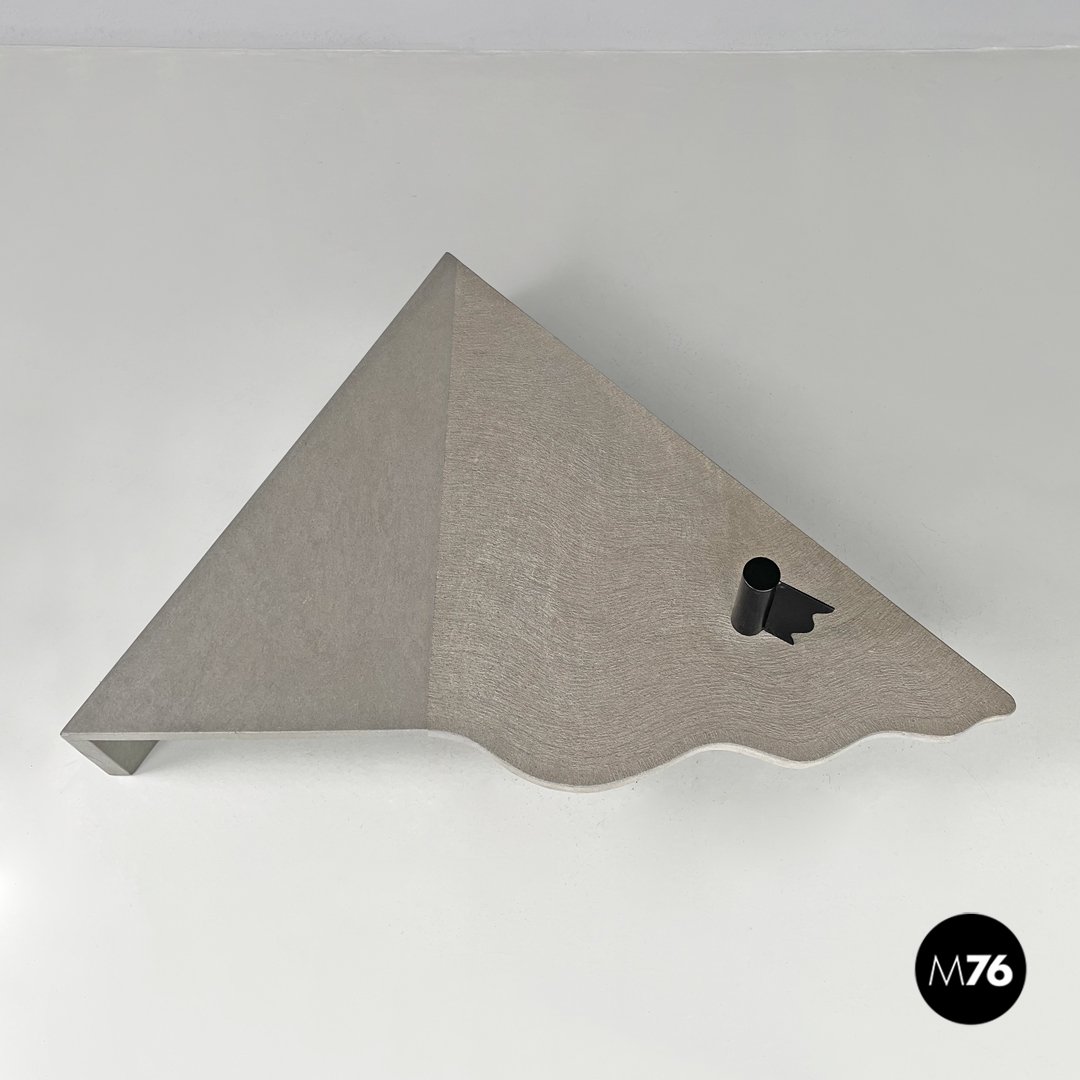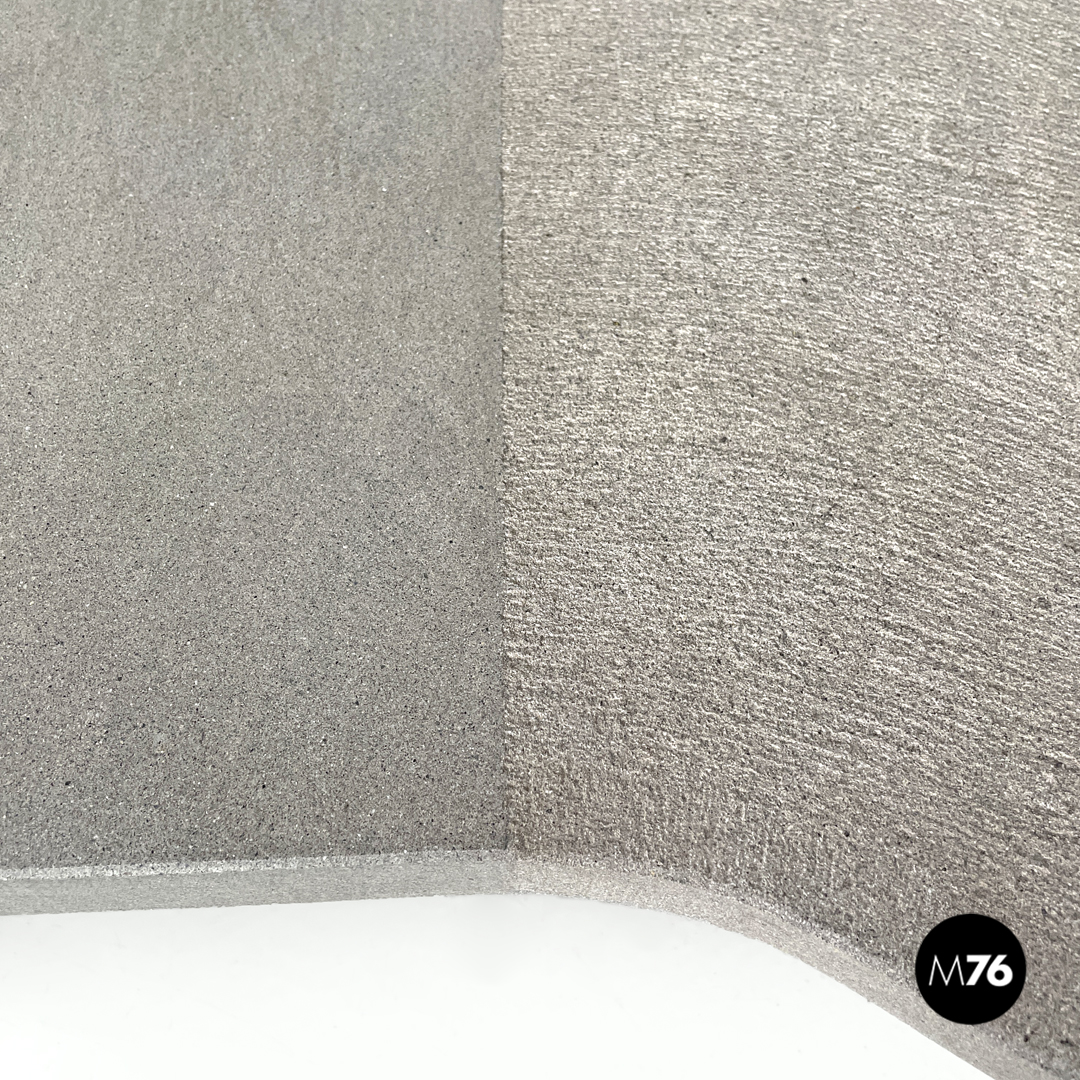 Tavolo da caffè triangolare. Il piano è in cemento, presenta due lati dritti e il terzo sagomato con linee ondulate. Un lato del tavolo presenta una gamba della stessa lunghezza, mentre il “vertice” del triangolo presenta una gamba in metallo nero a sezione tonda, che si trova anche sul piano a formare una decorazione con lo stesso motivo ondulato. La finitura del piano è per metà liscia come il resto della struttura e per metà texturizzata.