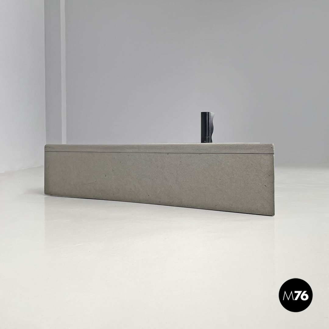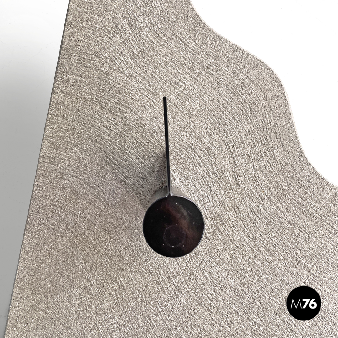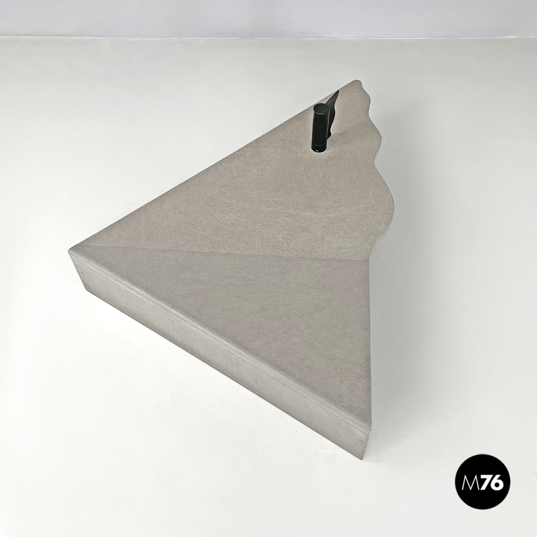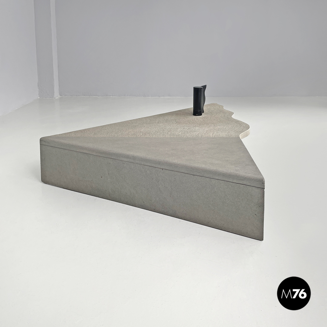 Tavolo da caffè triangolare. Il piano è in cemento, presenta due lati dritti e il terzo sagomato con linee ondulate. Un lato del tavolo presenta una gamba della stessa lunghezza, mentre il “vertice” del triangolo presenta una gamba in metallo nero a sezione tonda, che si trova anche sul piano a formare una decorazione con lo stesso motivo ondulato. La finitura del piano è per metà liscia come il resto della struttura e per metà texturizzata.