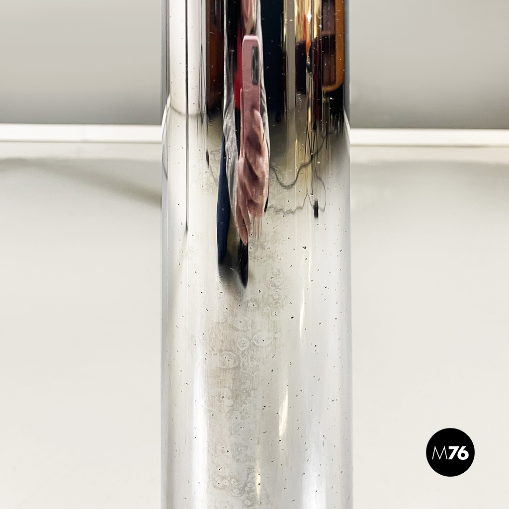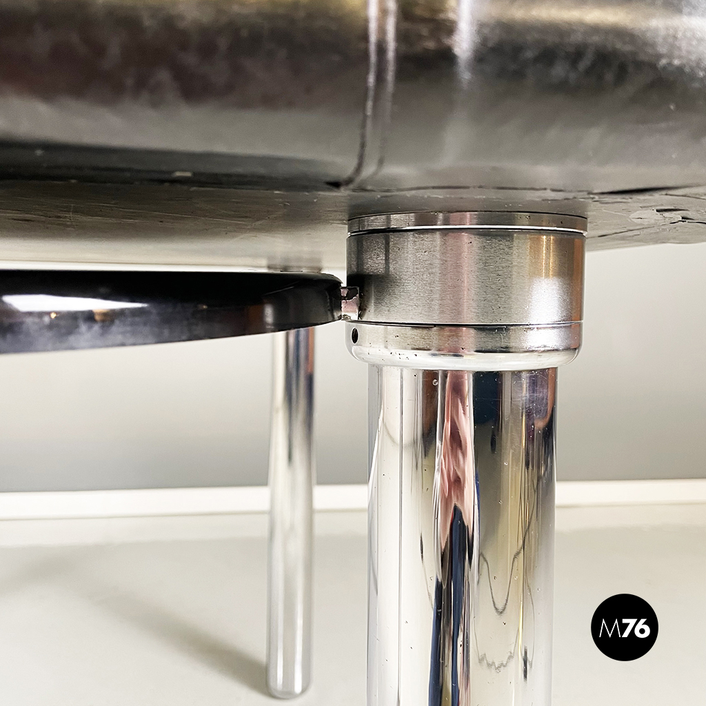 Tavolo da gioco con piano quadrato ad angoli arrotondati: al centro presenta un quadrato di panno verde e sui bordi pelle nera. Ai quattro angoli quattro posacenere tondi in acciaio inseriti nel tavolo. Al di sotto di questi sono presenti quattro ripiani tondi estraibili in plastica nera lucida. Le zampe cilindriche sono in acciaio cromato.