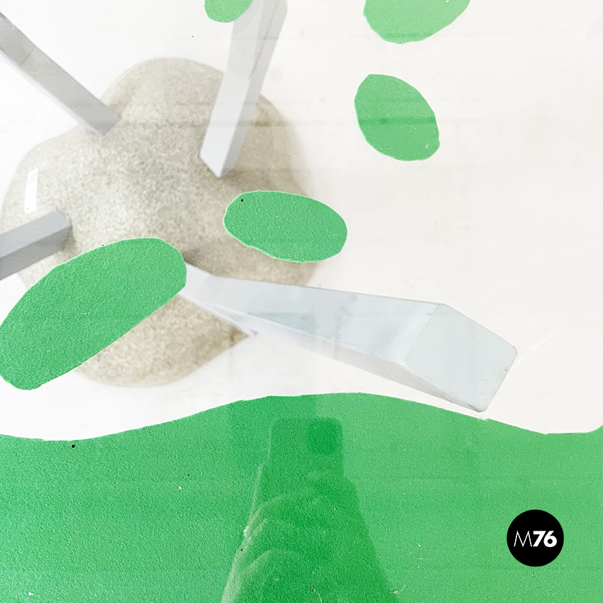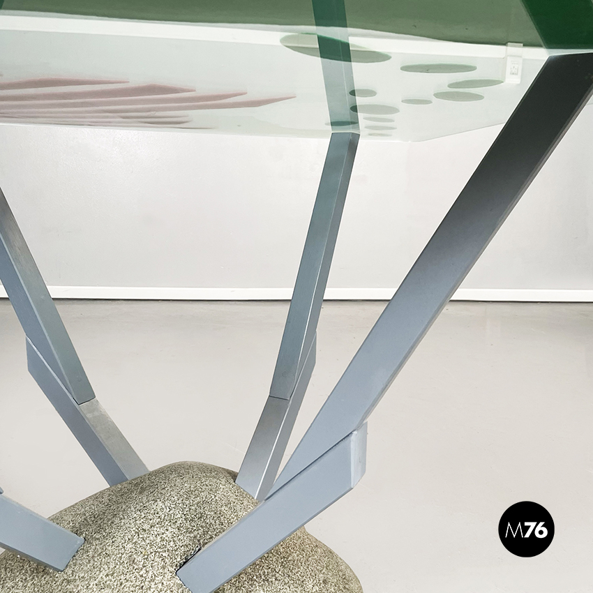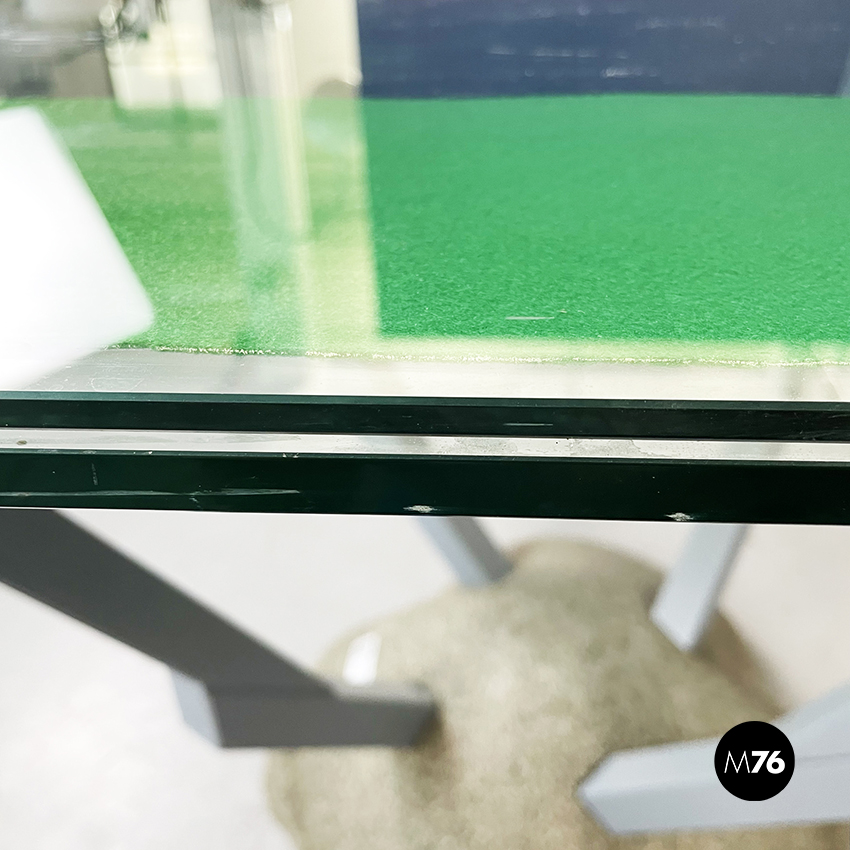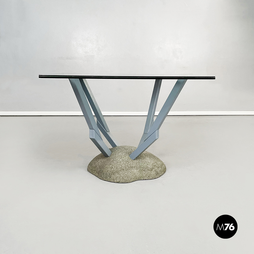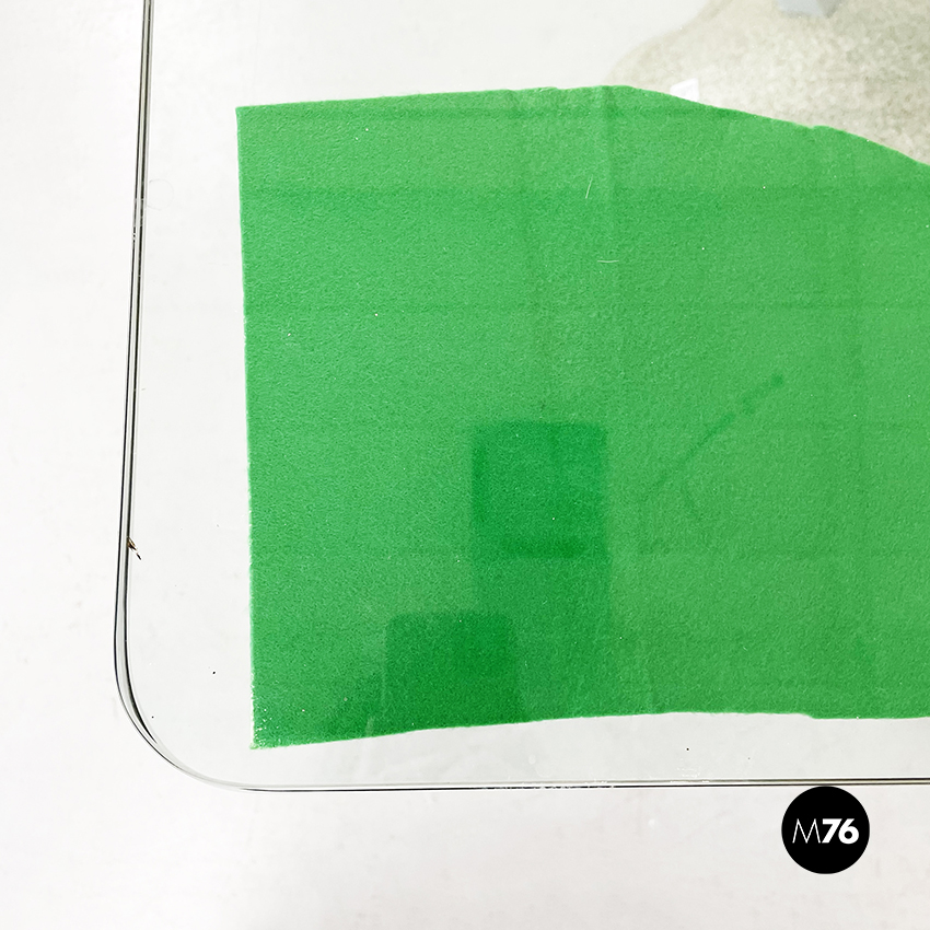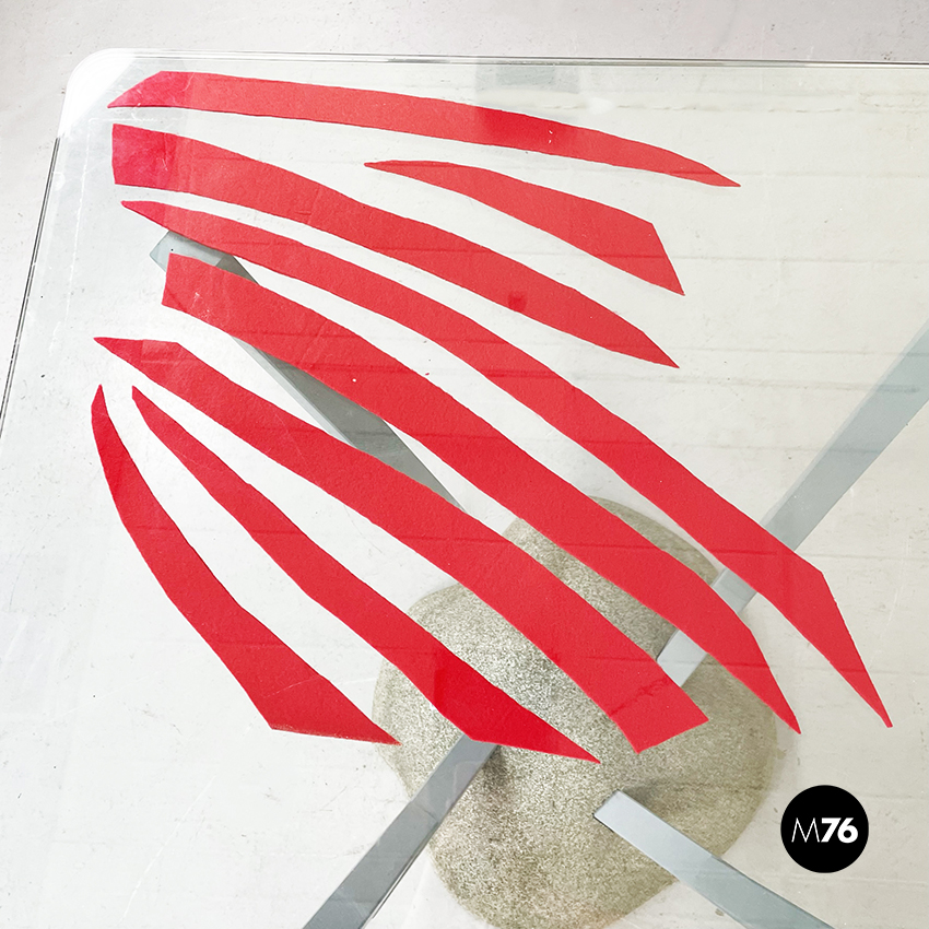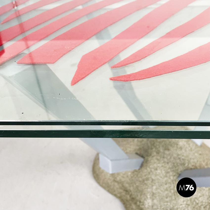 Tavolo da pranzo modello Artifici con piano quadrato ad angoli arrotondati in vetro. Il piano è composto da due lastre di vetro sovrapposte, nel cui mezzo sono presenti dei ritagli di tessuto rosso e verde. Le quattro gambe che sorreggono il piano sono in legno verniciato grigio e si incastrano alla base in sabbia, grani di quarzo ceramicati e poliestere.