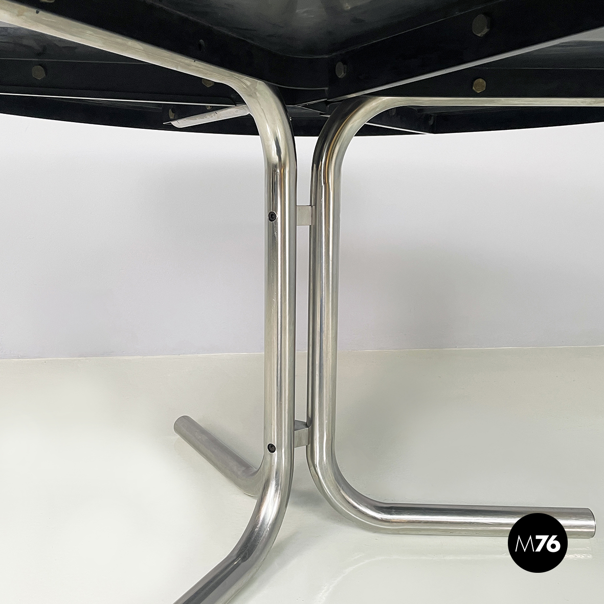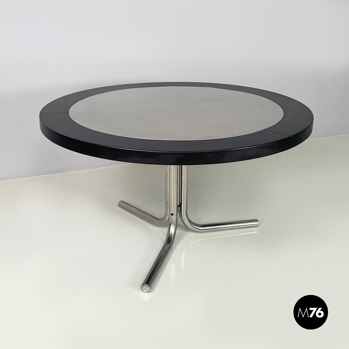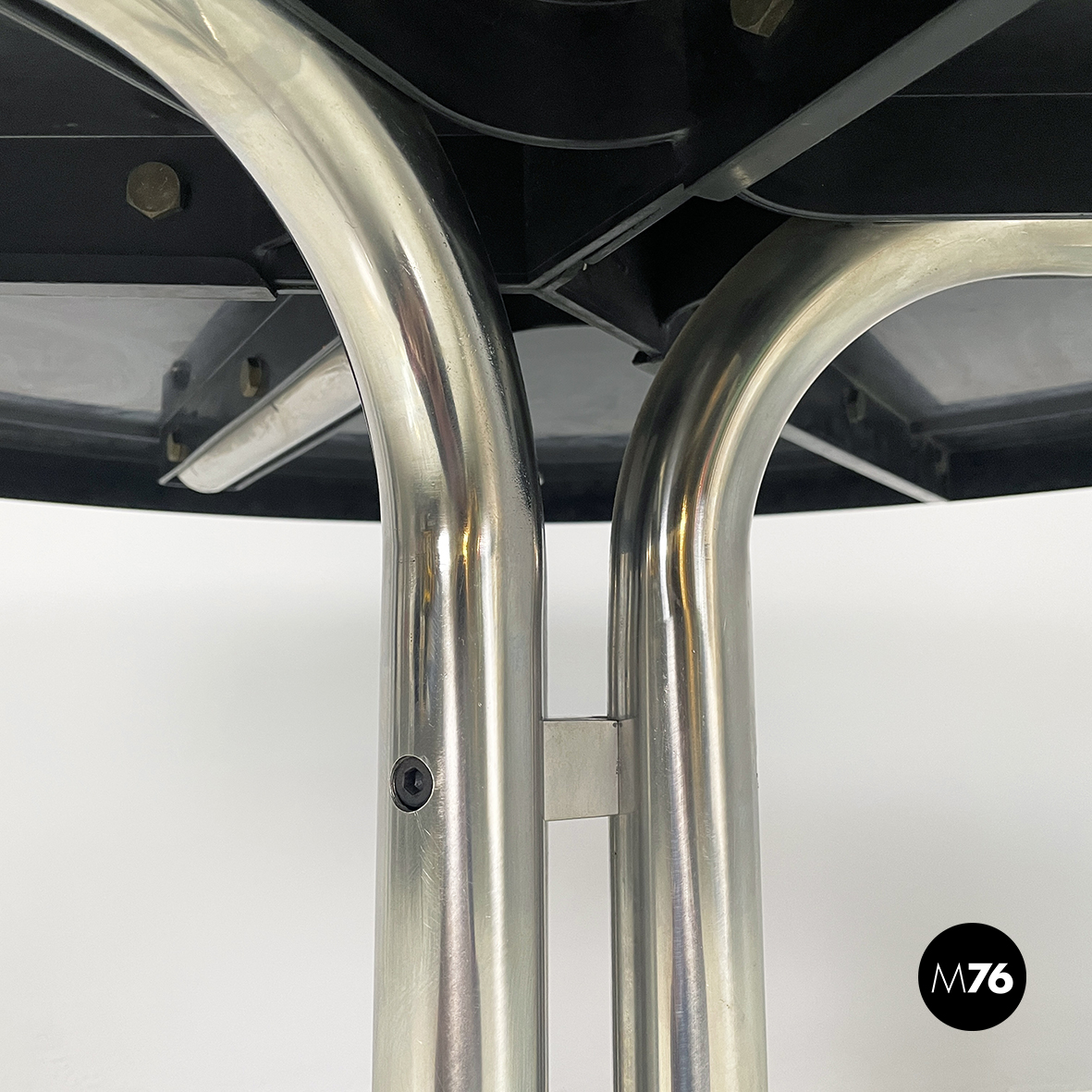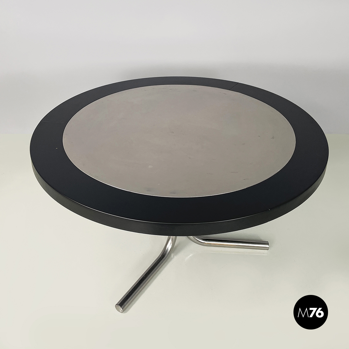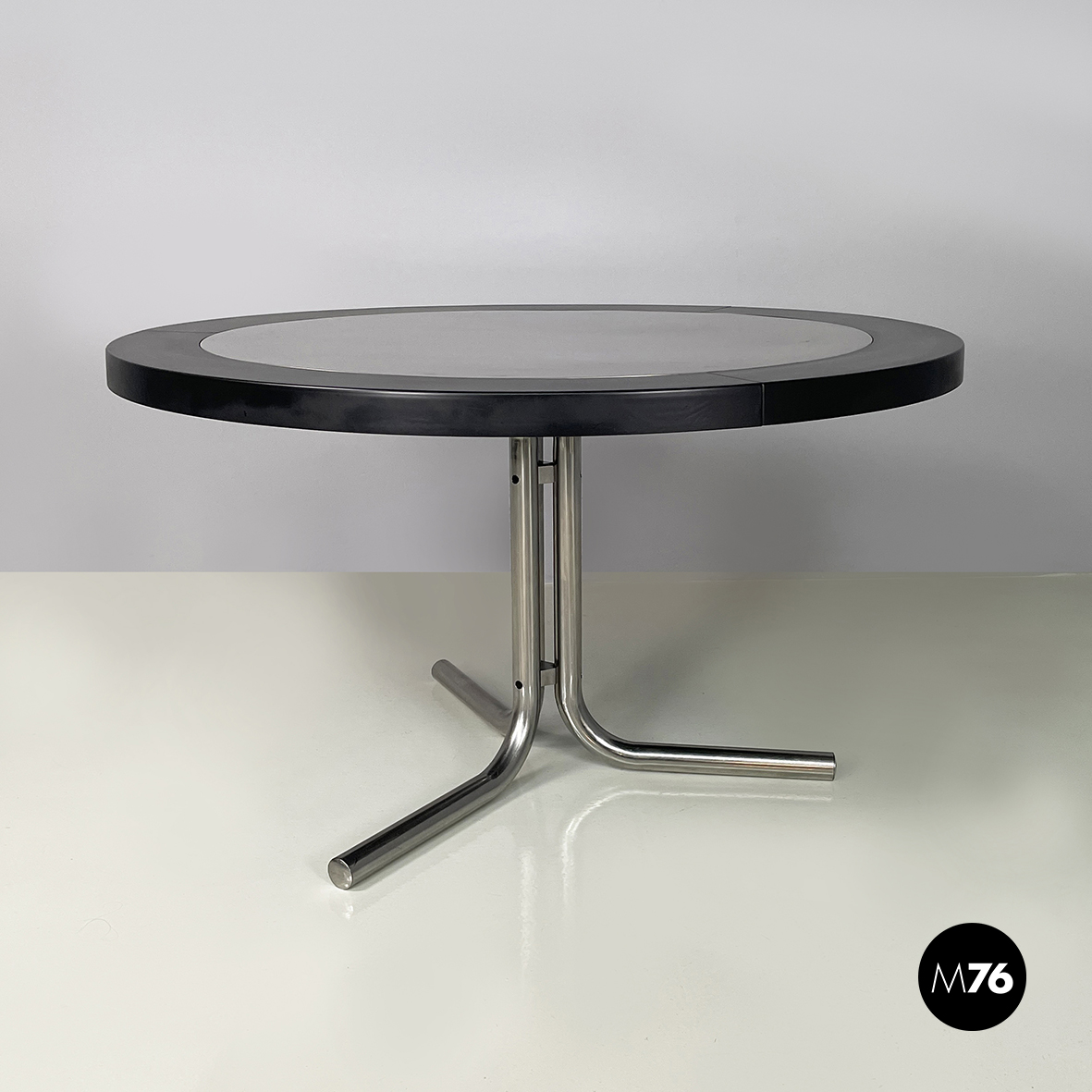 Tavolo da pranzo modello Desco con pianto rotondo in acciaio satinato con il profilo in plastica nera. La zampa a tre razze è in tubolare di metallo.