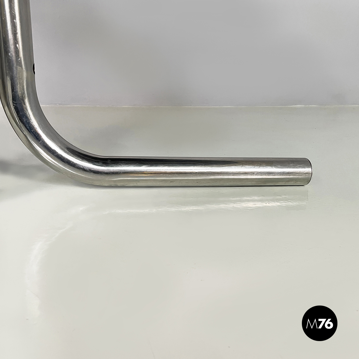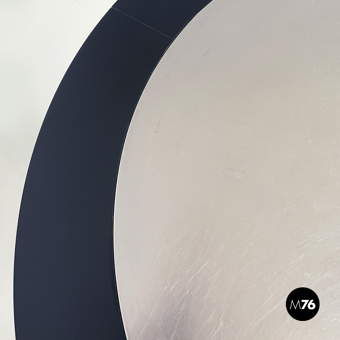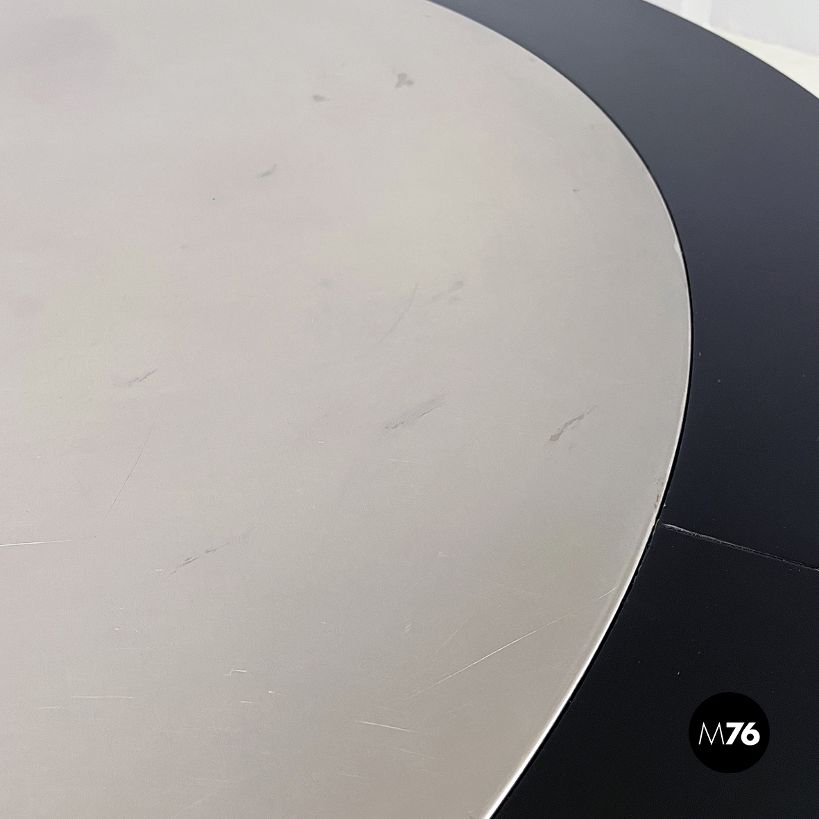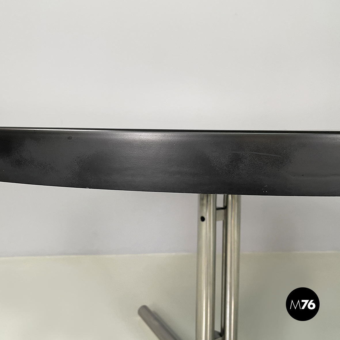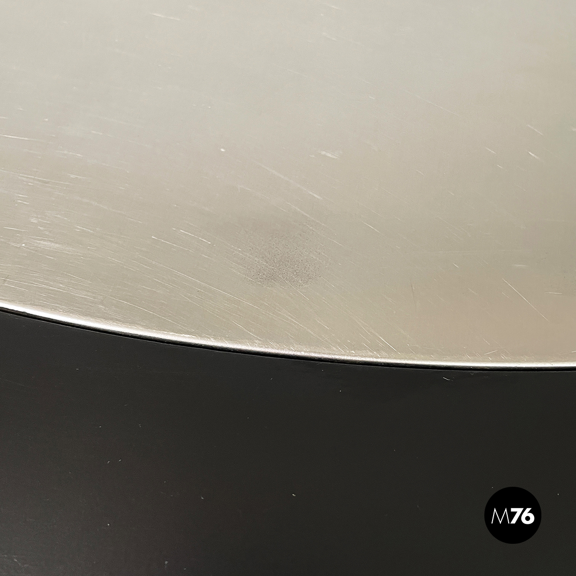 Tavolo da pranzo modello Desco con pianto rotondo in acciaio satinato con il profilo in plastica nera. La zampa a tre razze è in tubolare di metallo.