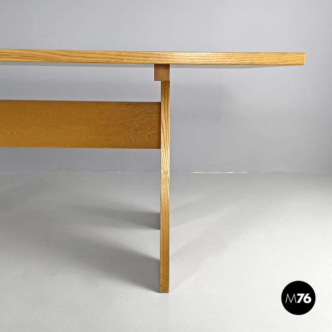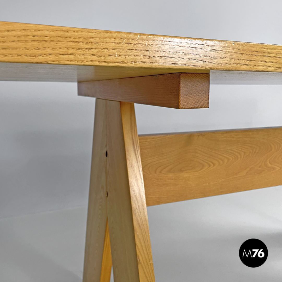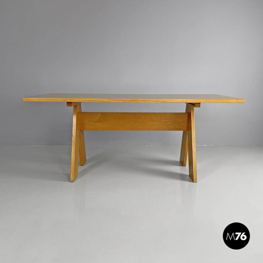 Tavolo da pranzo in legno con pian rettangolare. Le gambe sono composte da due listelli diagonali che si incontrano sotto il piano e si allargano all’appoggio a terra ricordando la forma di una “V”, e sono collegate da una trave.