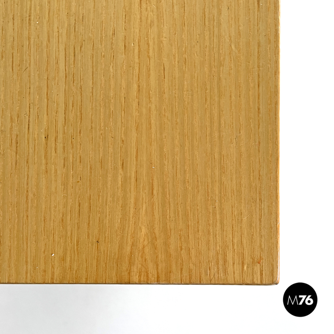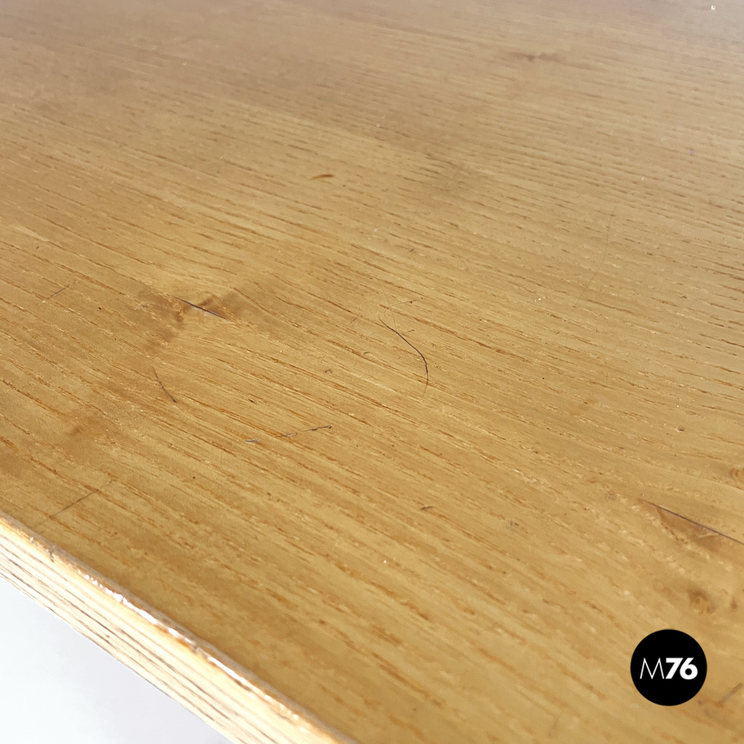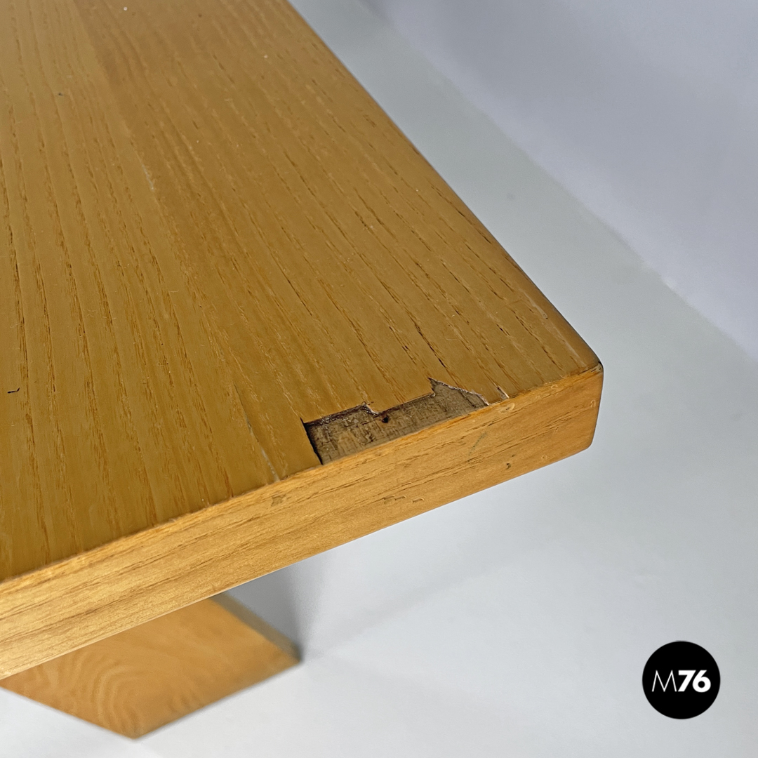 Tavolo da pranzo in legno con pian rettangolare. Le gambe sono composte da due listelli diagonali che si incontrano sotto il piano e si allargano all’appoggio a terra ricordando la forma di una “V”, e sono collegate da una trave.