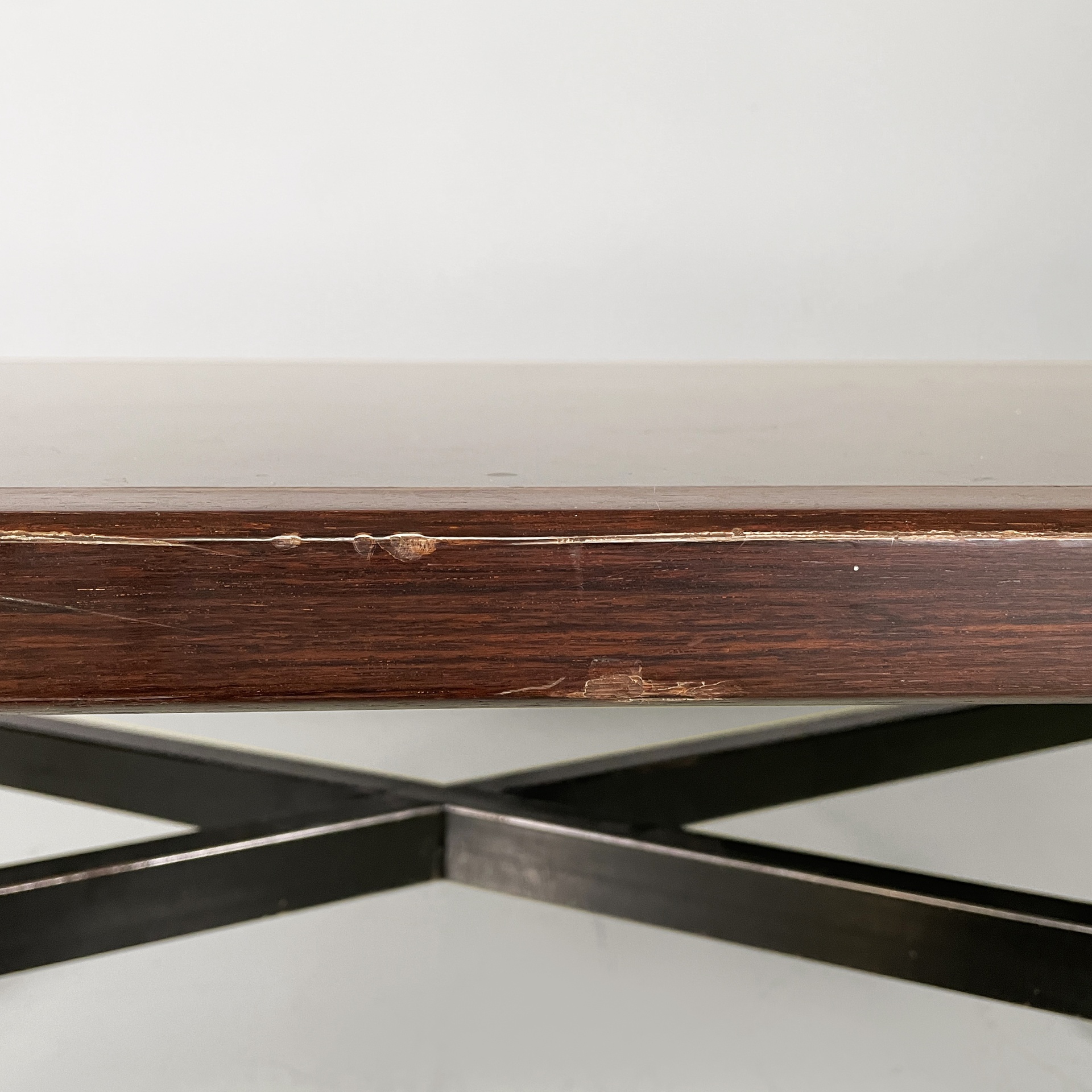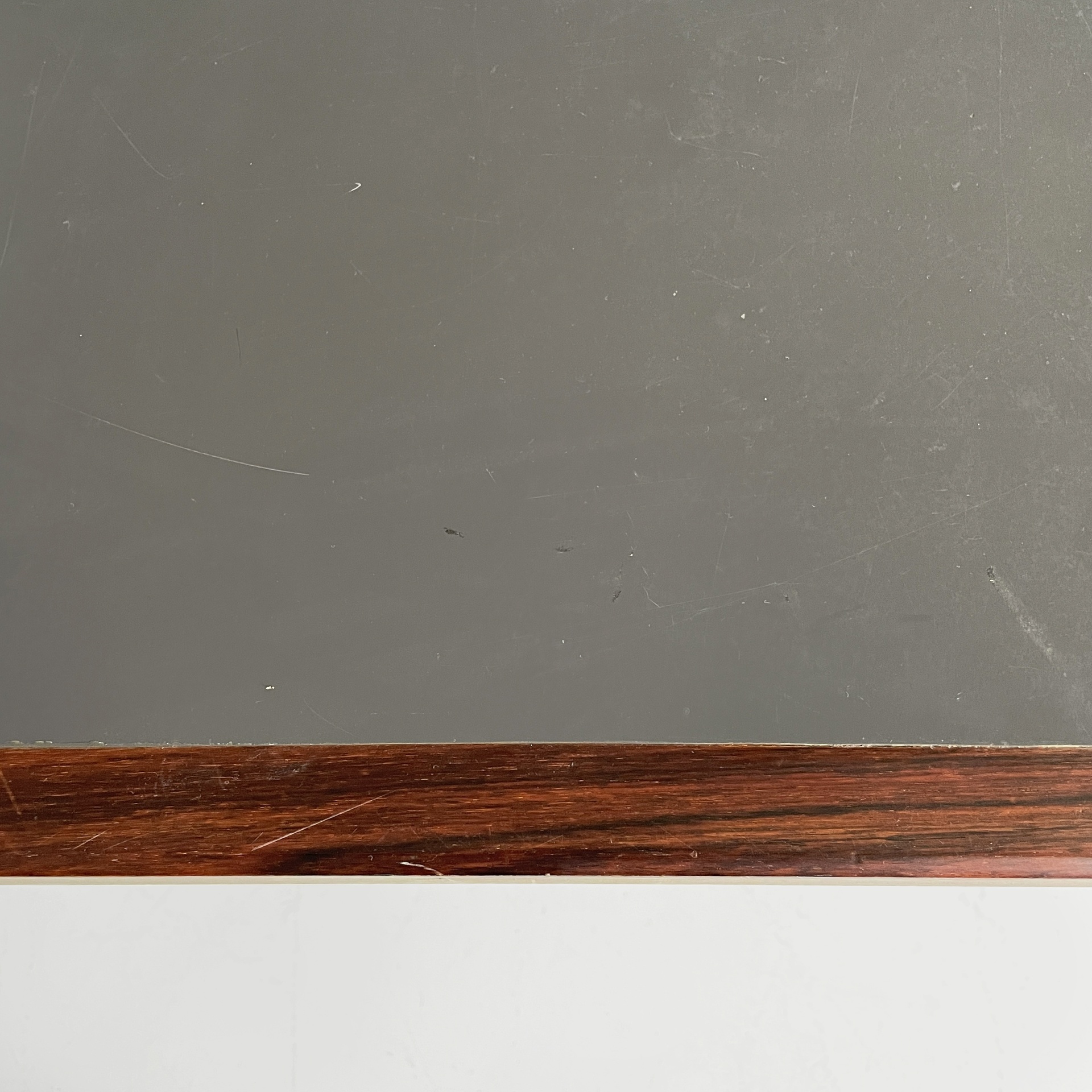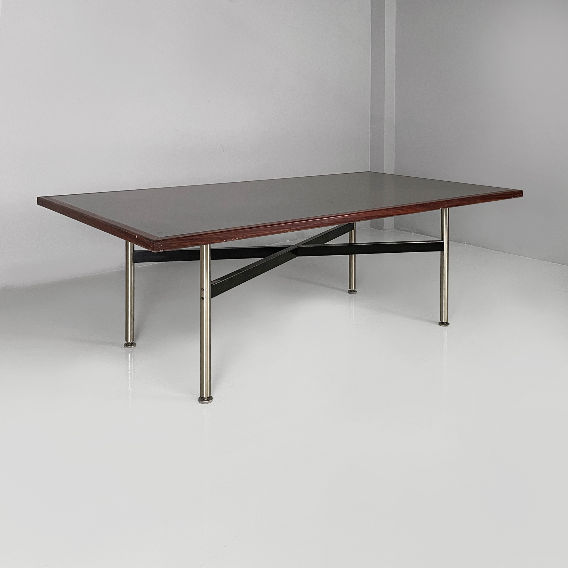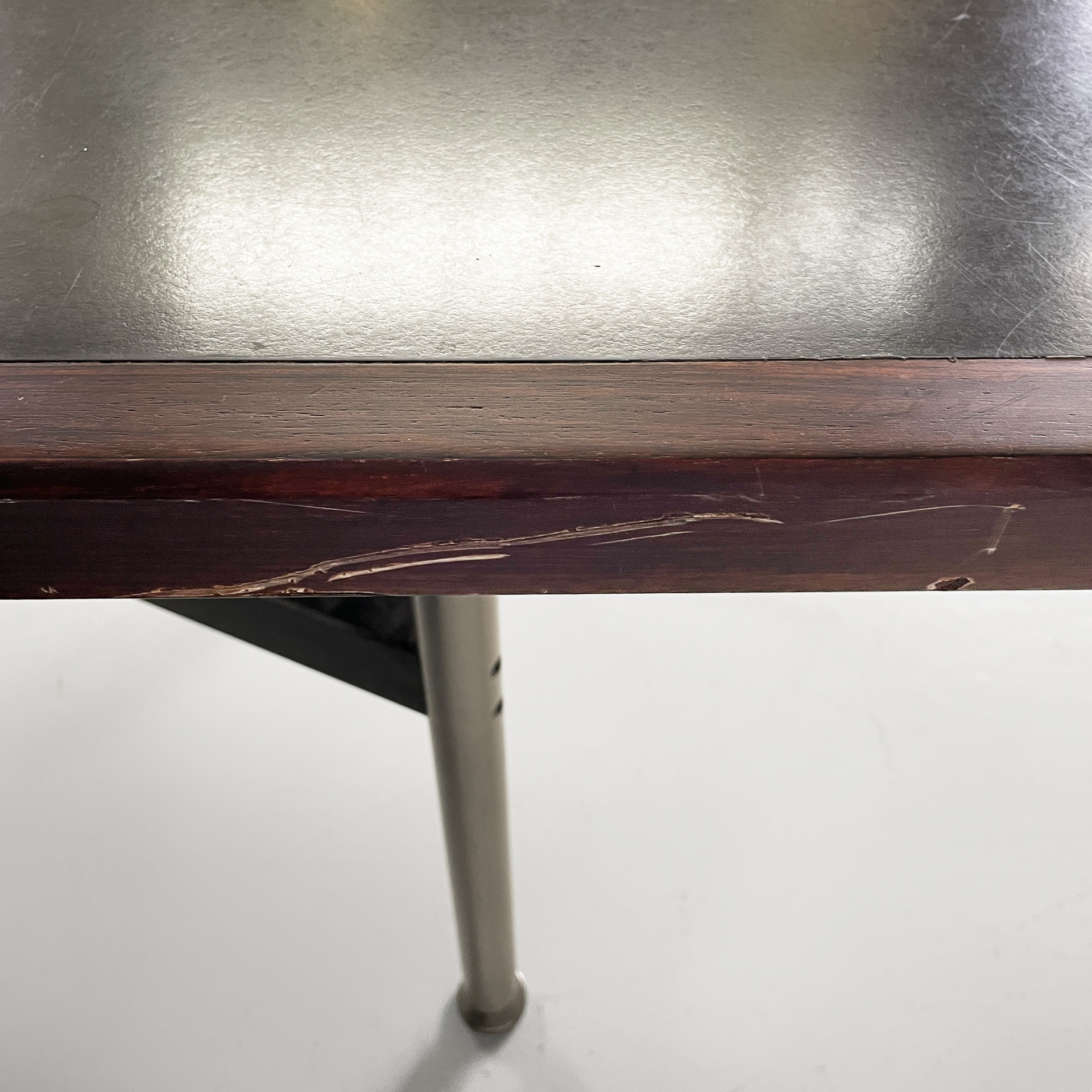 Tavolo da pranzo o scrivania con piano rettangolare in legno con finitura in formica blu-grigio. Le zampe a sezione tonda in acciaio sono unite da dei listelli in metallo verniciato nero. Piedini tondi. L’altezza del tavolo è regolabile grazie ai piedini rialzabili.