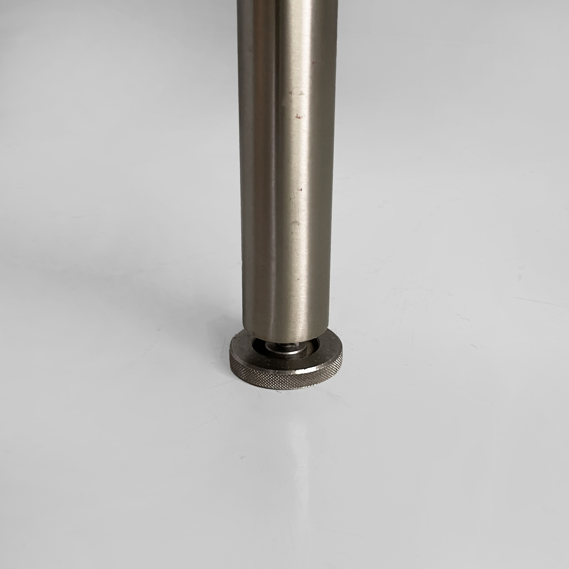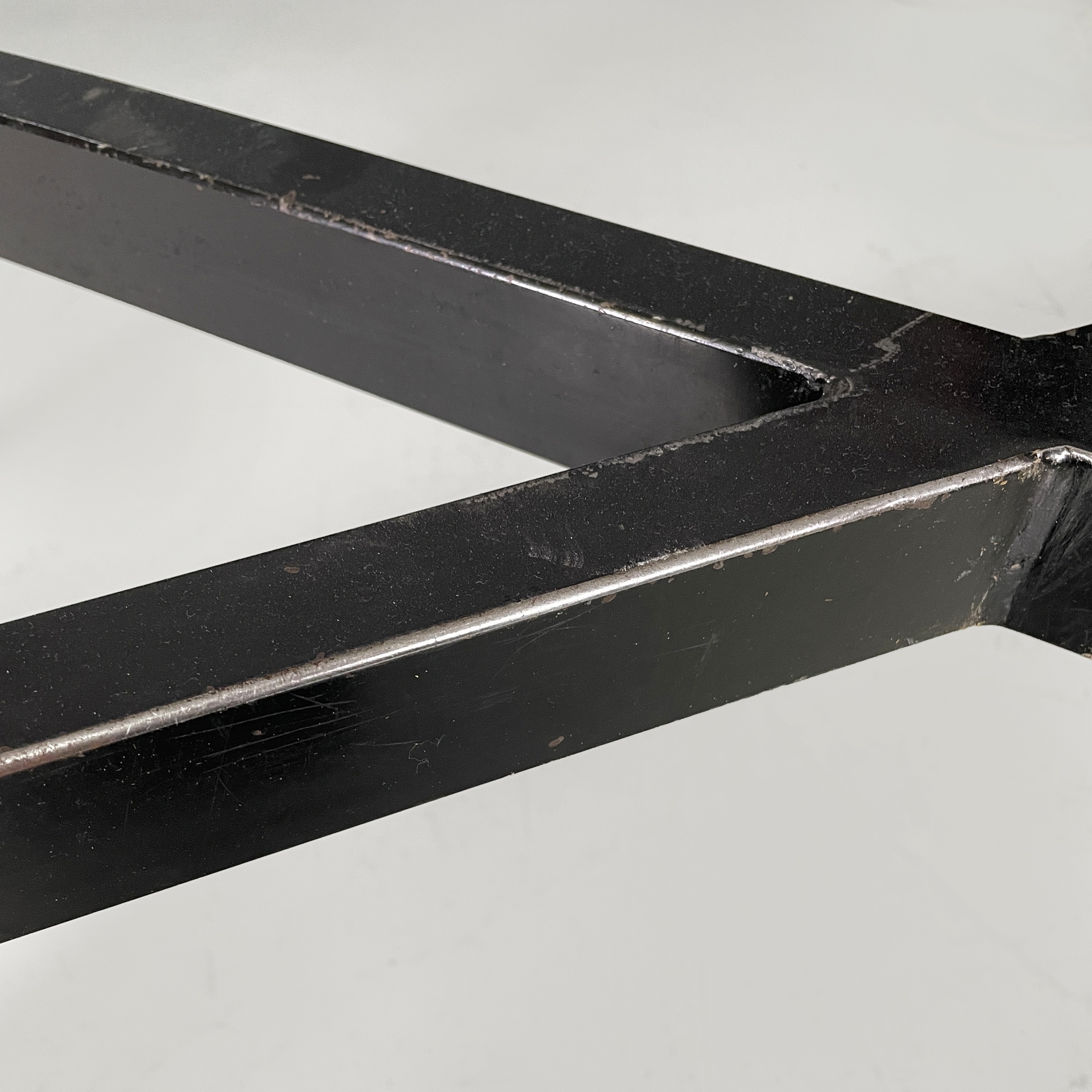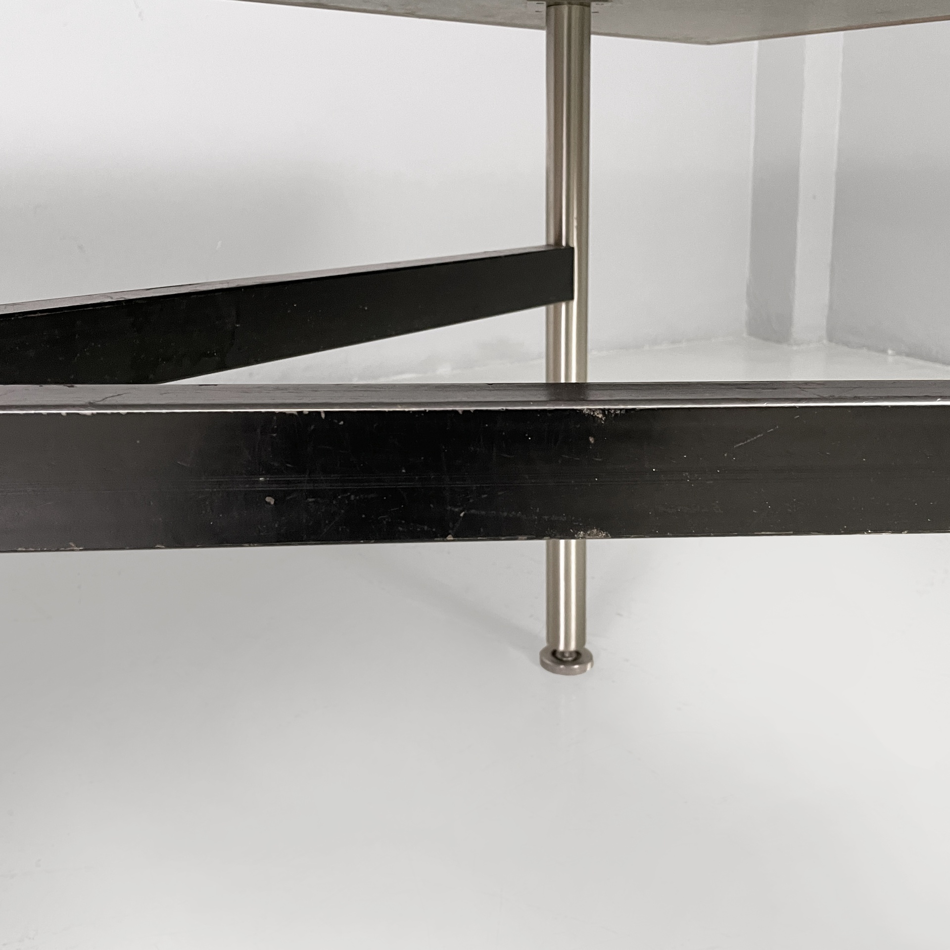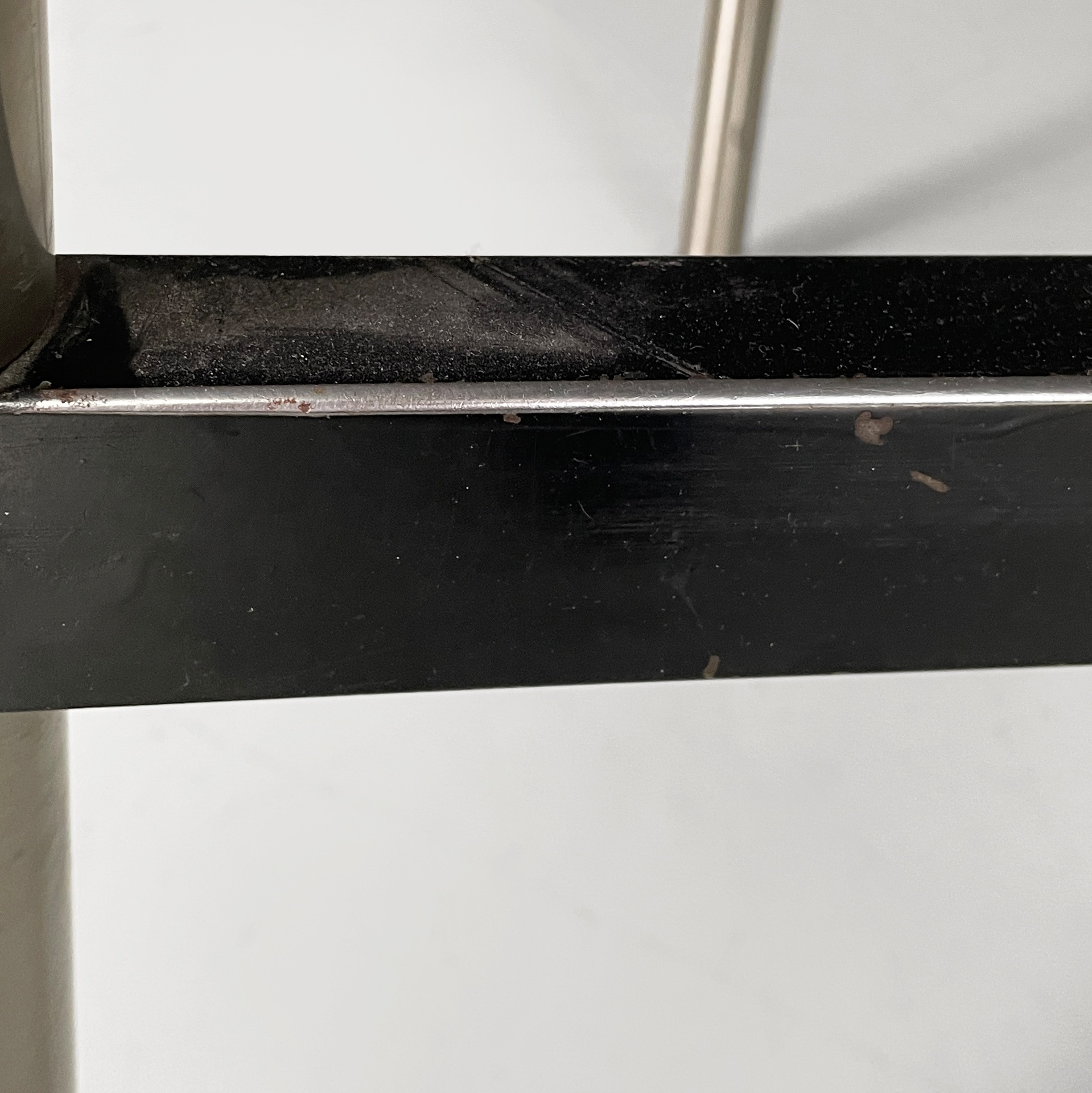 Tavolo da pranzo o scrivania con piano rettangolare in legno con finitura in formica blu-grigio. Le zampe a sezione tonda in acciaio sono unite da dei listelli in metallo verniciato nero. Piedini tondi. L’altezza del tavolo è regolabile grazie ai piedini rialzabili.