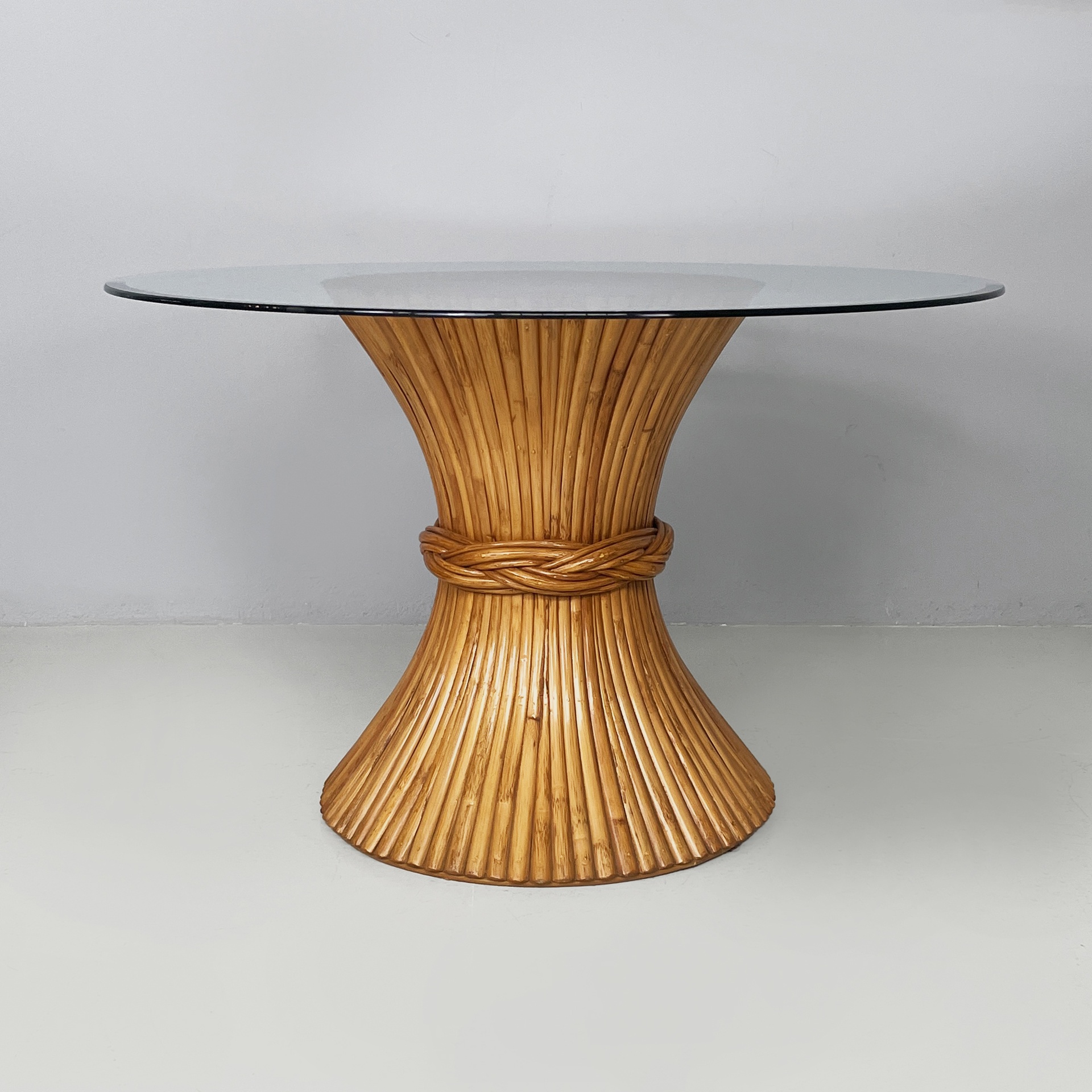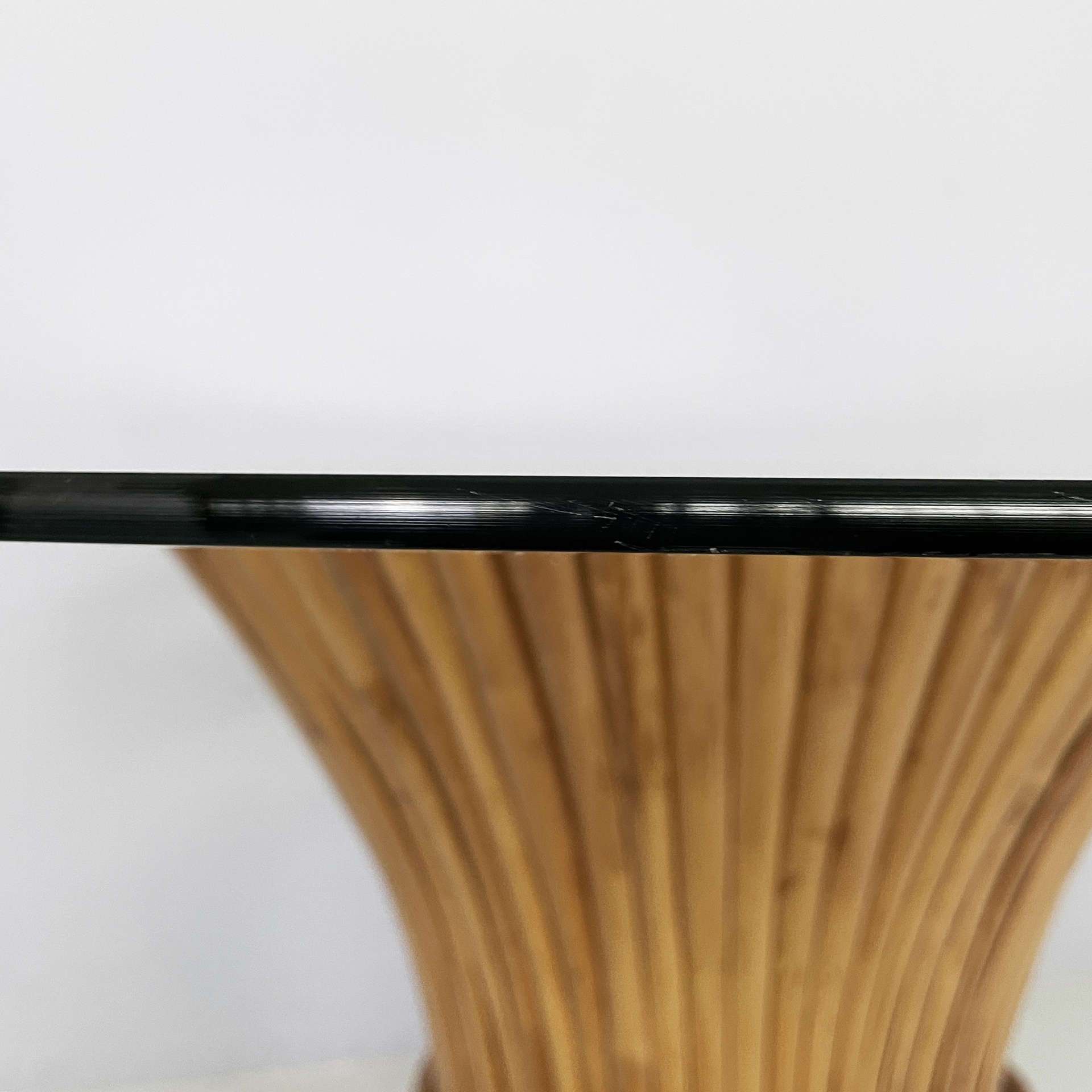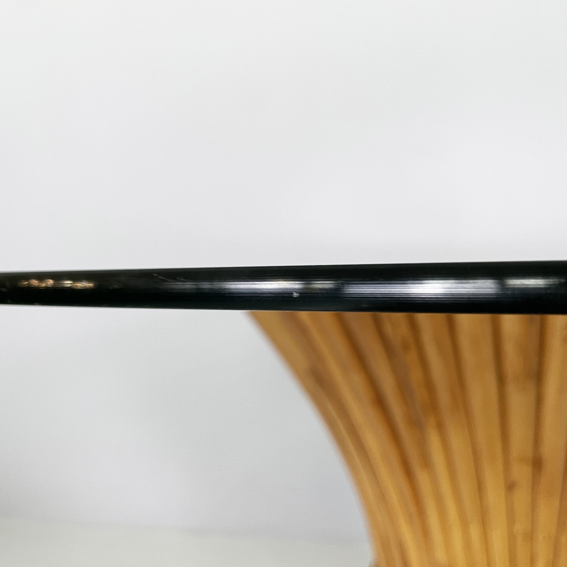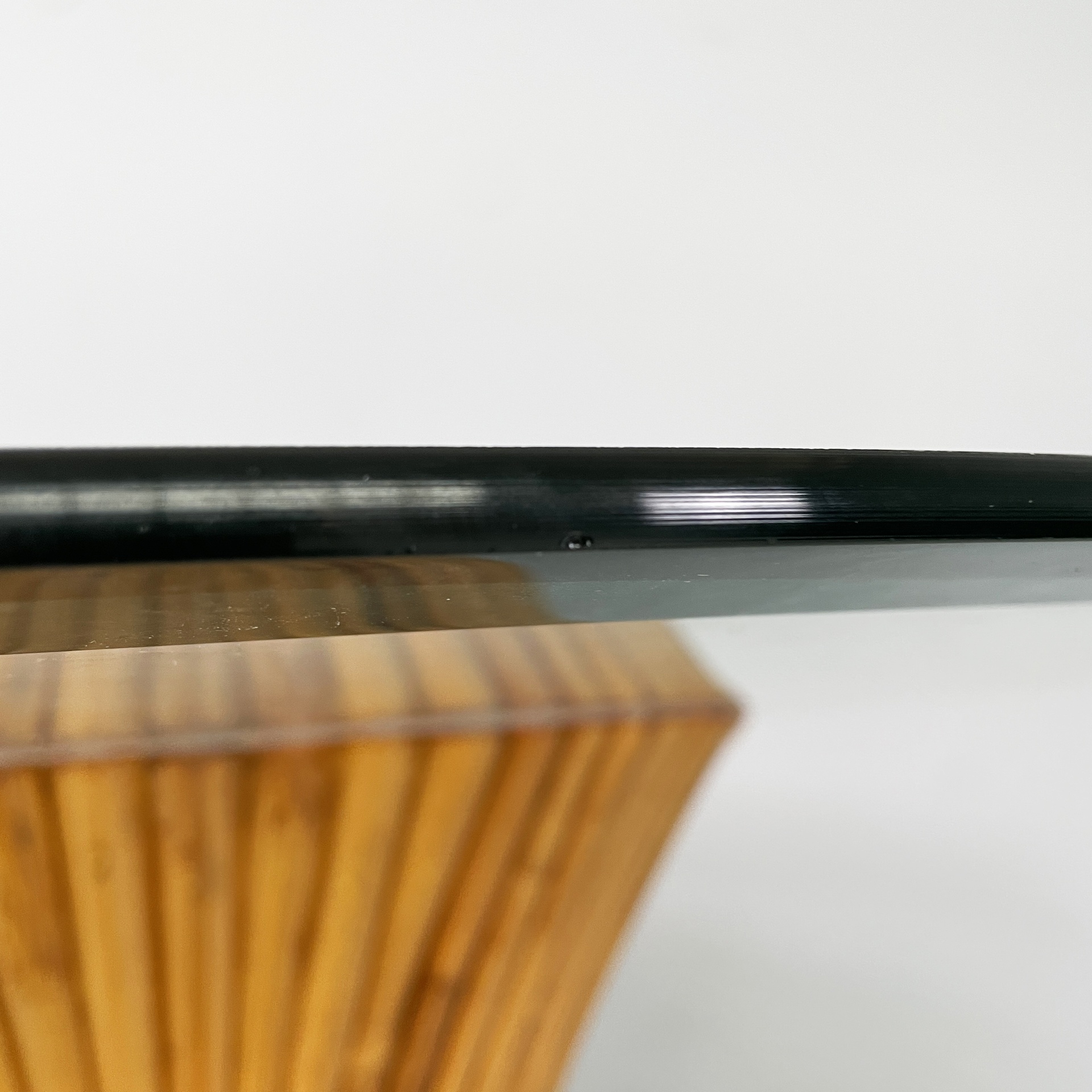 Tavolo da pranzo con piano tondo in vetro bisellato. La base in bambù si stringe al centro e si allarga ai lati. Al centro presenta del bambù intrecciato decorativo.