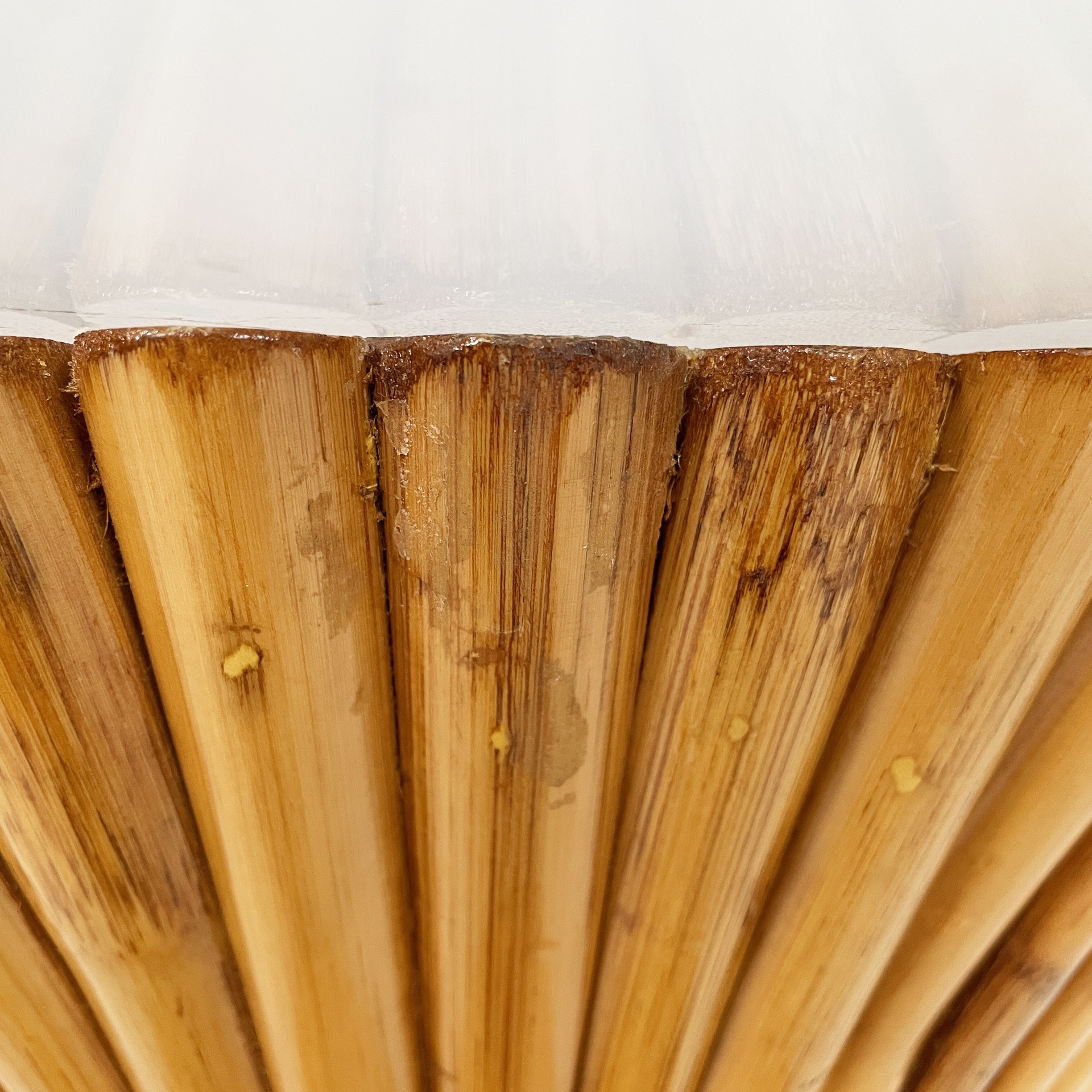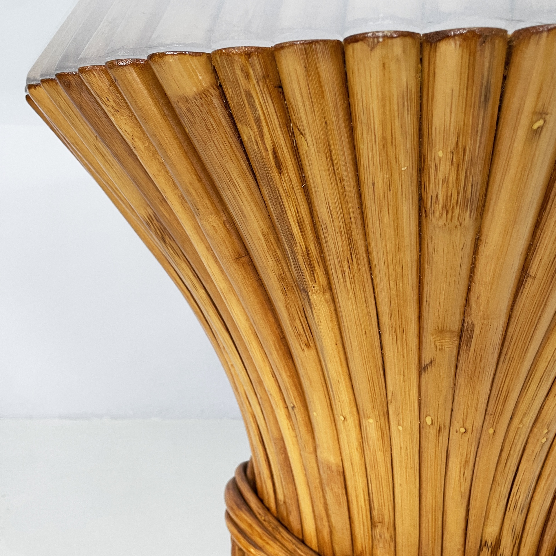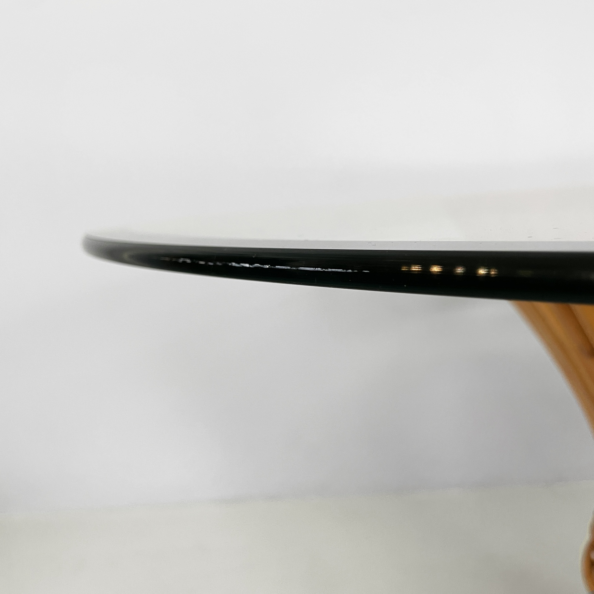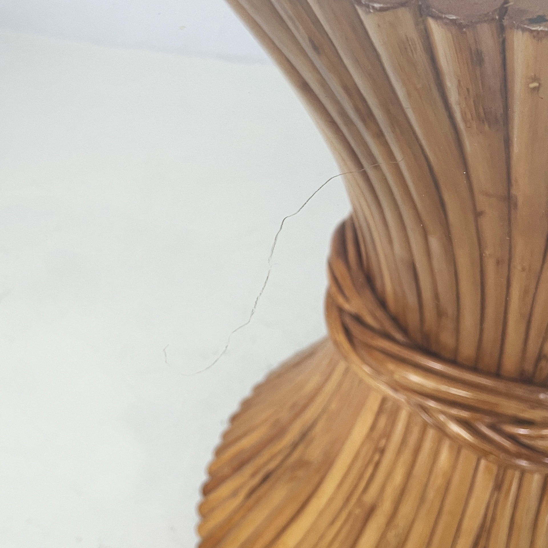 Tavolo da pranzo con piano tondo in vetro bisellato. La base in bambù si stringe al centro e si allarga ai lati. Al centro presenta del bambù intrecciato decorativo.