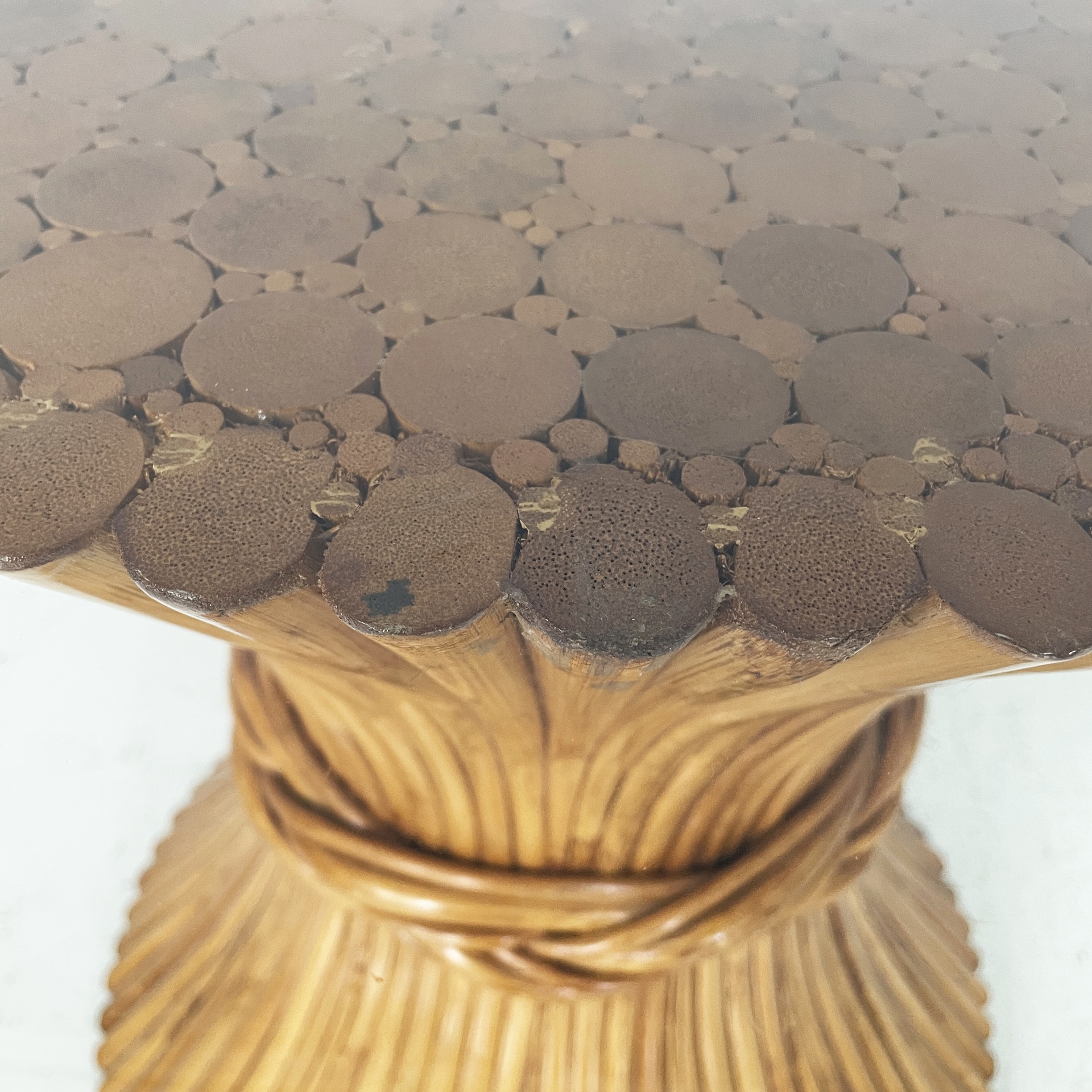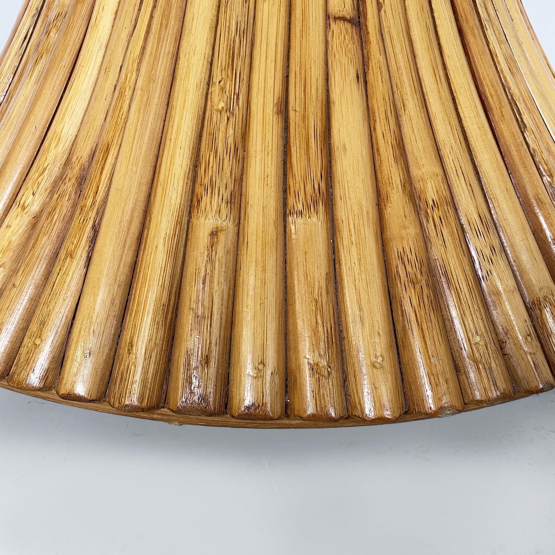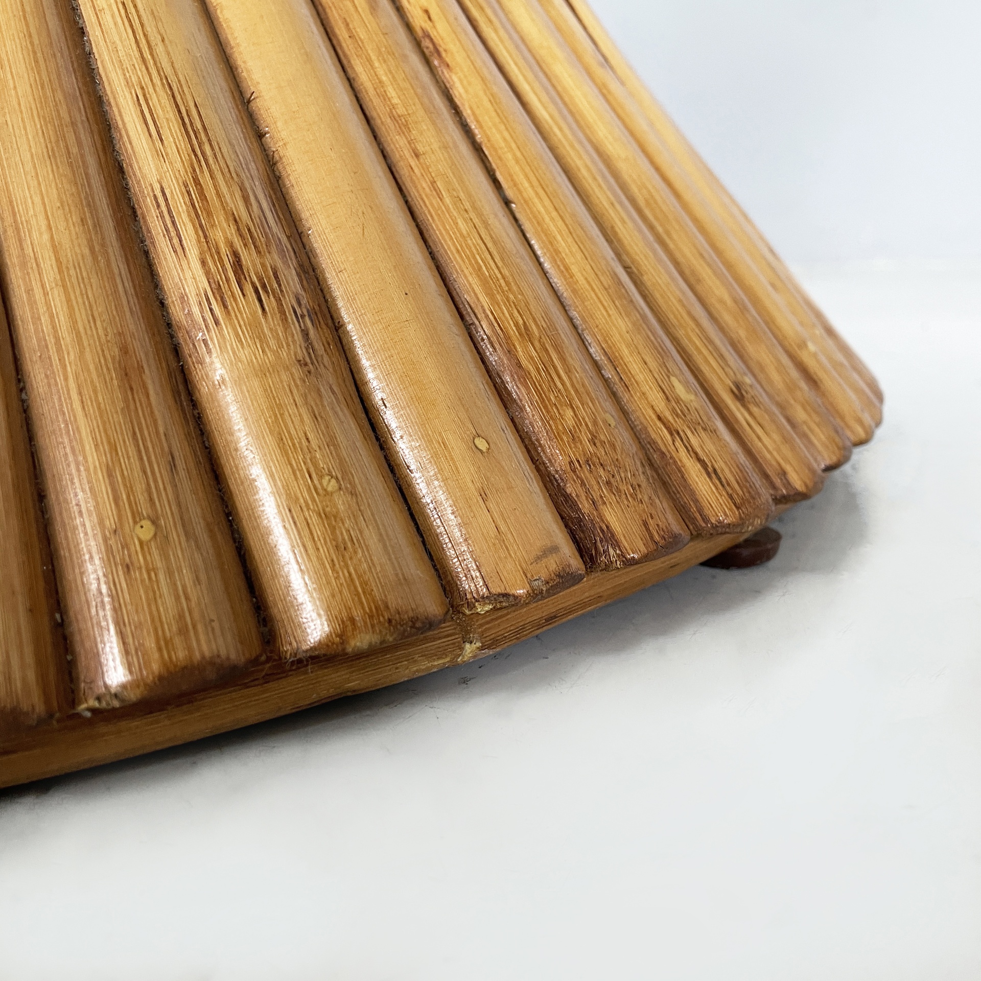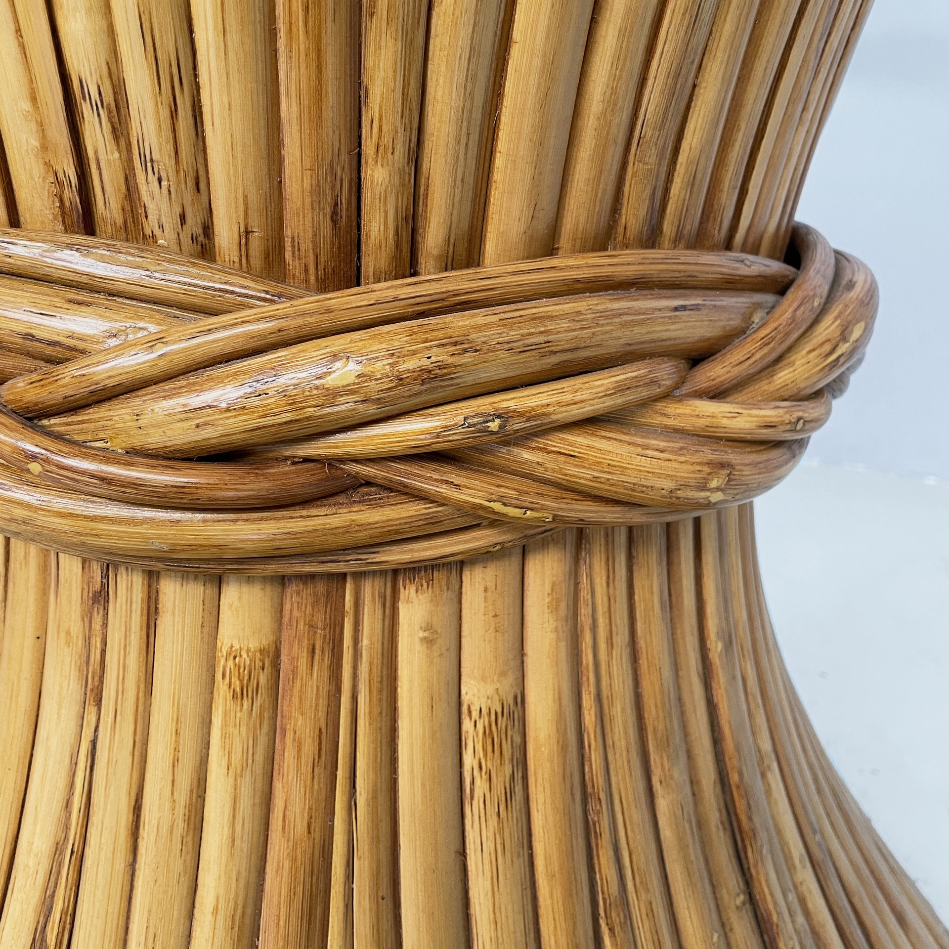Tavolo da pranzo con piano tondo in vetro bisellato. La base in bambù si stringe al centro e si allarga ai lati. Al centro presenta del bambù intrecciato decorativo.