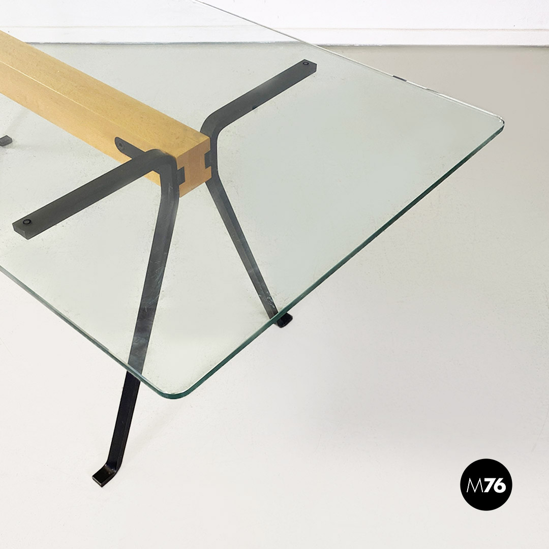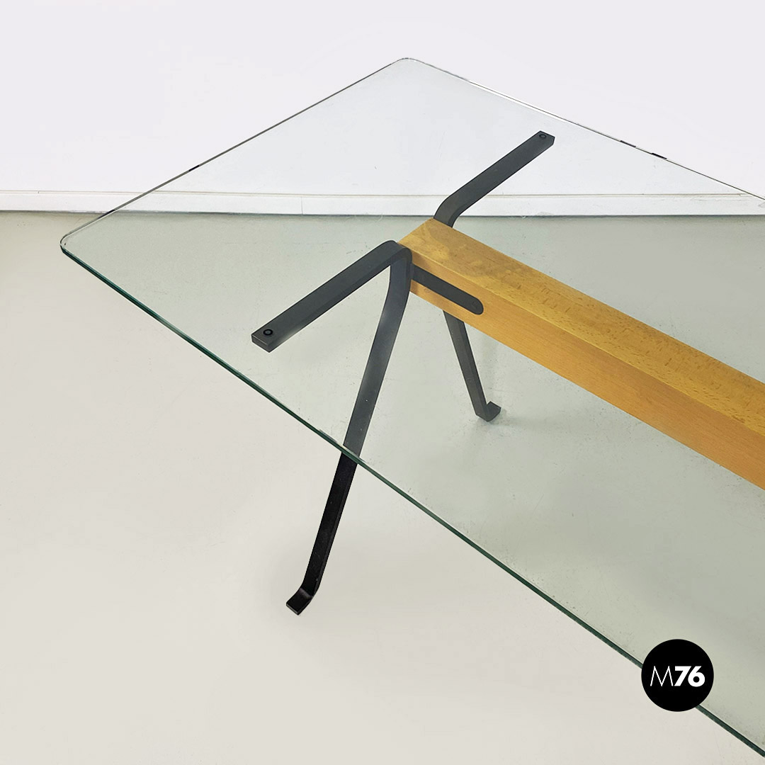 Tavolo da pranzo o scrivania modello Frate con piano rettangolare in vetro temperato ad angoli stondati. Struttura composta da una trave in legno massello con colorazione chiara a sezione quadrata, a cui sono avvitate quattro zampe in ghisa con finitura opaca antracite.