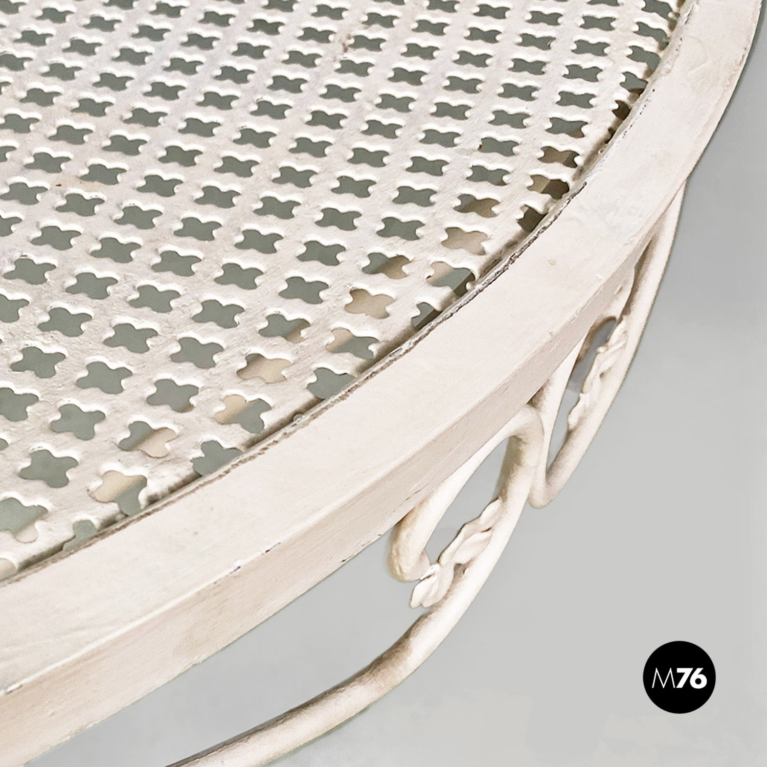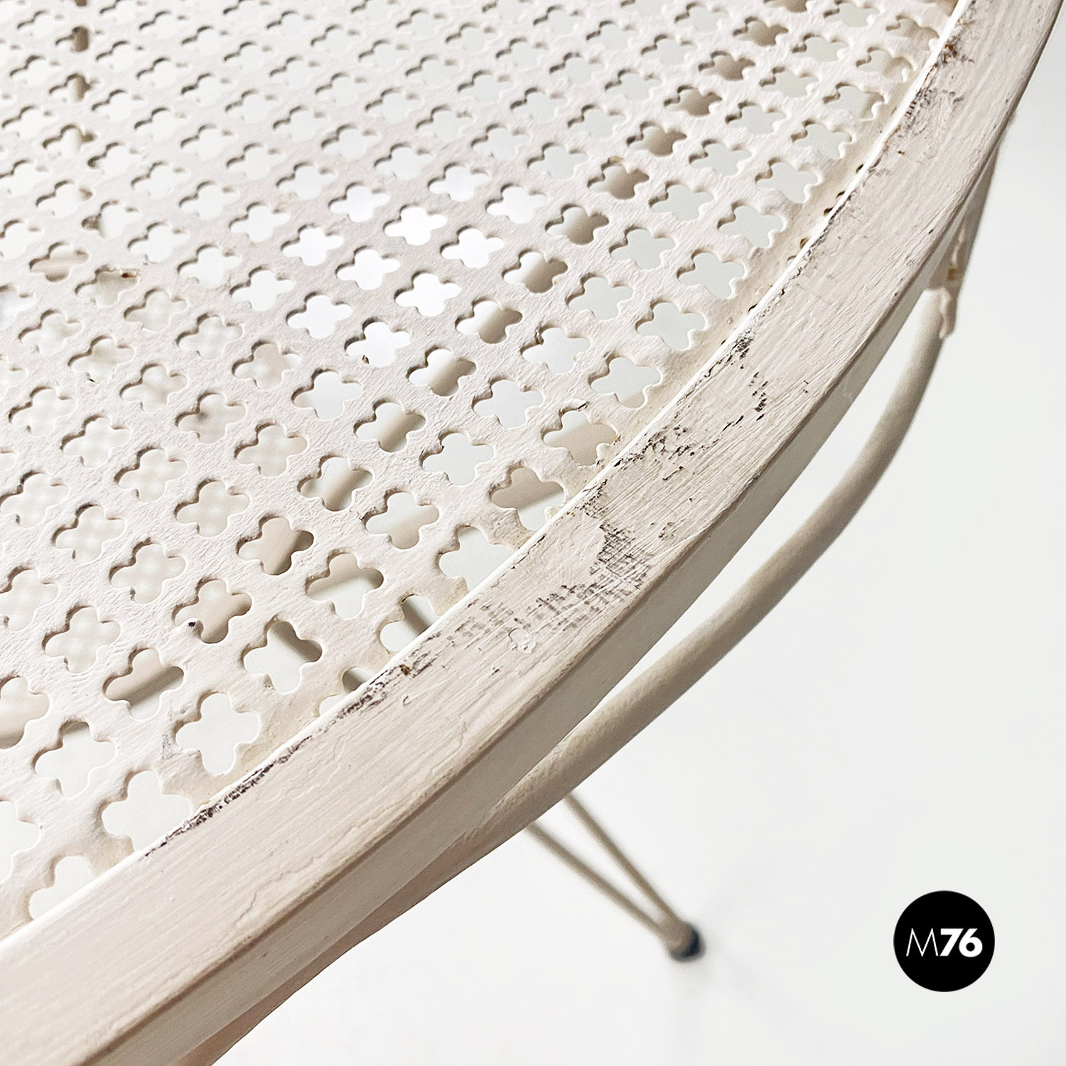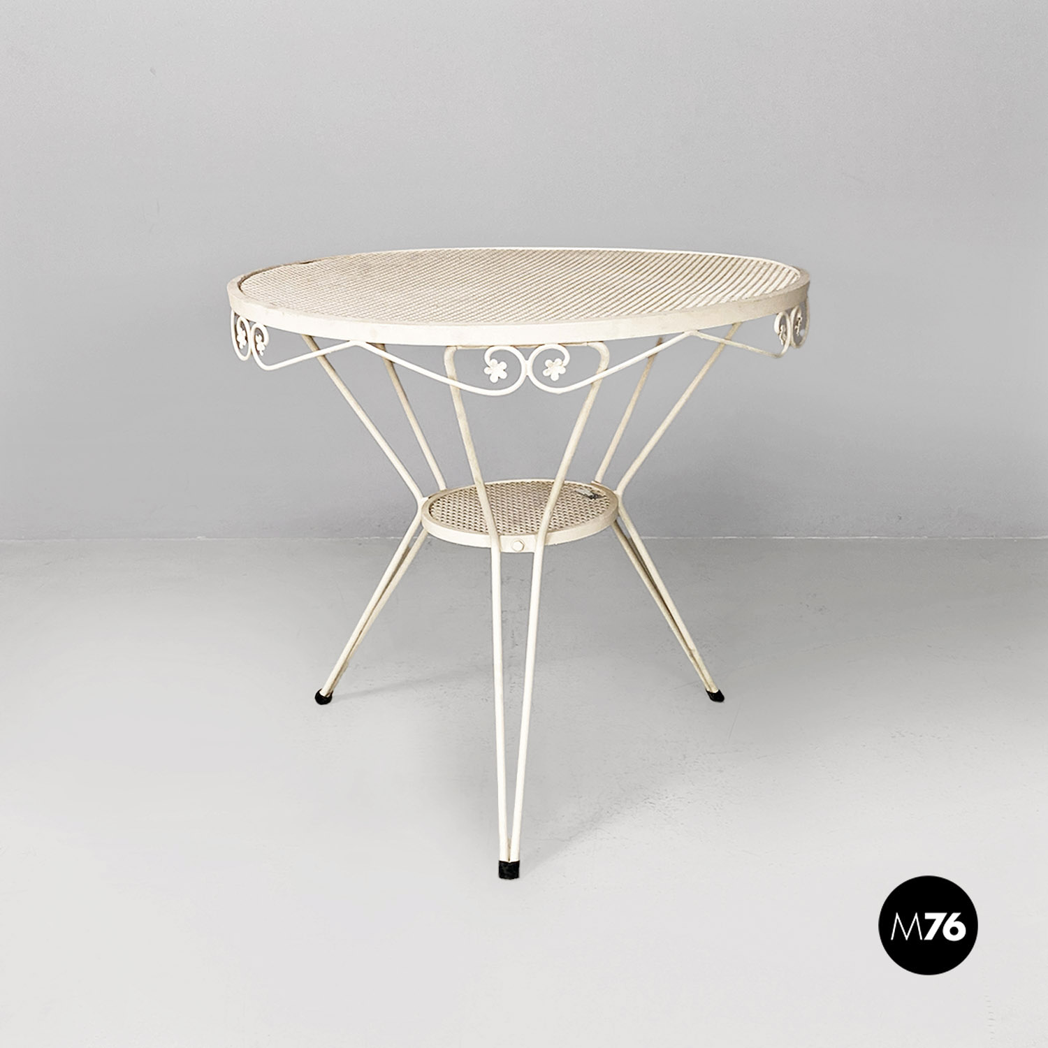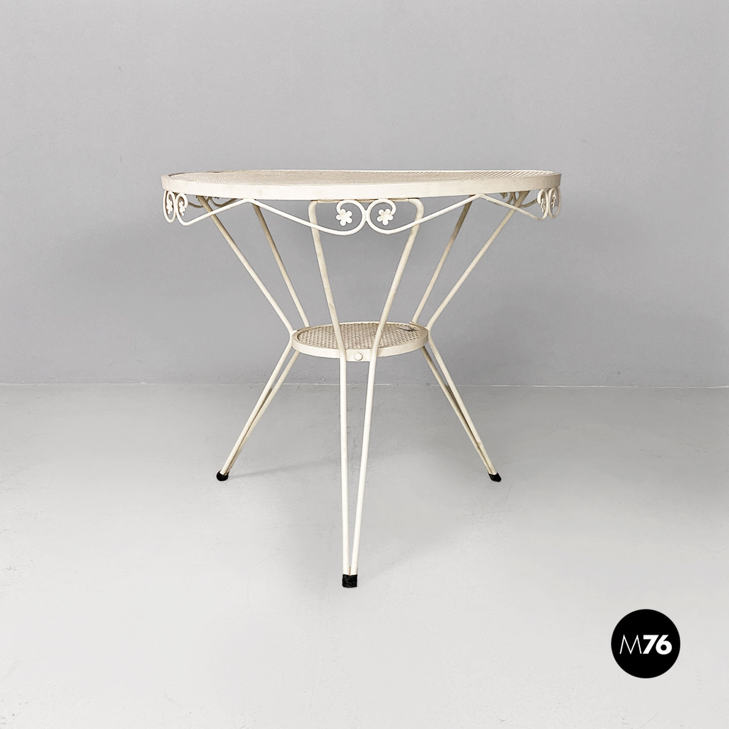 Tavolo da pranzo in ferro verniciato bianco con piano tondo traforato. Il bordo del piano è finemente lavorate con decorazioni floreali e riccioli. Sotto il piano principale è presente un secondo piano tondo e traforato di dimensione minore, da cui partono le tre gambe in tubolare. Utilizzabile anche in ambiente esterno come un giardino o un terrazzo.