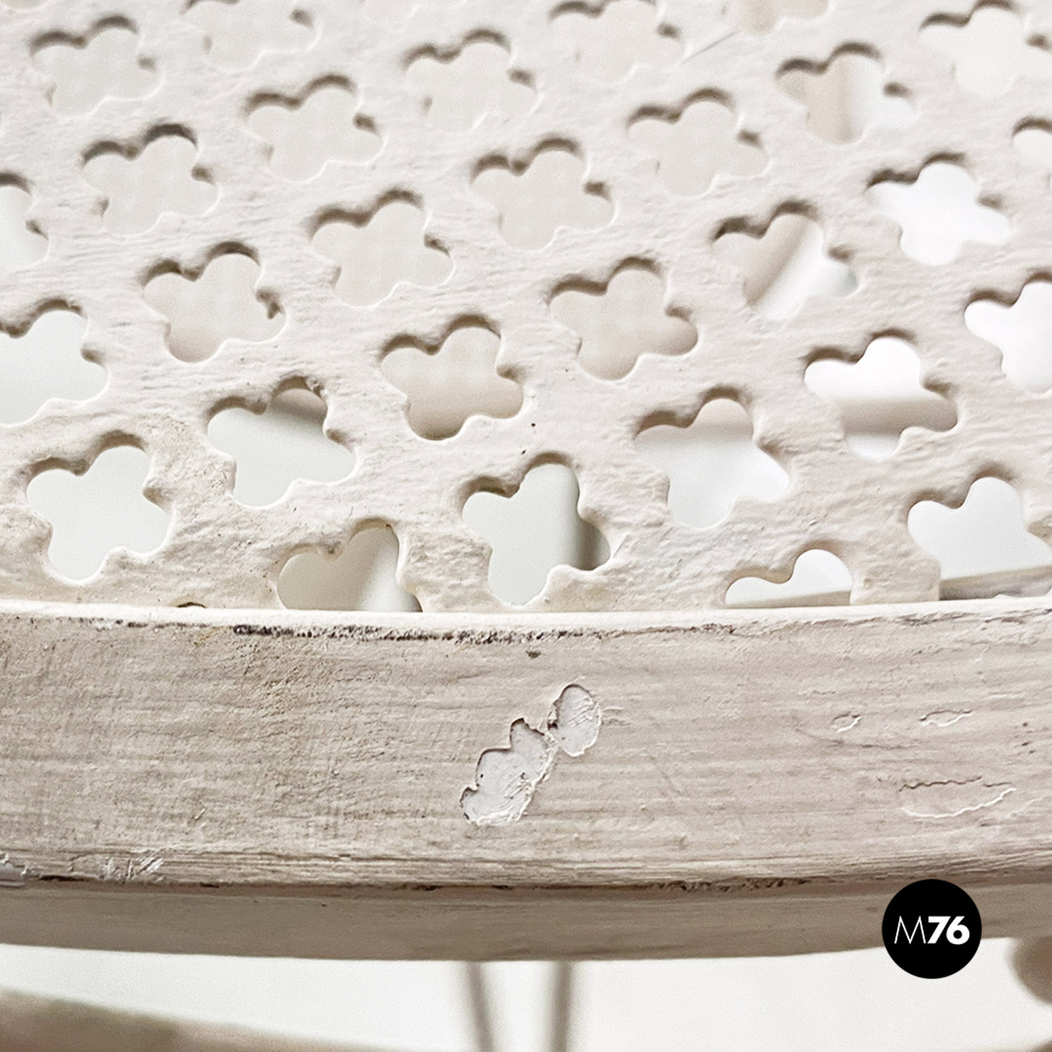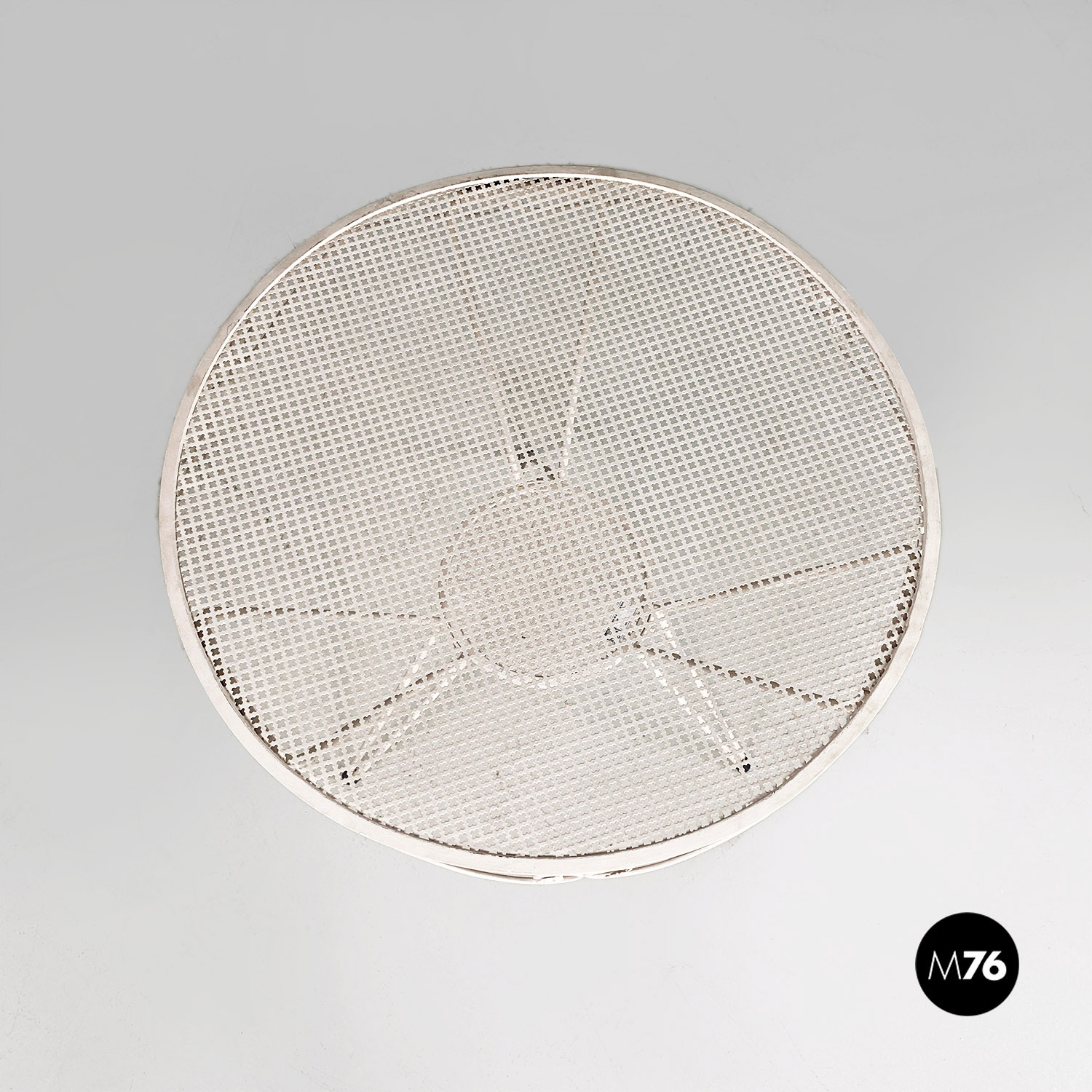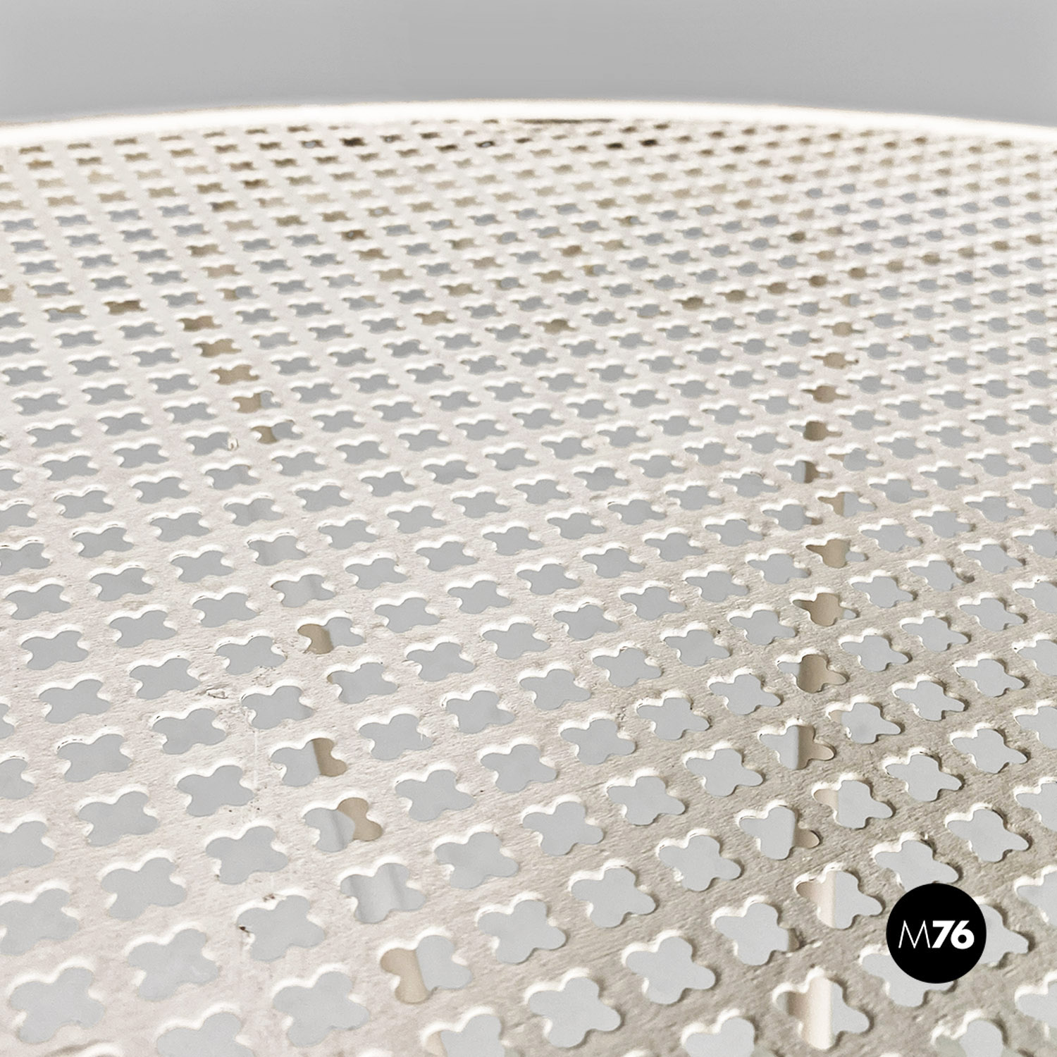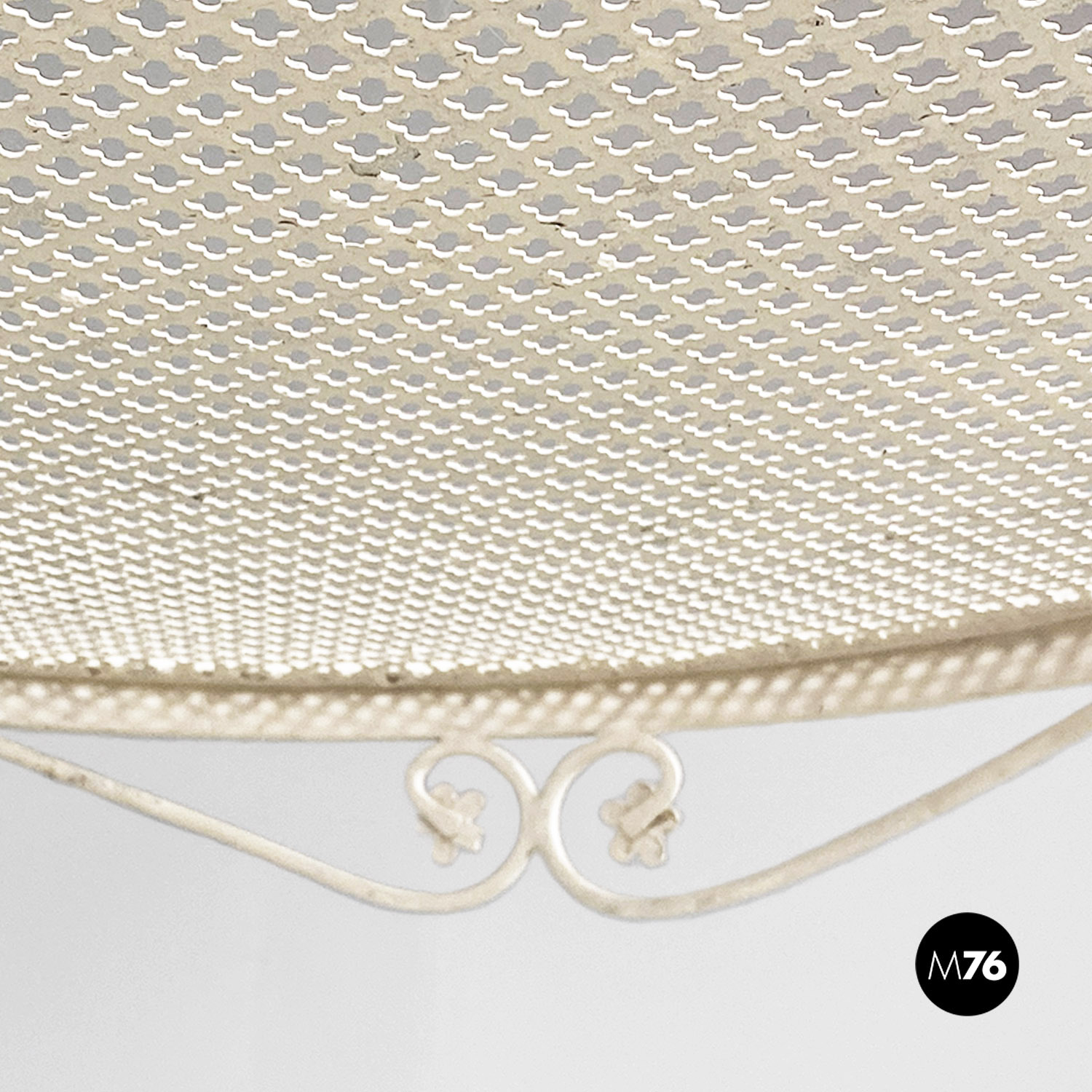 Tavolo da pranzo in ferro verniciato bianco con piano tondo traforato. Il bordo del piano è finemente lavorate con decorazioni floreali e riccioli. Sotto il piano principale è presente un secondo piano tondo e traforato di dimensione minore, da cui partono le tre gambe in tubolare. Utilizzabile anche in ambiente esterno come un giardino o un terrazzo.