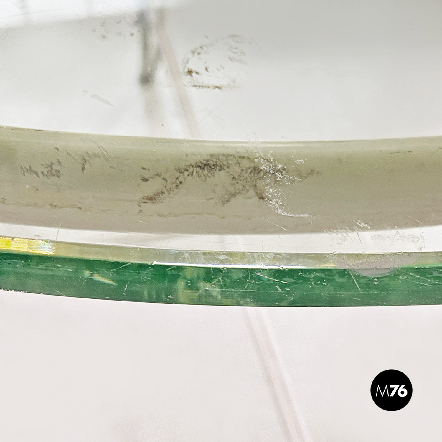 Buone condizioni, sono presenti segni del tempo sul metallo del tavolo e ossidazioni. Il piano in vetro presenta lievi graffi e una sbeccatura.