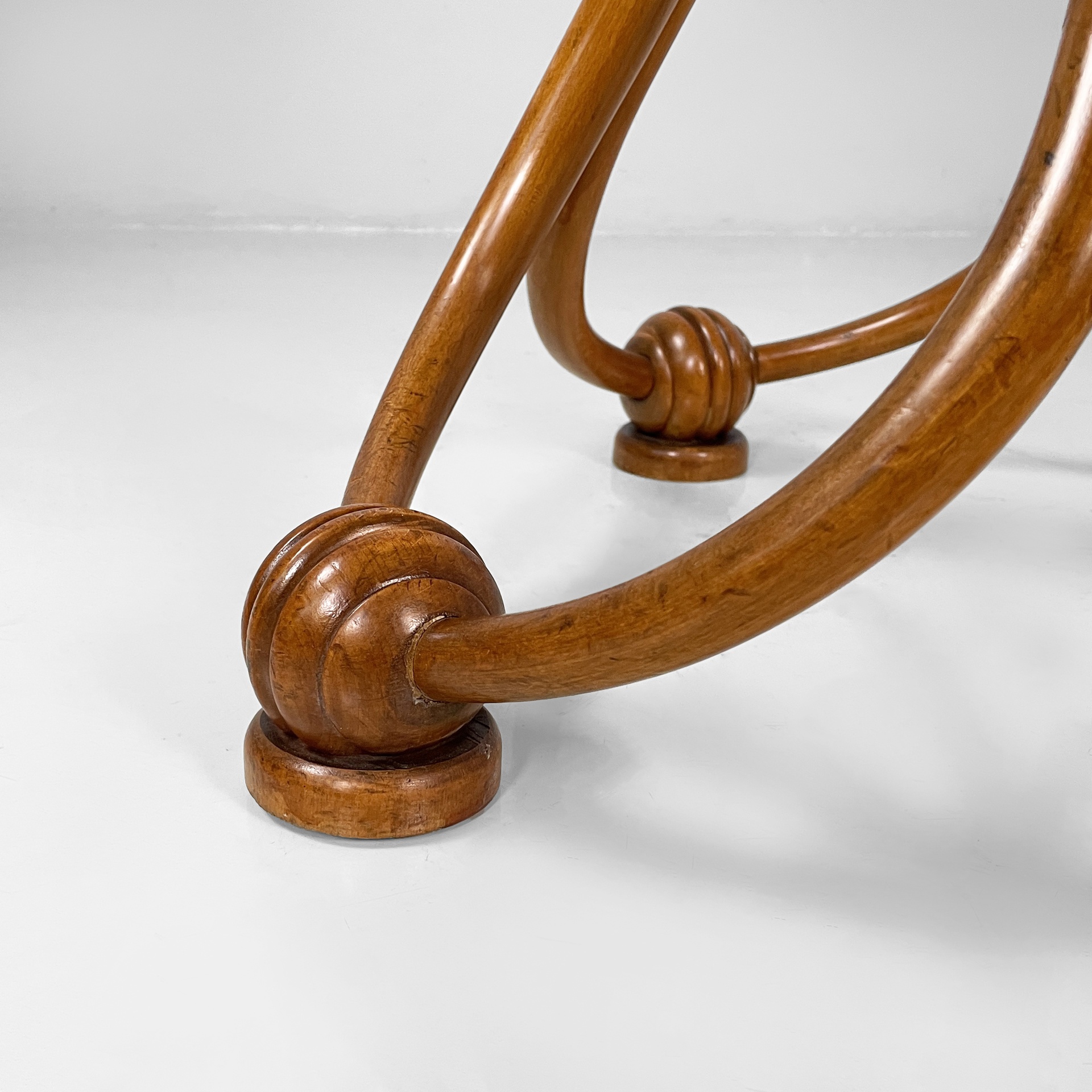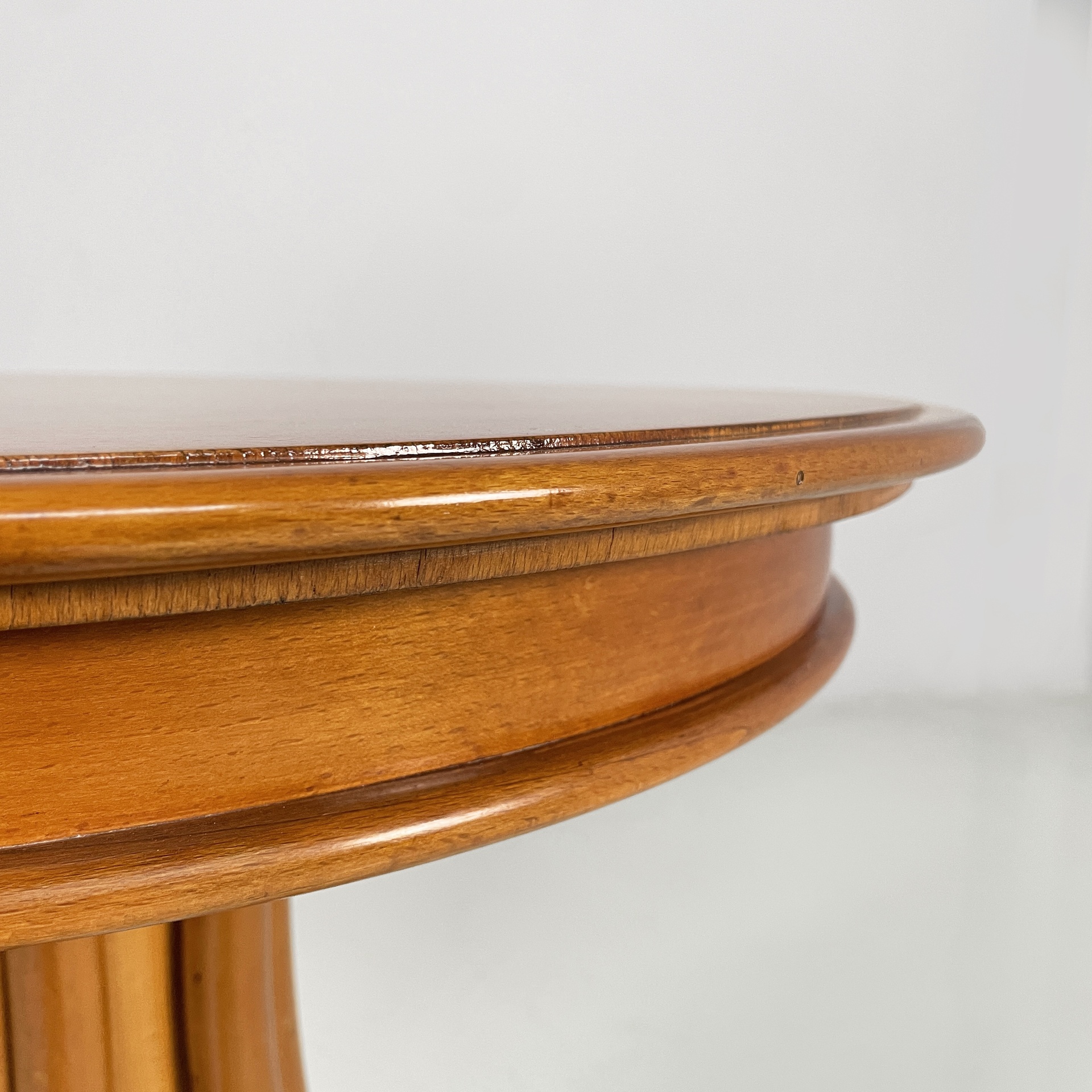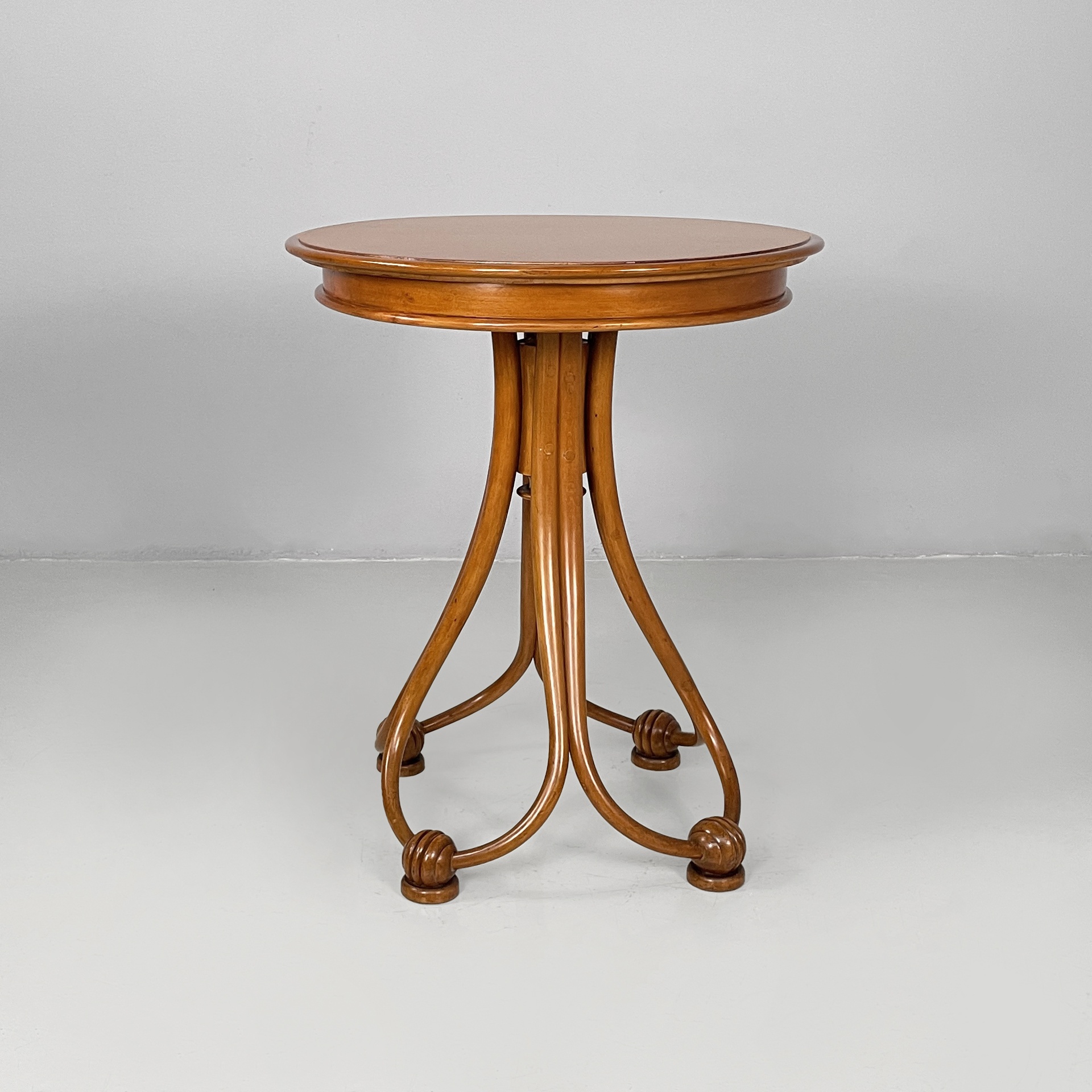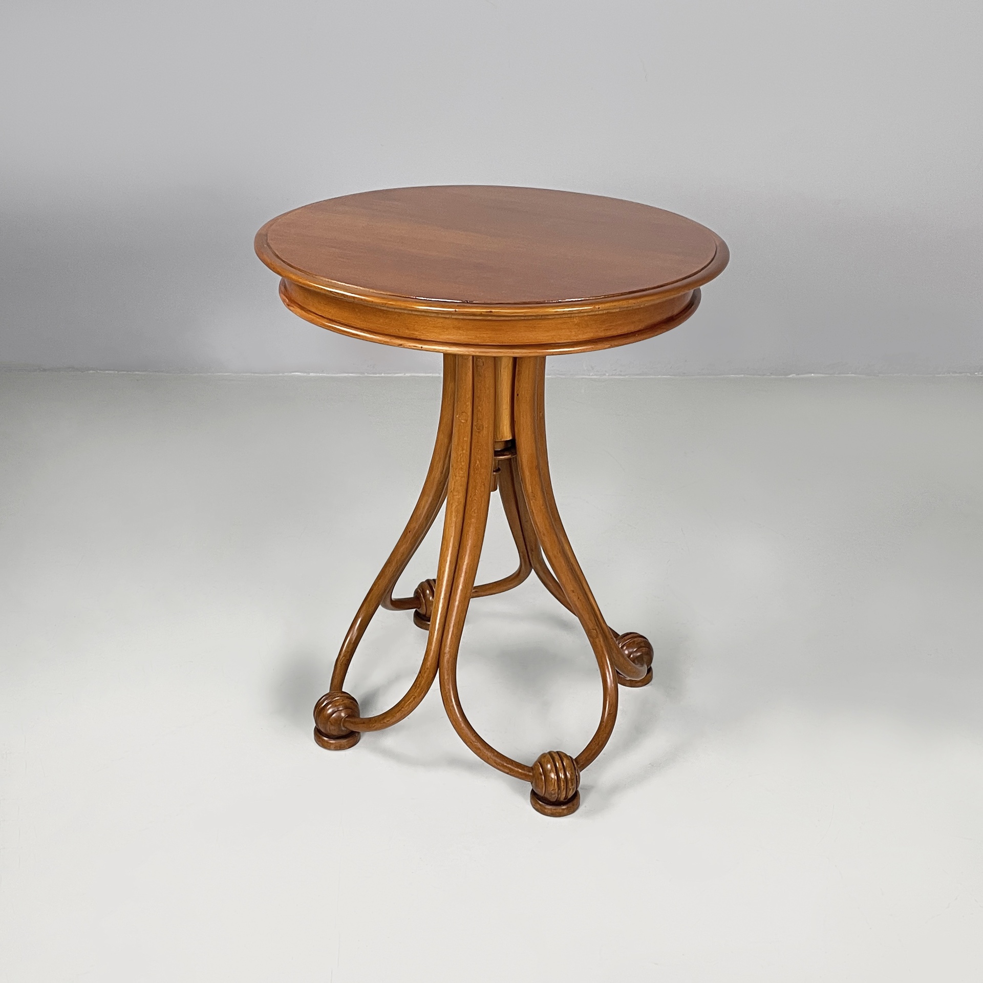 Tavolo da pranzo con piano tondo, interamente in legno. Le zampe sono composta da quattro listelli curvati con piedini sferici e scanalature decorative. Liberty/Art Nouveau