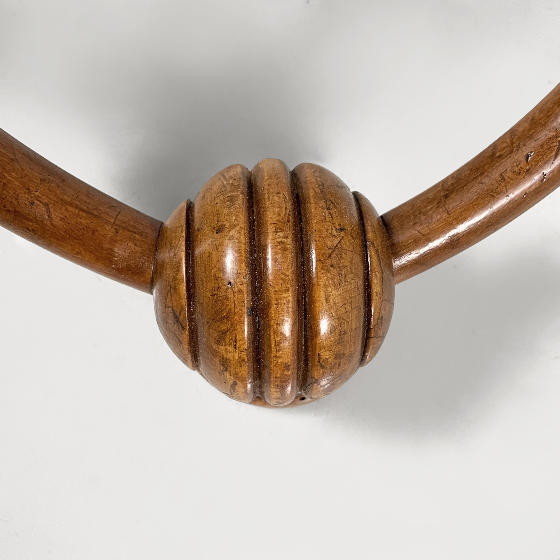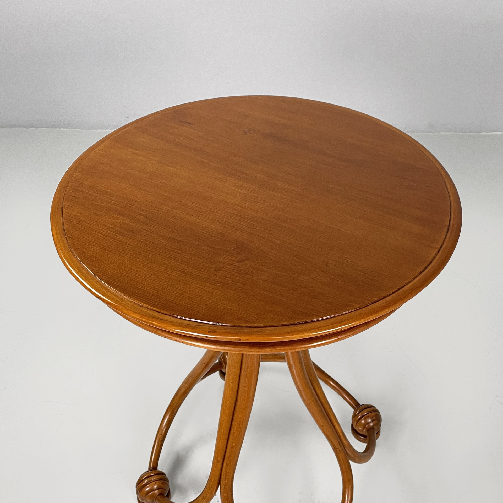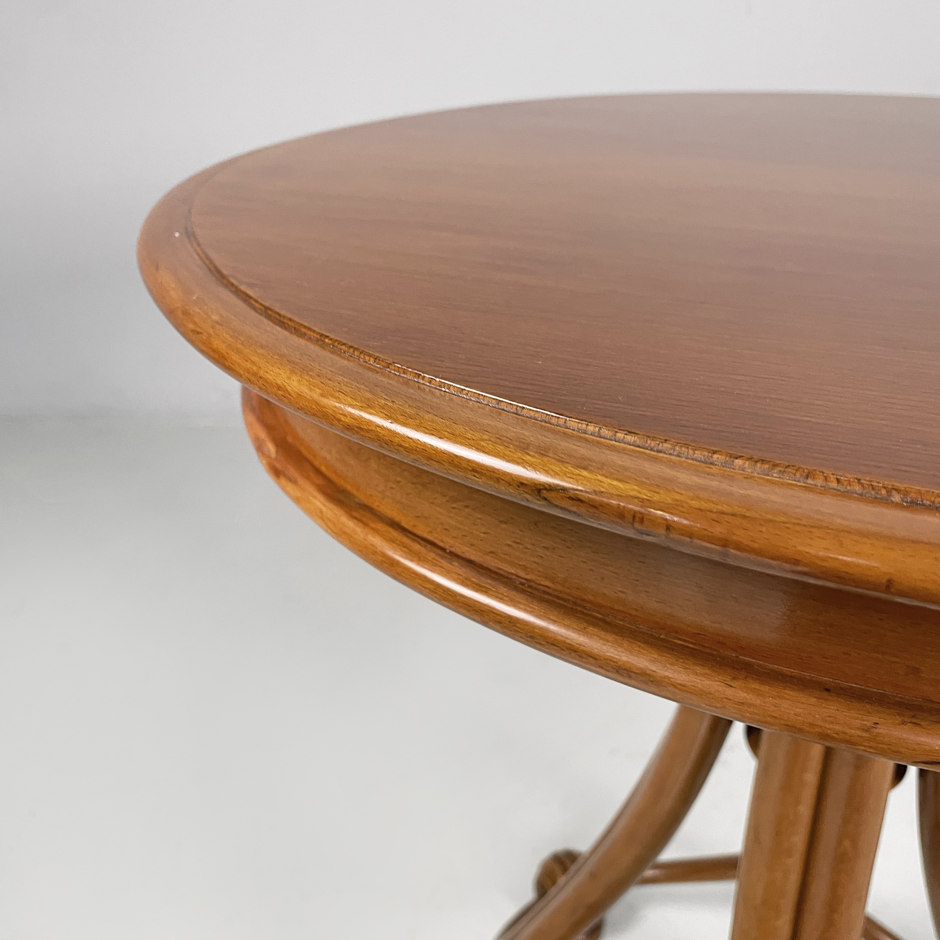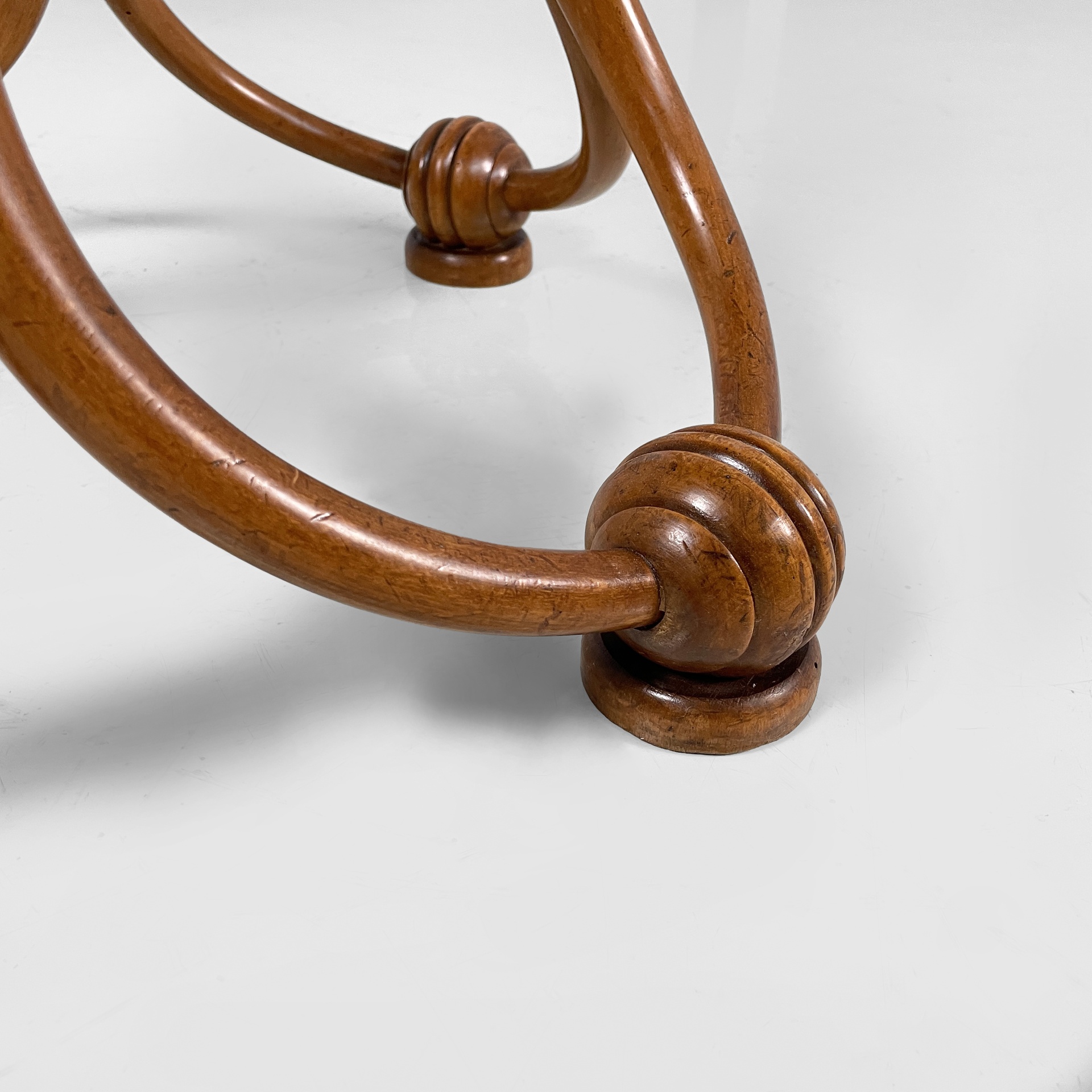 Tavolo da pranzo con piano tondo, interamente in legno. Le zampe sono composta da quattro listelli curvati con piedini sferici e scanalature decorative. Liberty/Art Nouveau