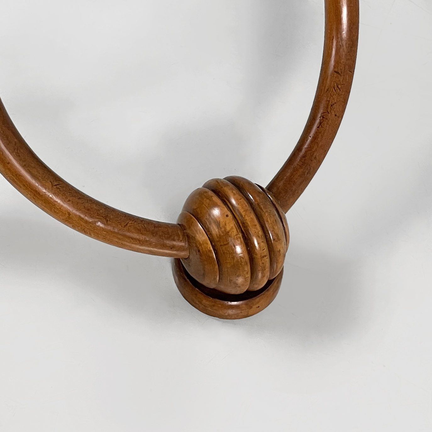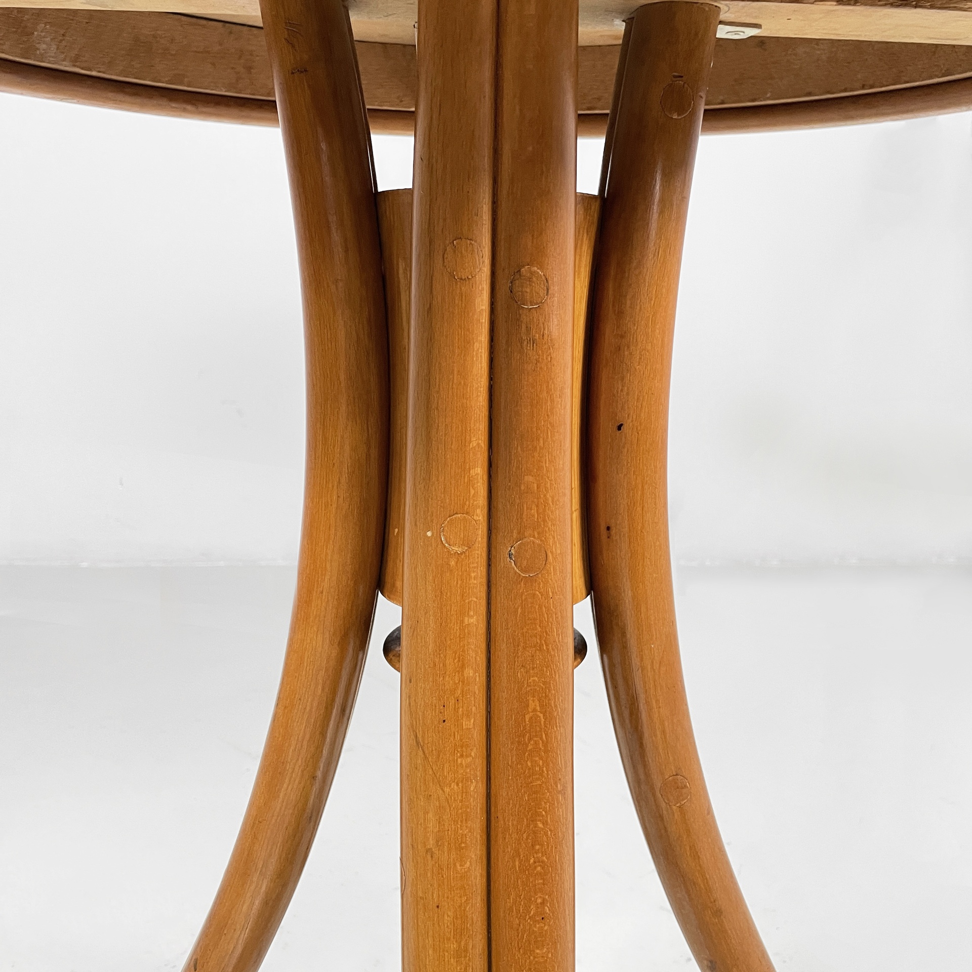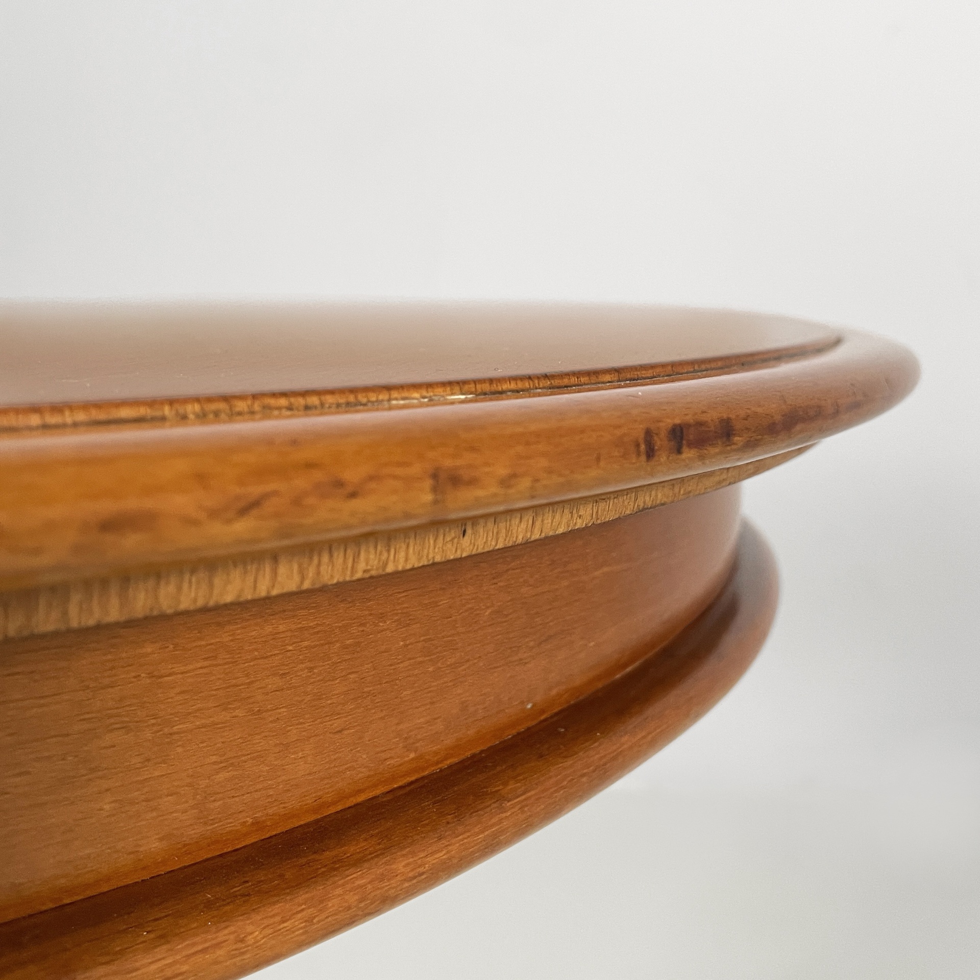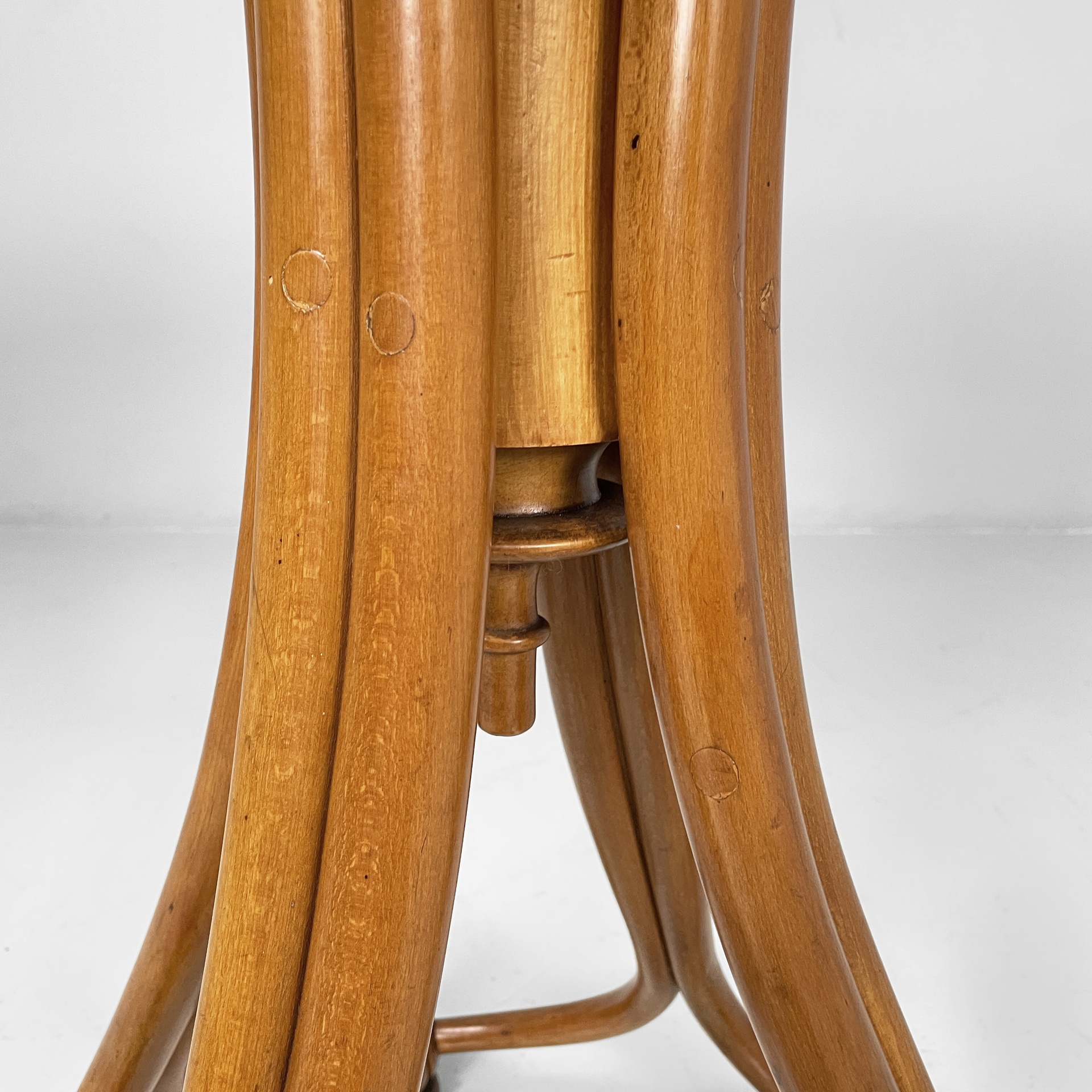 Tavolo da pranzo con piano tondo, interamente in legno. Le zampe sono composta da quattro listelli curvati con piedini sferici e scanalature decorative. Liberty/Art Nouveau