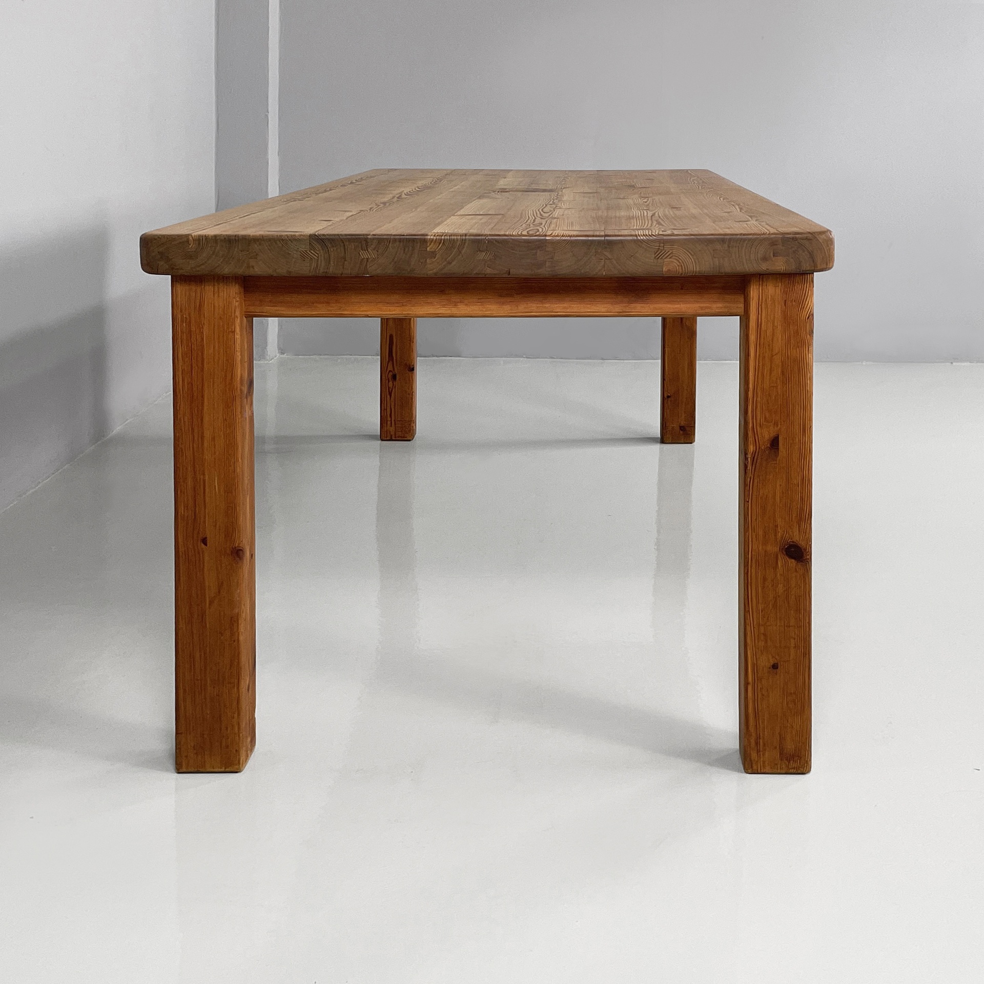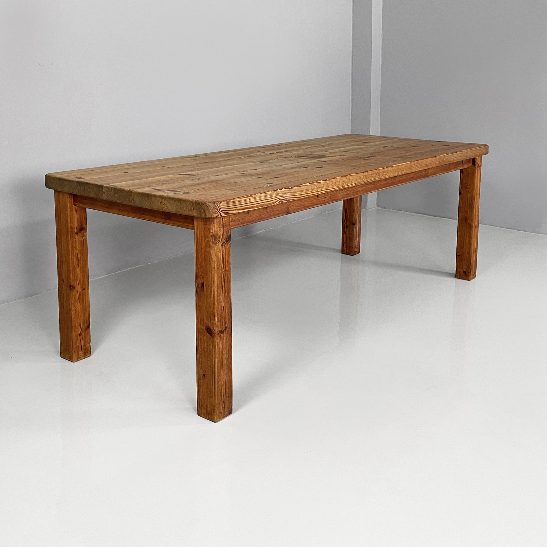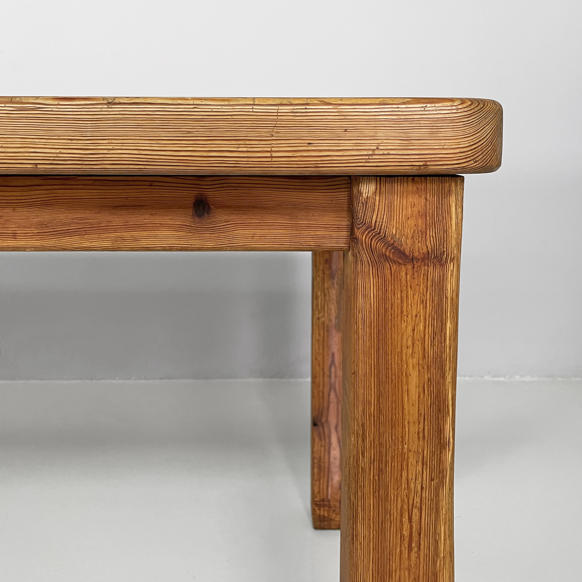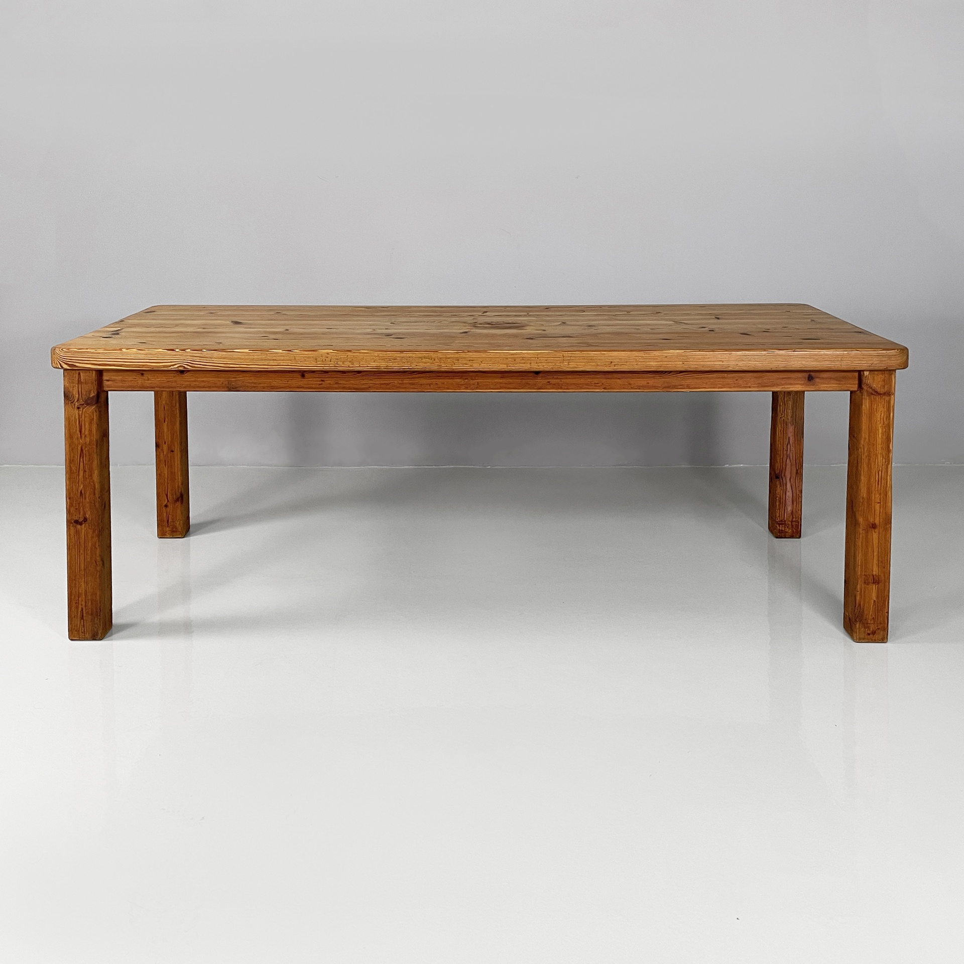 Tavolo da pranzo con piano rettangolare ad angoli arrotondati, interamente in legno di larice. Il piano poggia su una struttura in legno. Zampe a sezione squadrata.