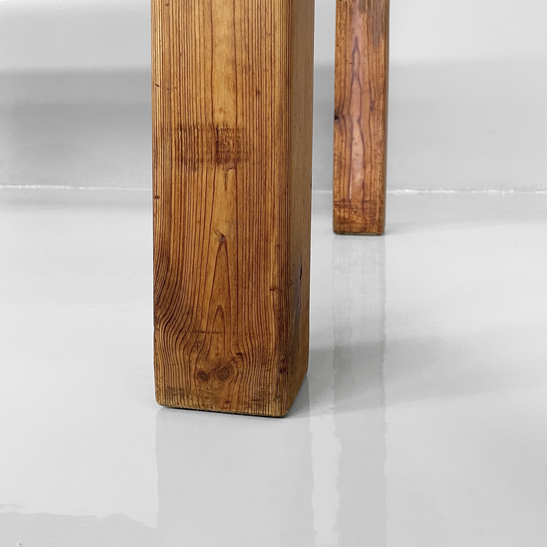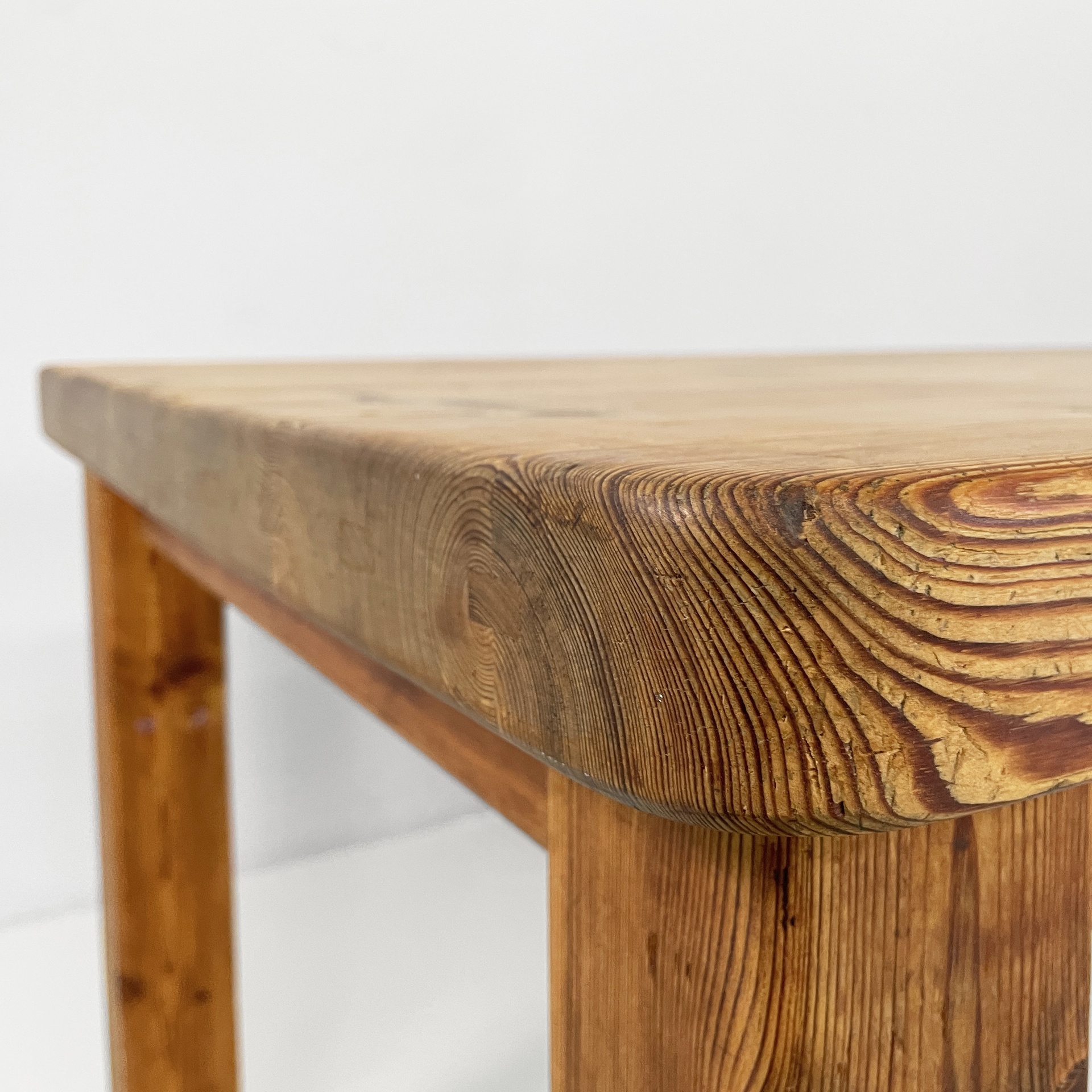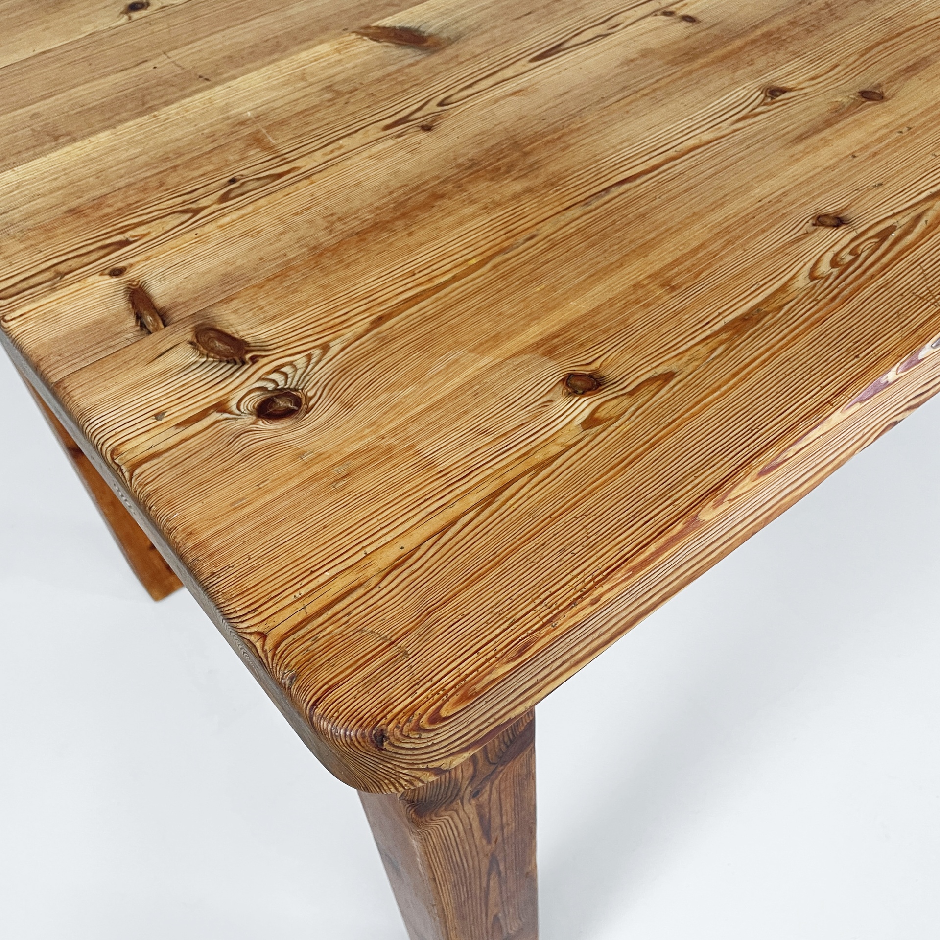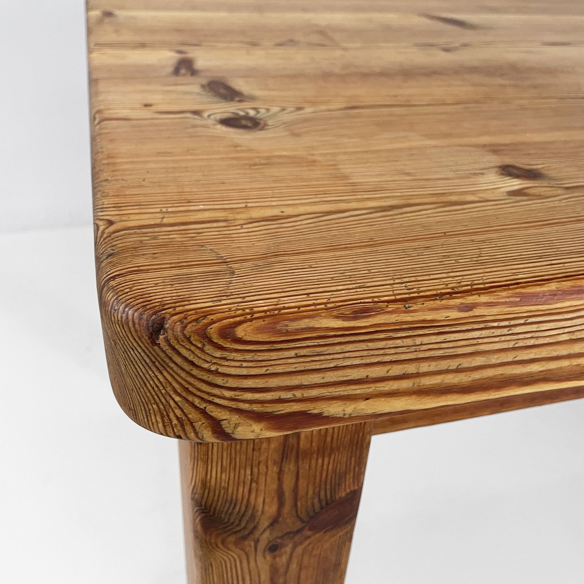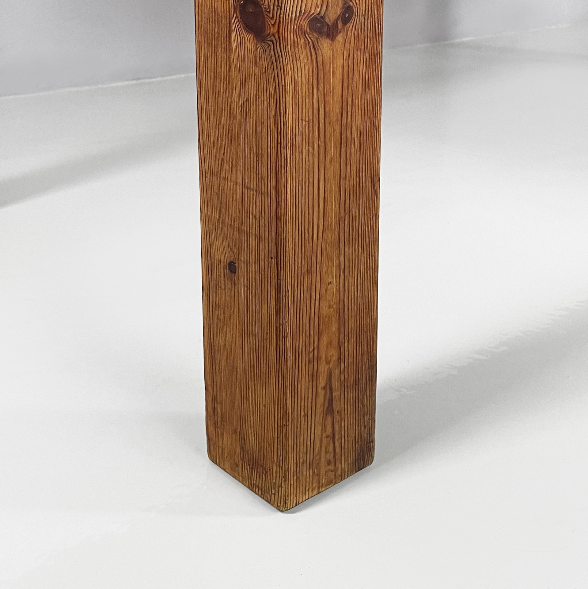Tavolo da pranzo con piano rettangolare ad angoli arrotondati, interamente in legno di larice. Il piano poggia su una struttura in legno. Zampe a sezione squadrata.