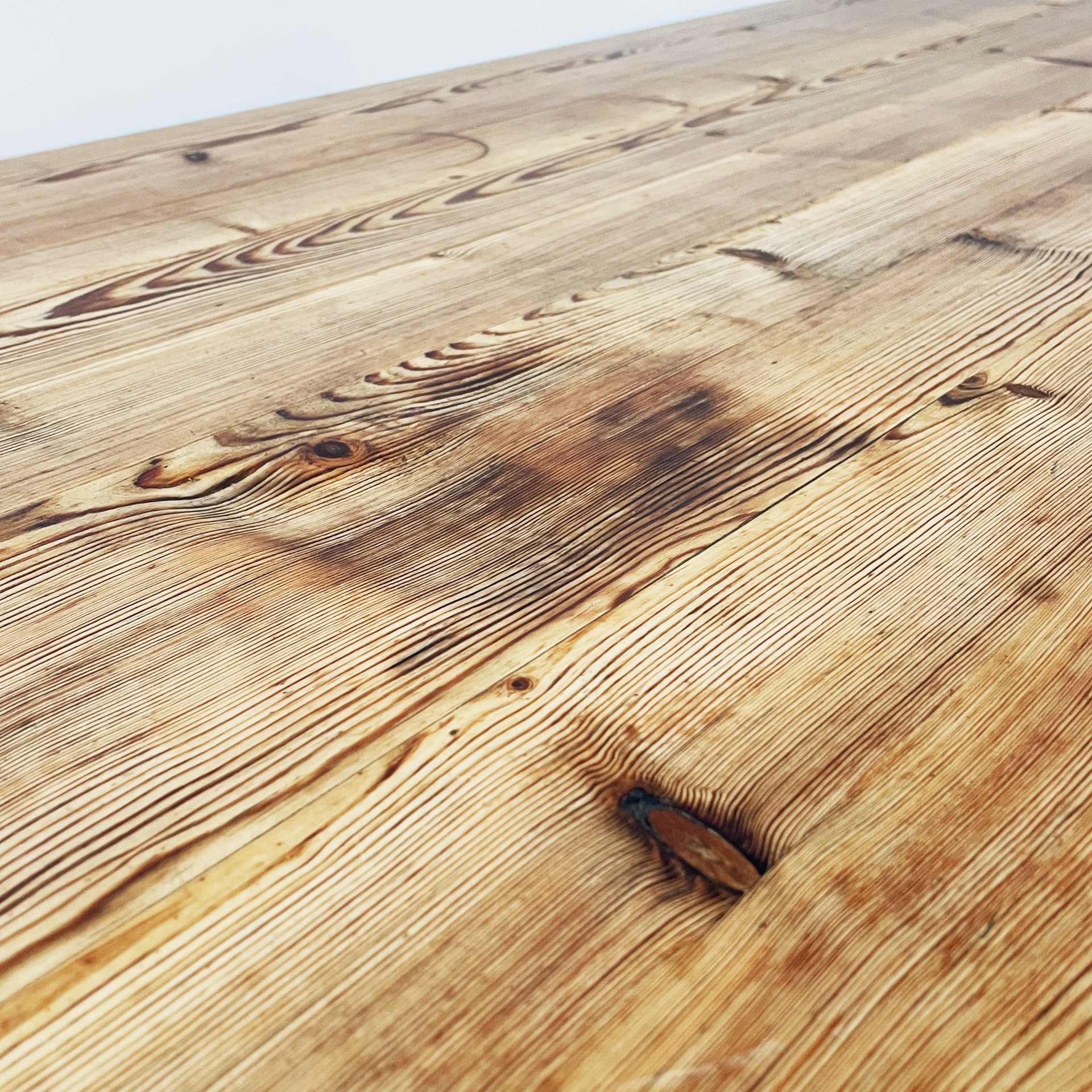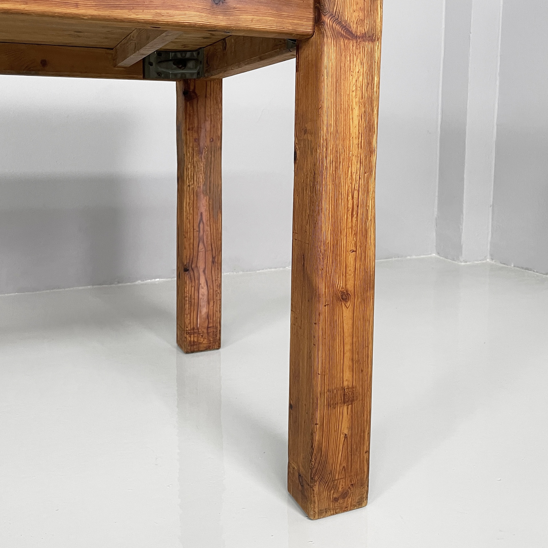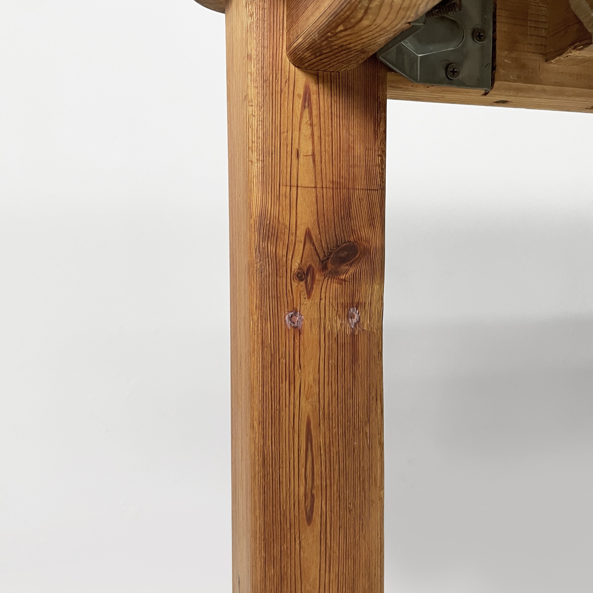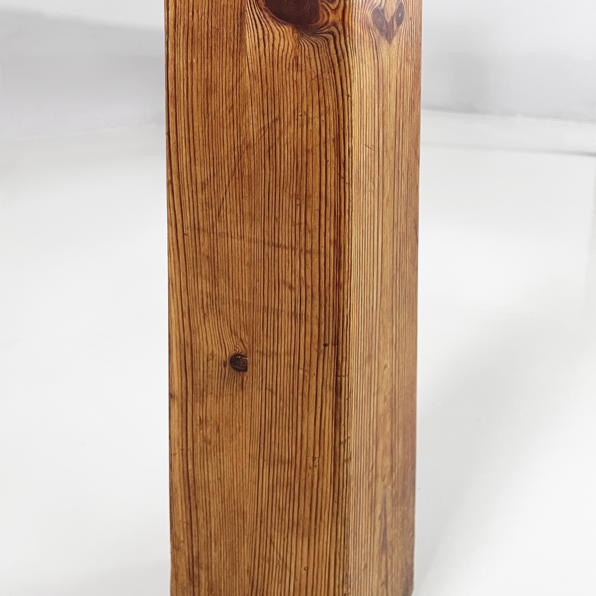 Tavolo da pranzo con piano rettangolare ad angoli arrotondati, interamente in legno di larice. Il piano poggia su una struttura in legno. Zampe a sezione squadrata.