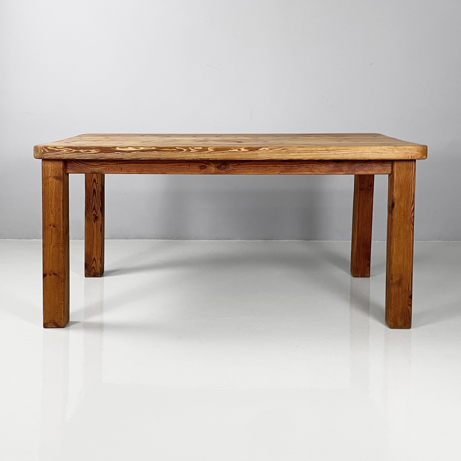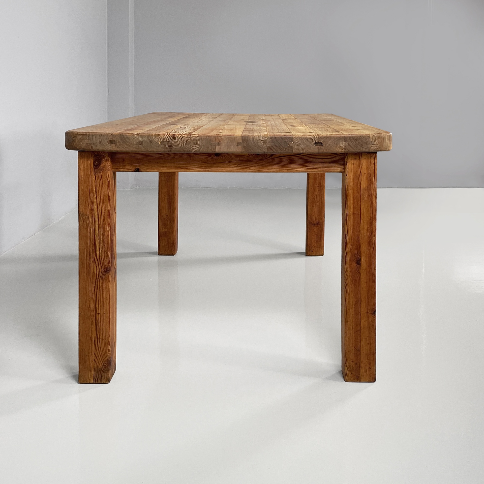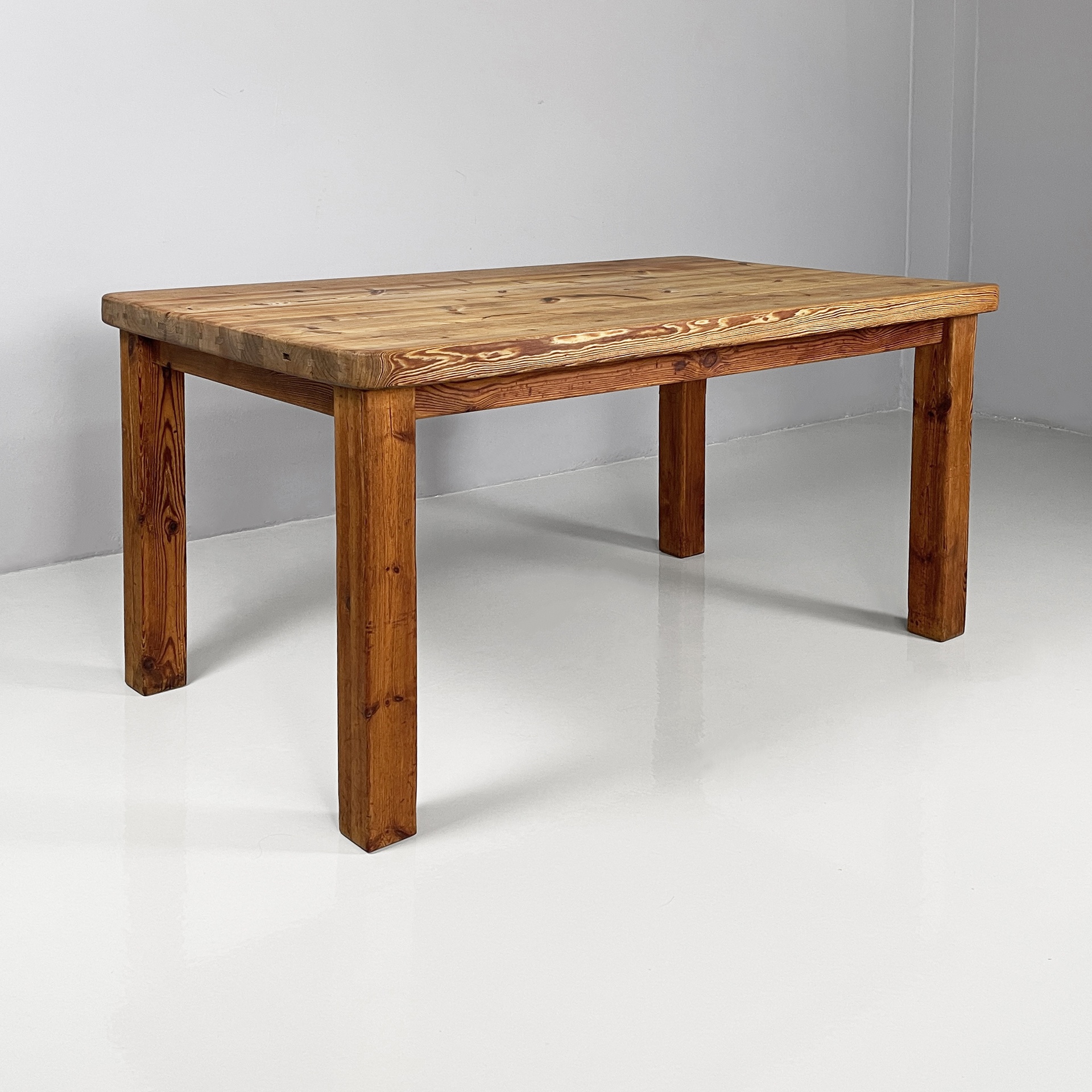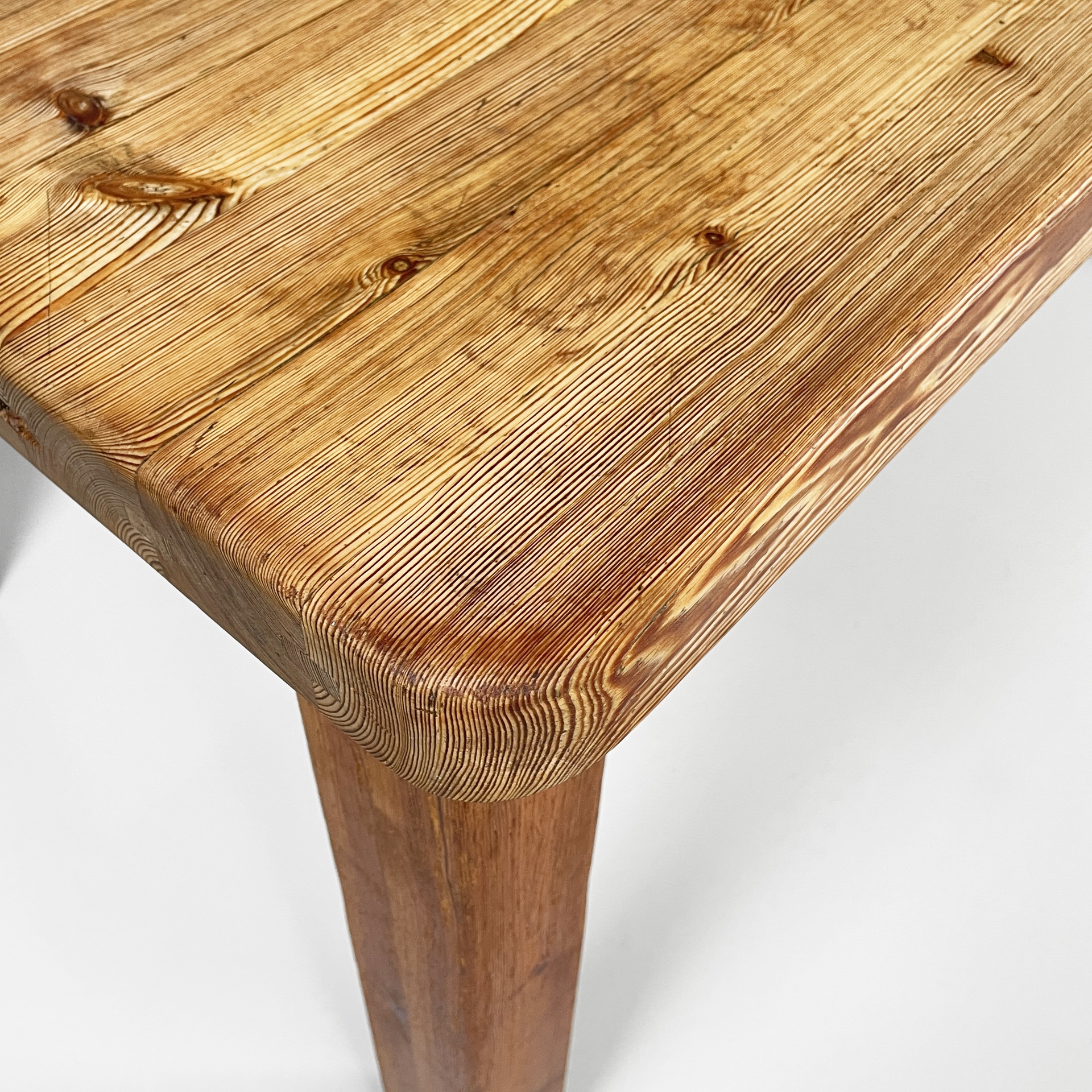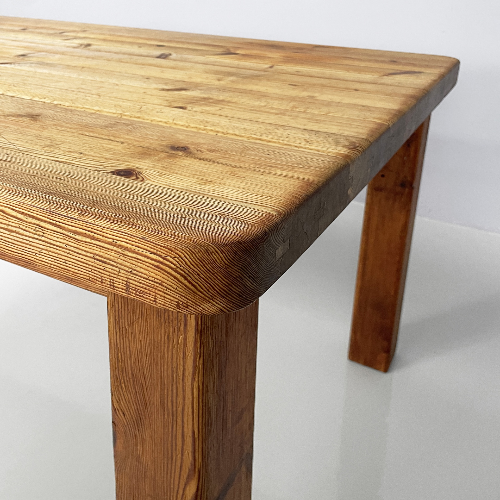 Tavolo da pranzo con piano rettangolare ad angoli arrotondati, interamente in legno di larice. Il piano poggia su una struttura in legno. Zampe a sezione squadrata.