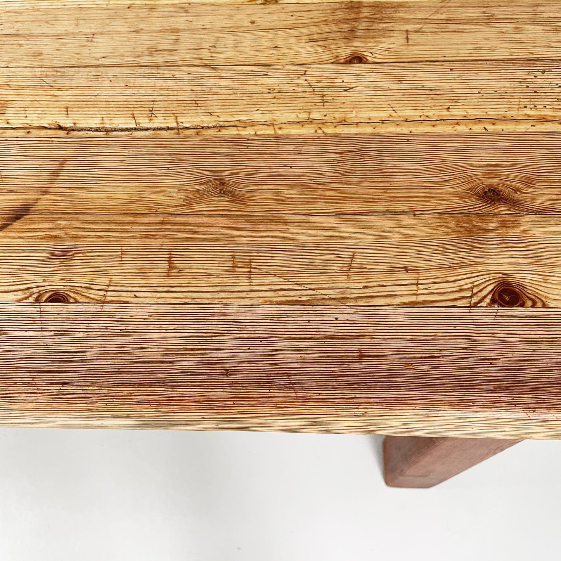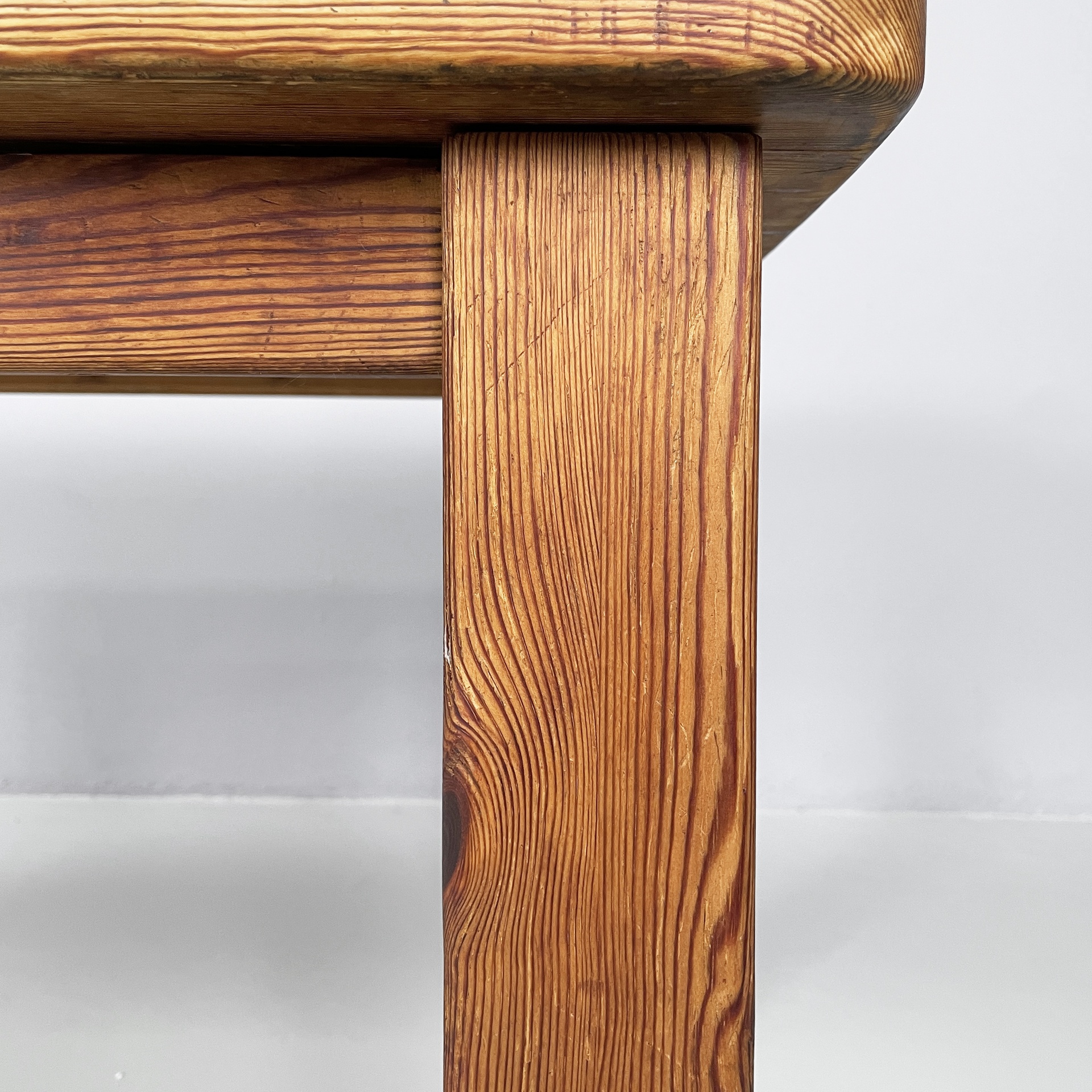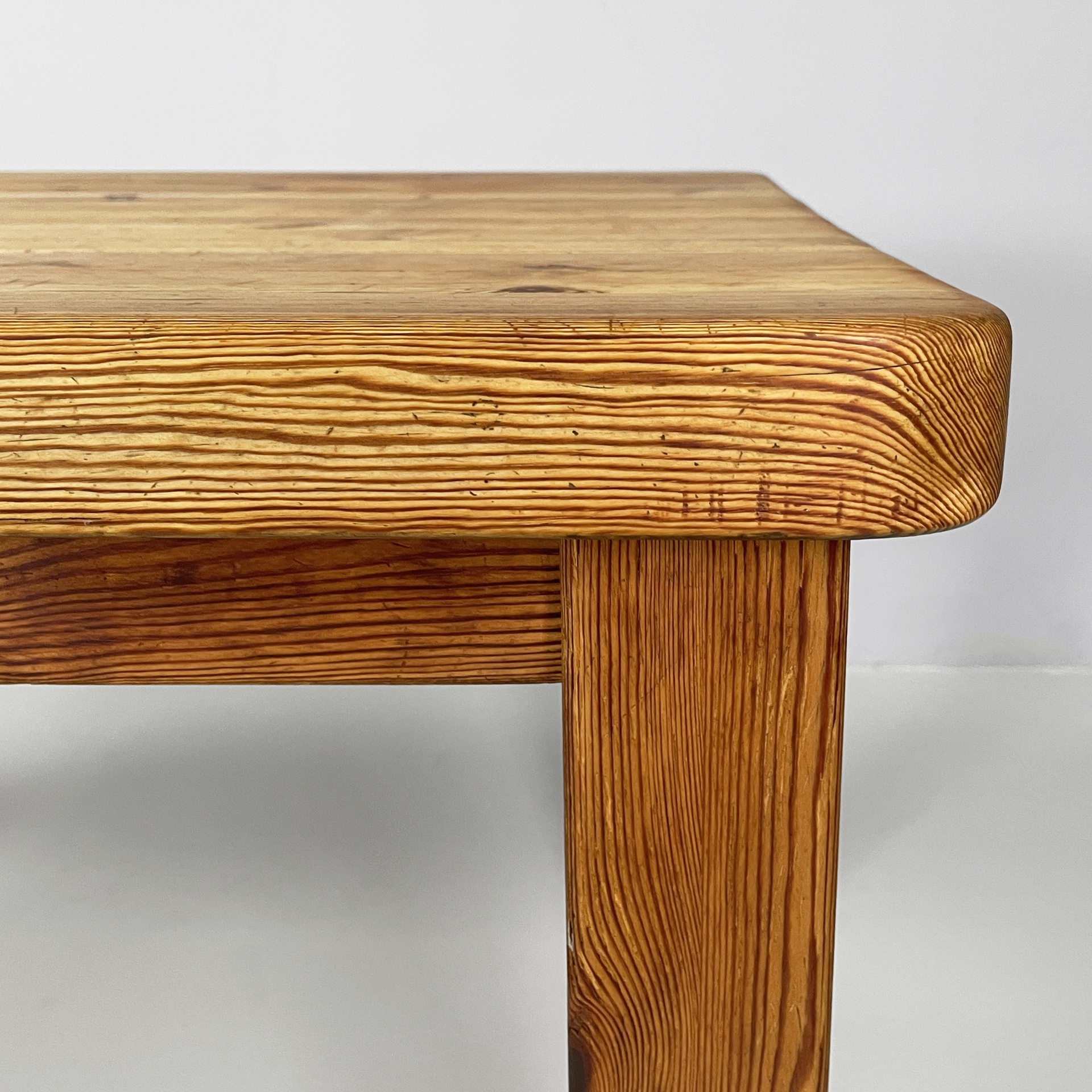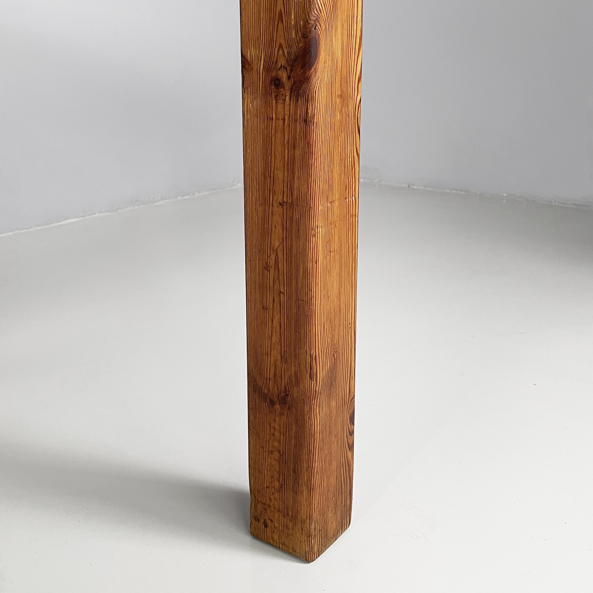 Tavolo da pranzo con piano rettangolare ad angoli arrotondati, interamente in legno di larice. Il piano poggia su una struttura in legno. Zampe a sezione squadrata.