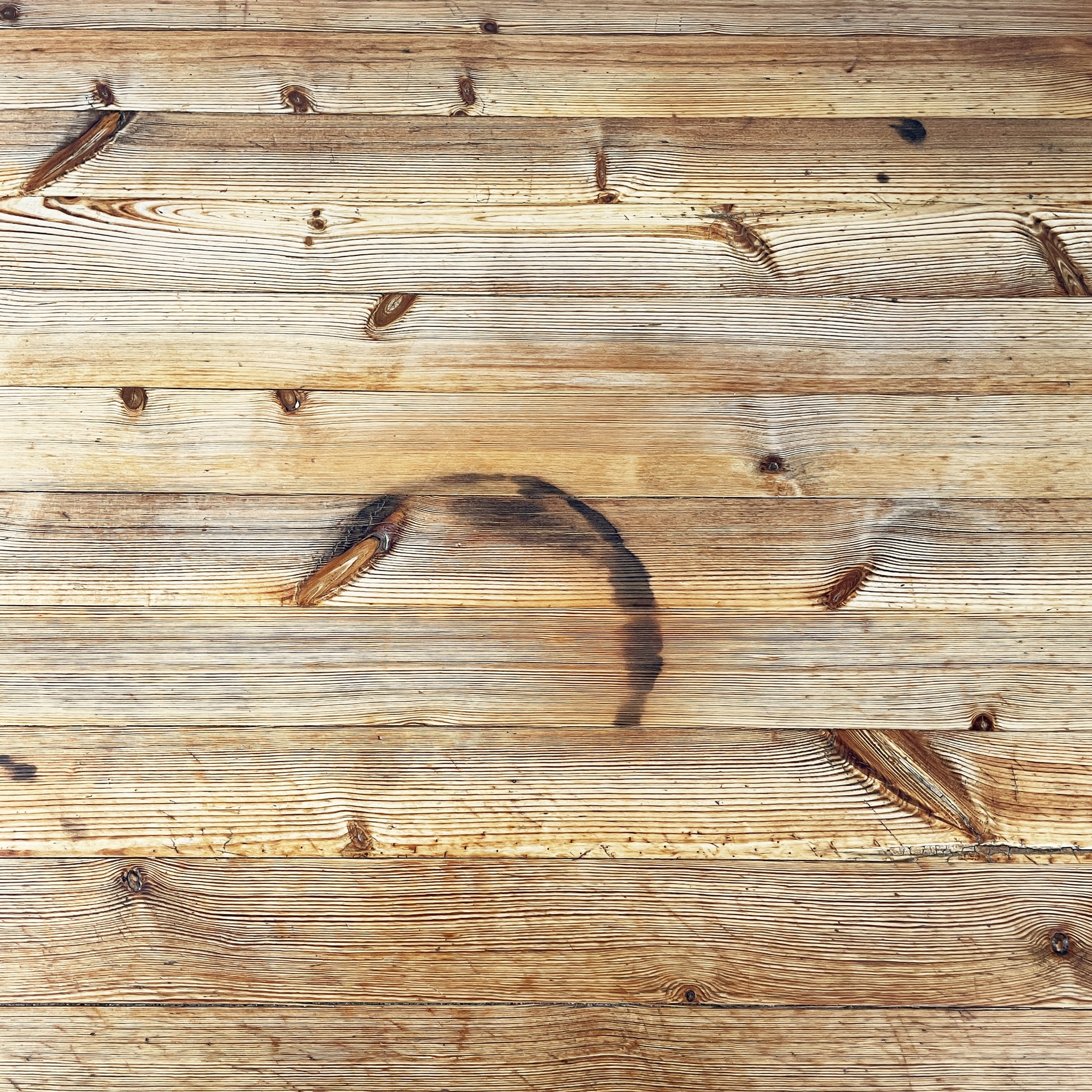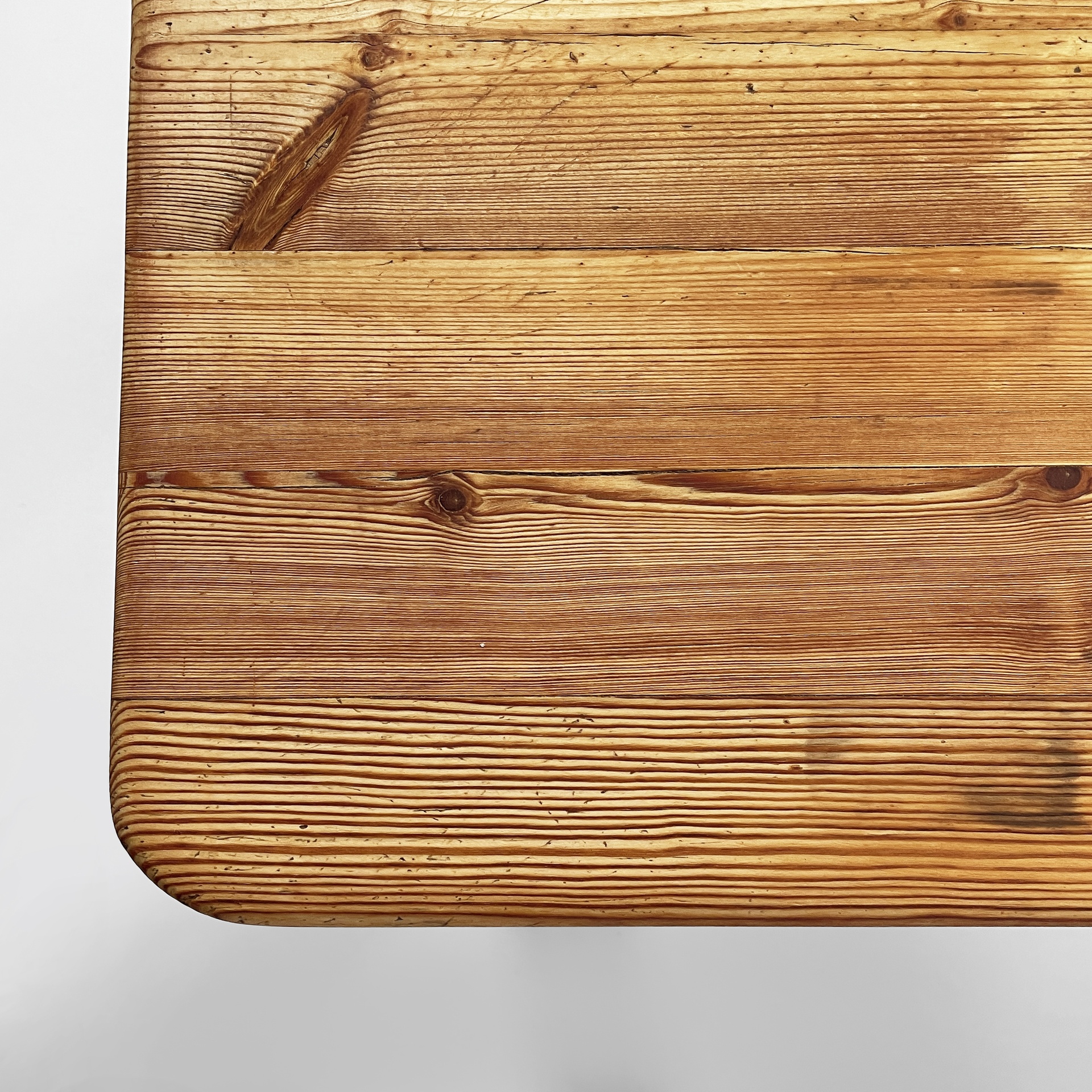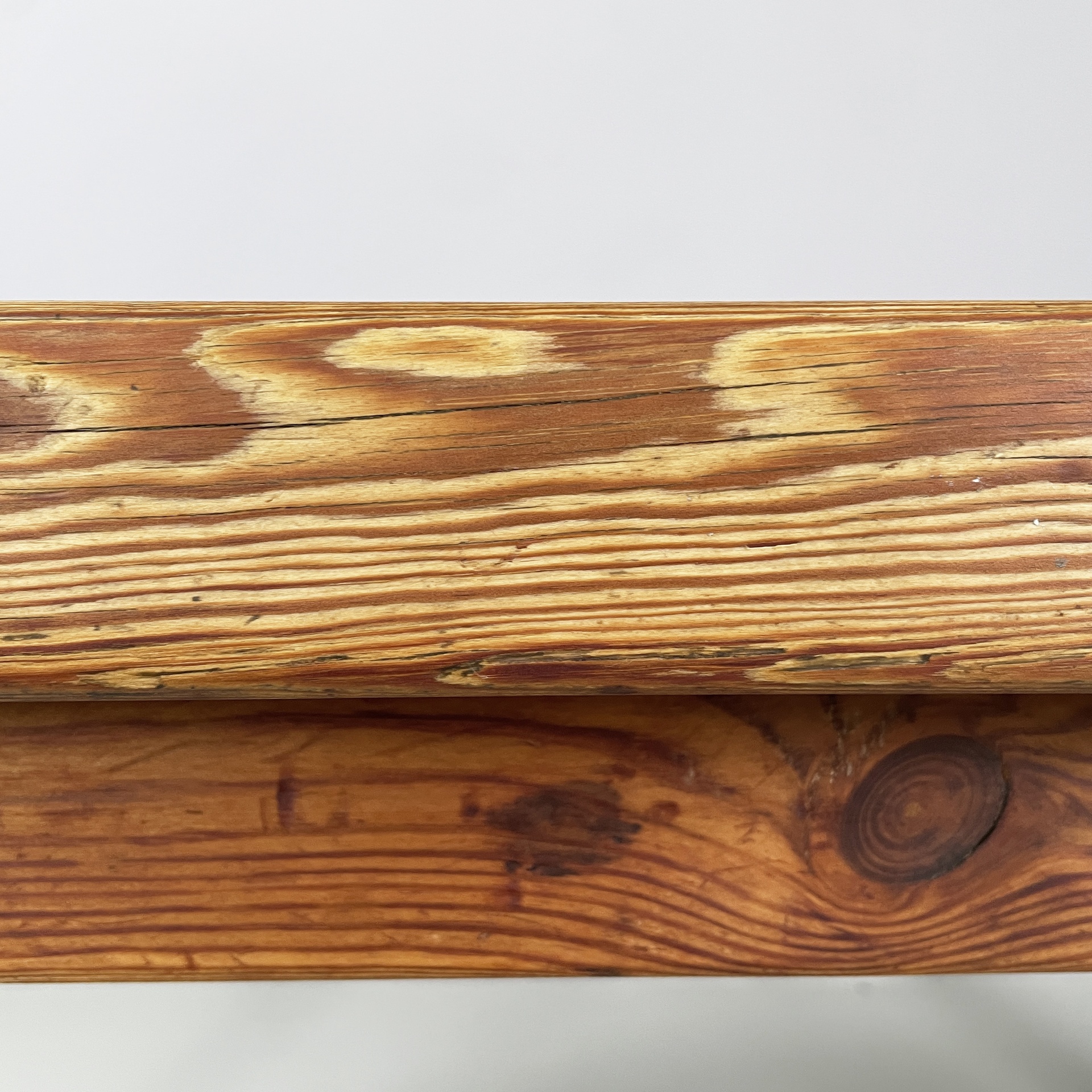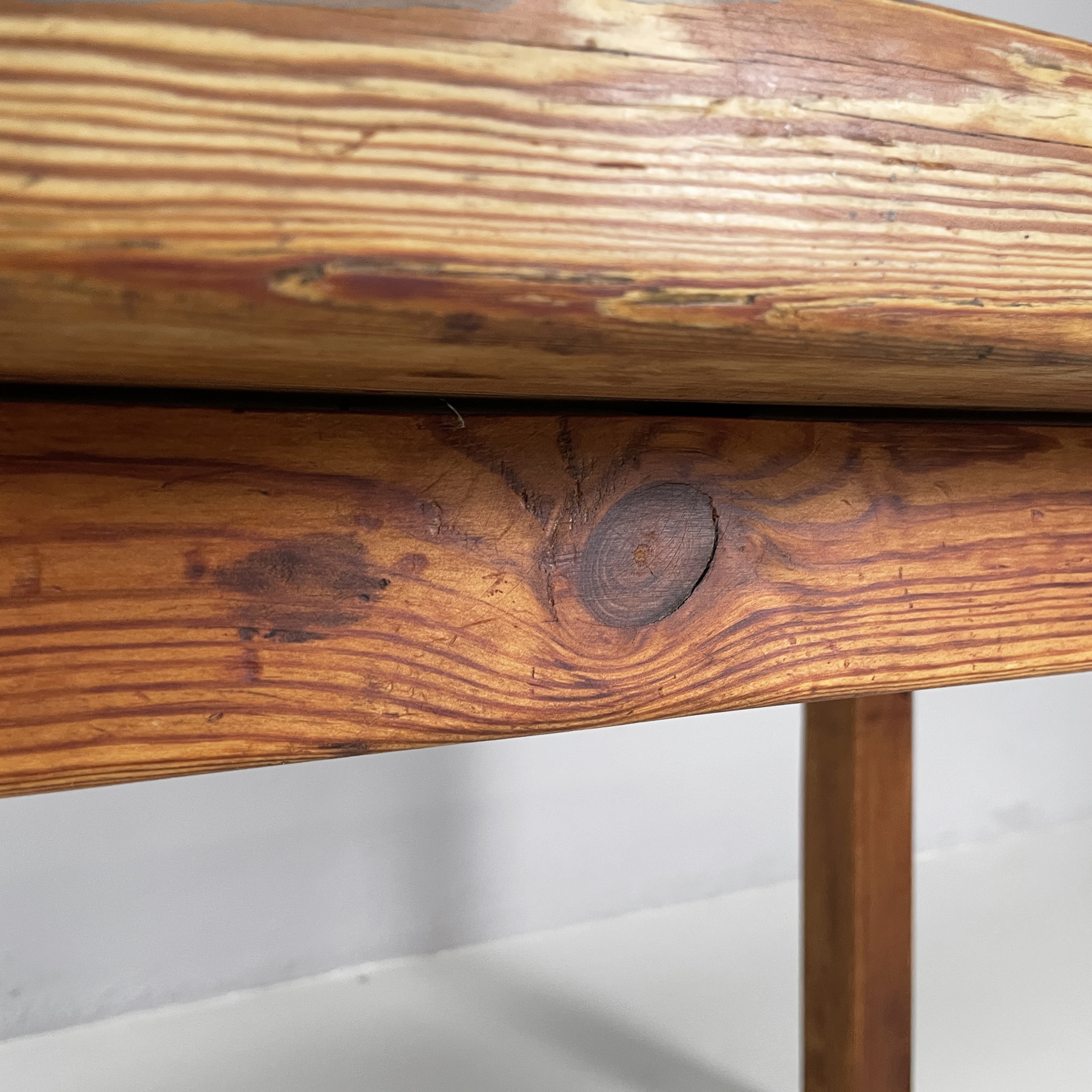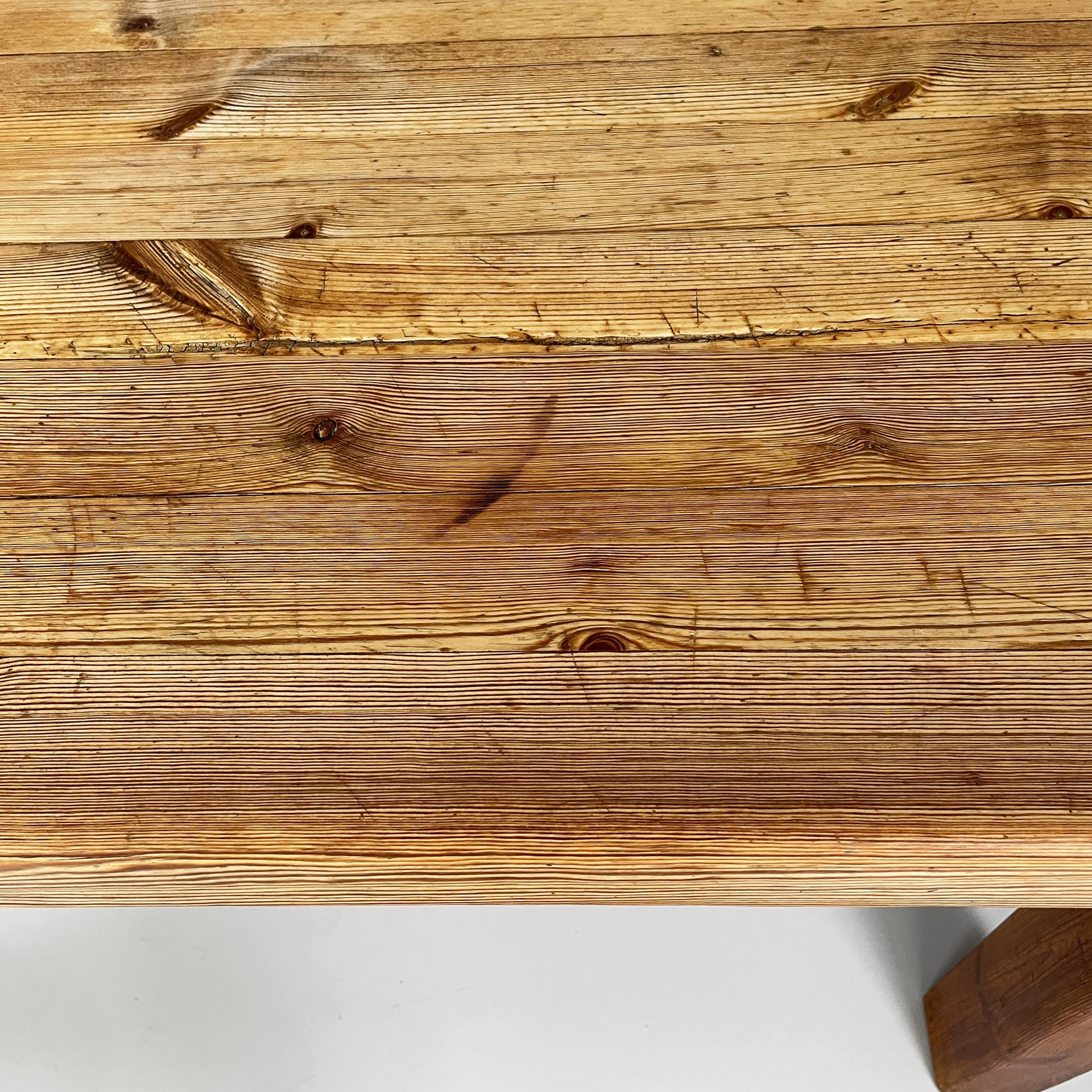 Tavolo da pranzo con piano rettangolare ad angoli arrotondati, interamente in legno di larice. Il piano poggia su una struttura in legno. Zampe a sezione squadrata.