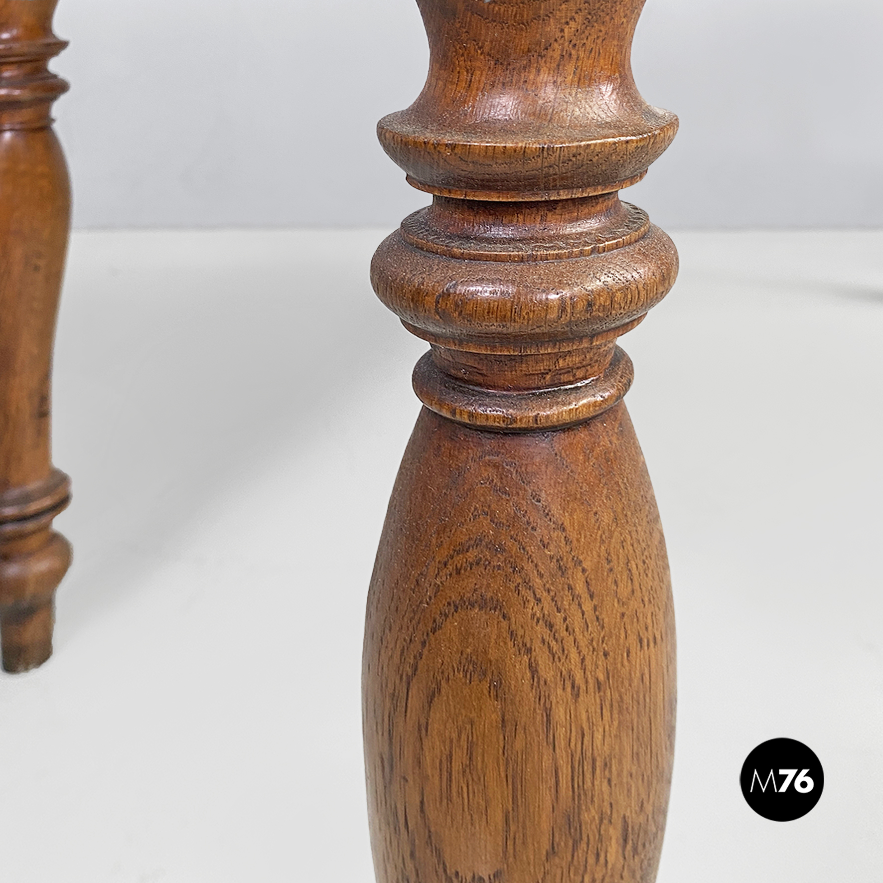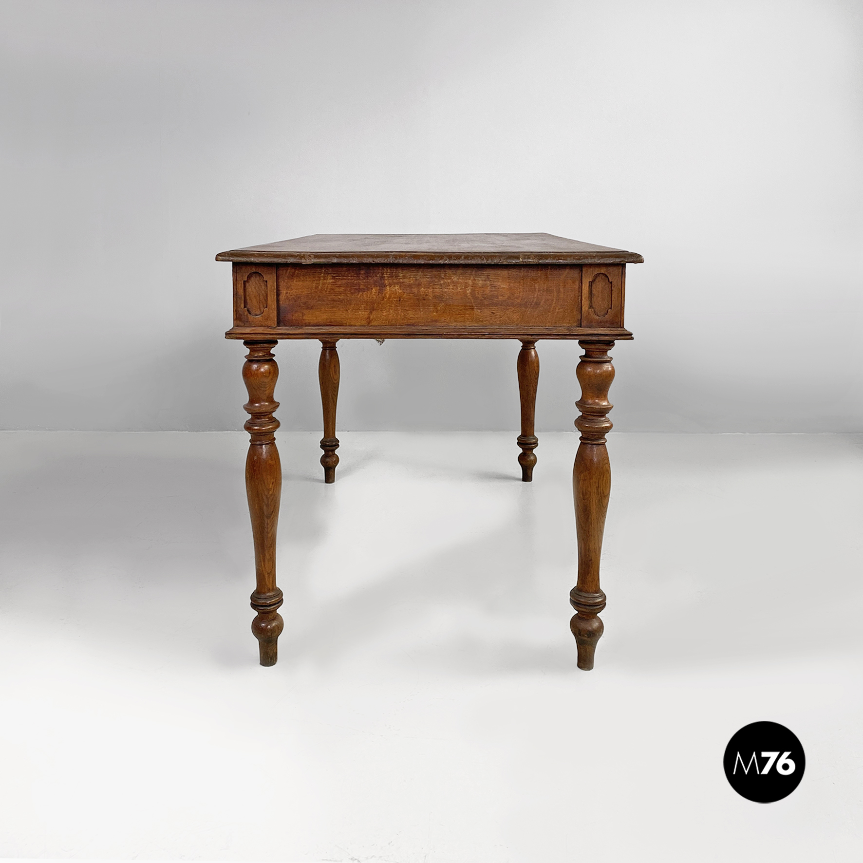 Tavolo da pranzo con piano rettangolare interamente in legno. Con due cassetti con pomoli in legno tondi, sui lati e sul davanti presenta decorazioni. Con quattro gambe tornite e piedini a sezione tonda. Uno dei due cassetti ha tre listelli di legno che formano quattro scompartimenti. Utilizzabile anche come scrivania.