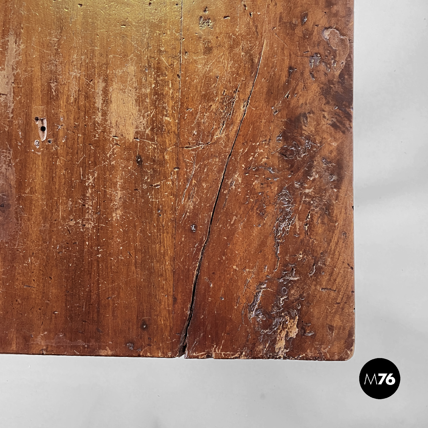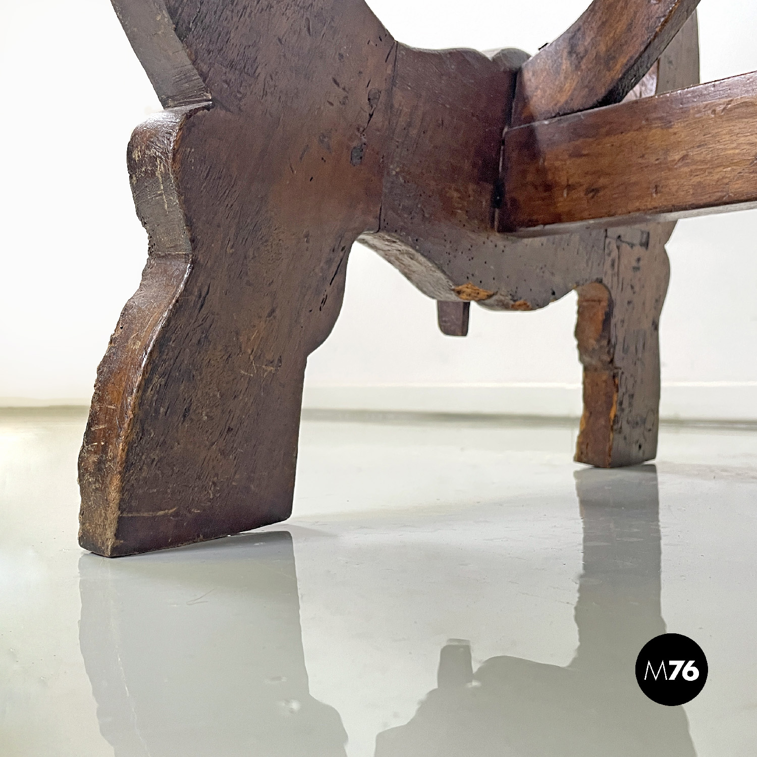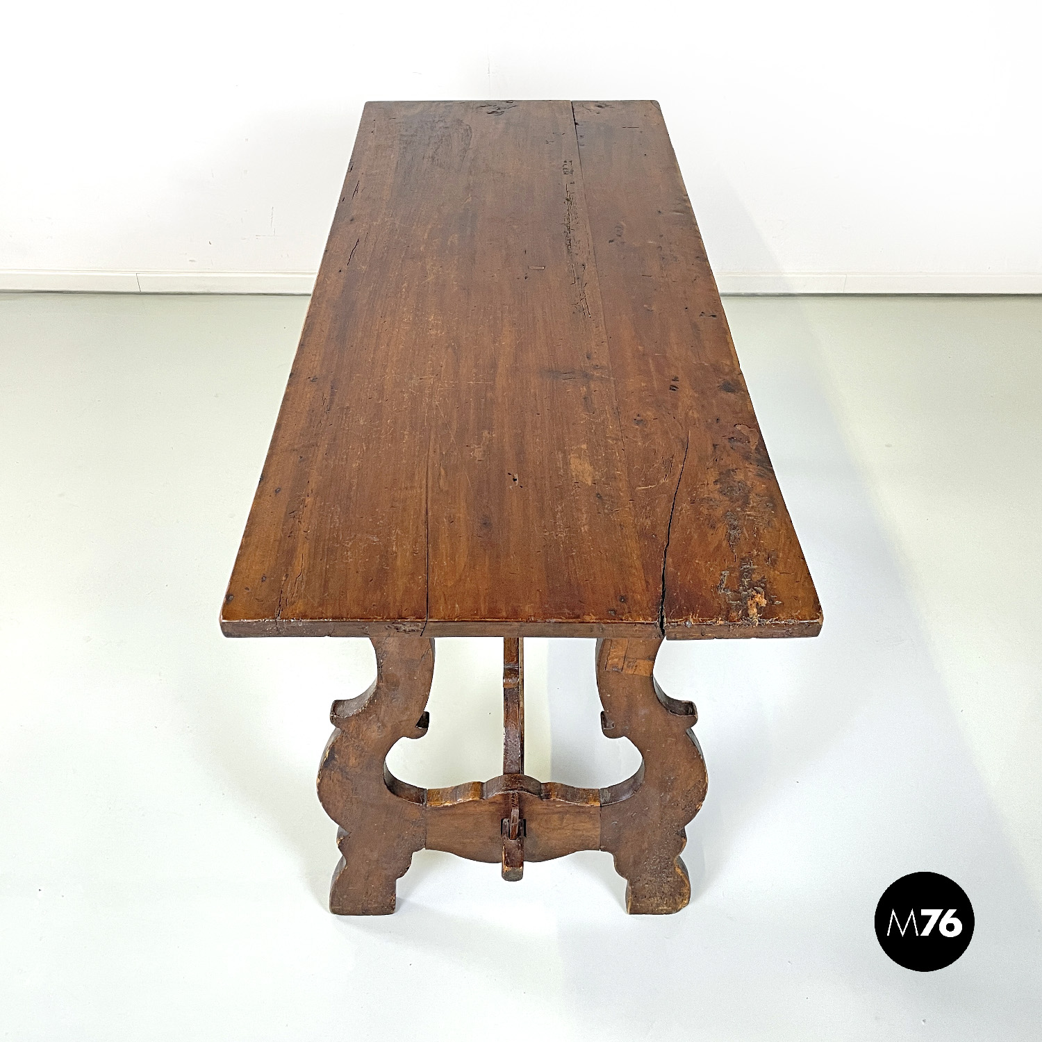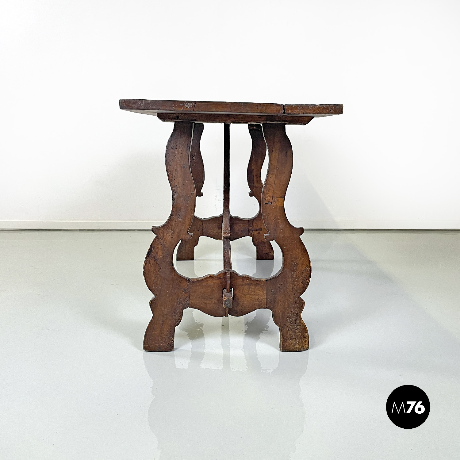 Tavolo da pranzo o scrivania interamente in legno con piano rettangolare e gambe a lira. Al centro delle gambe si trova una trave decorata che struttura la base del tavolo insieme ad altri due componenti sagomati che si uniscono al centro del piano.