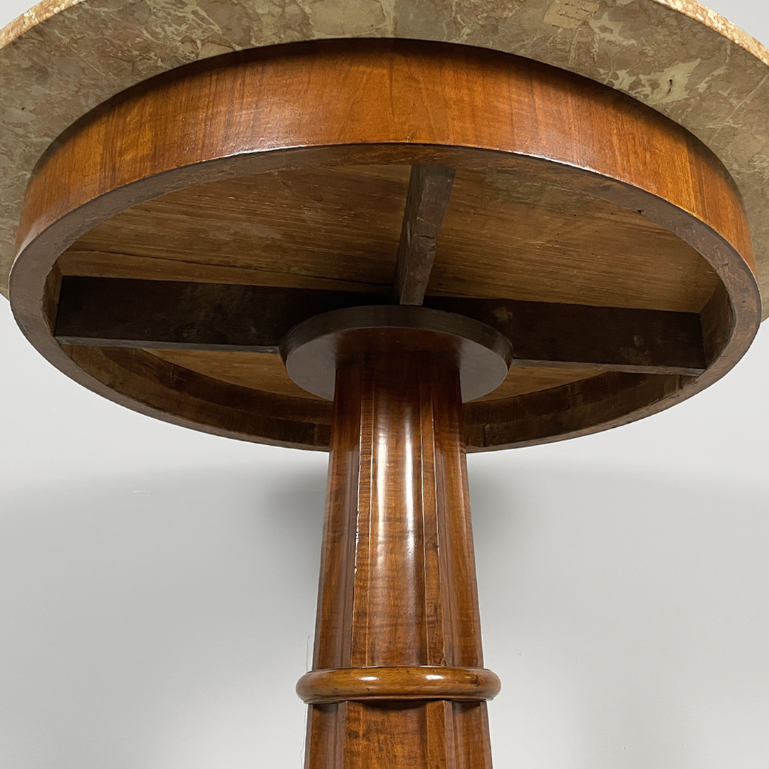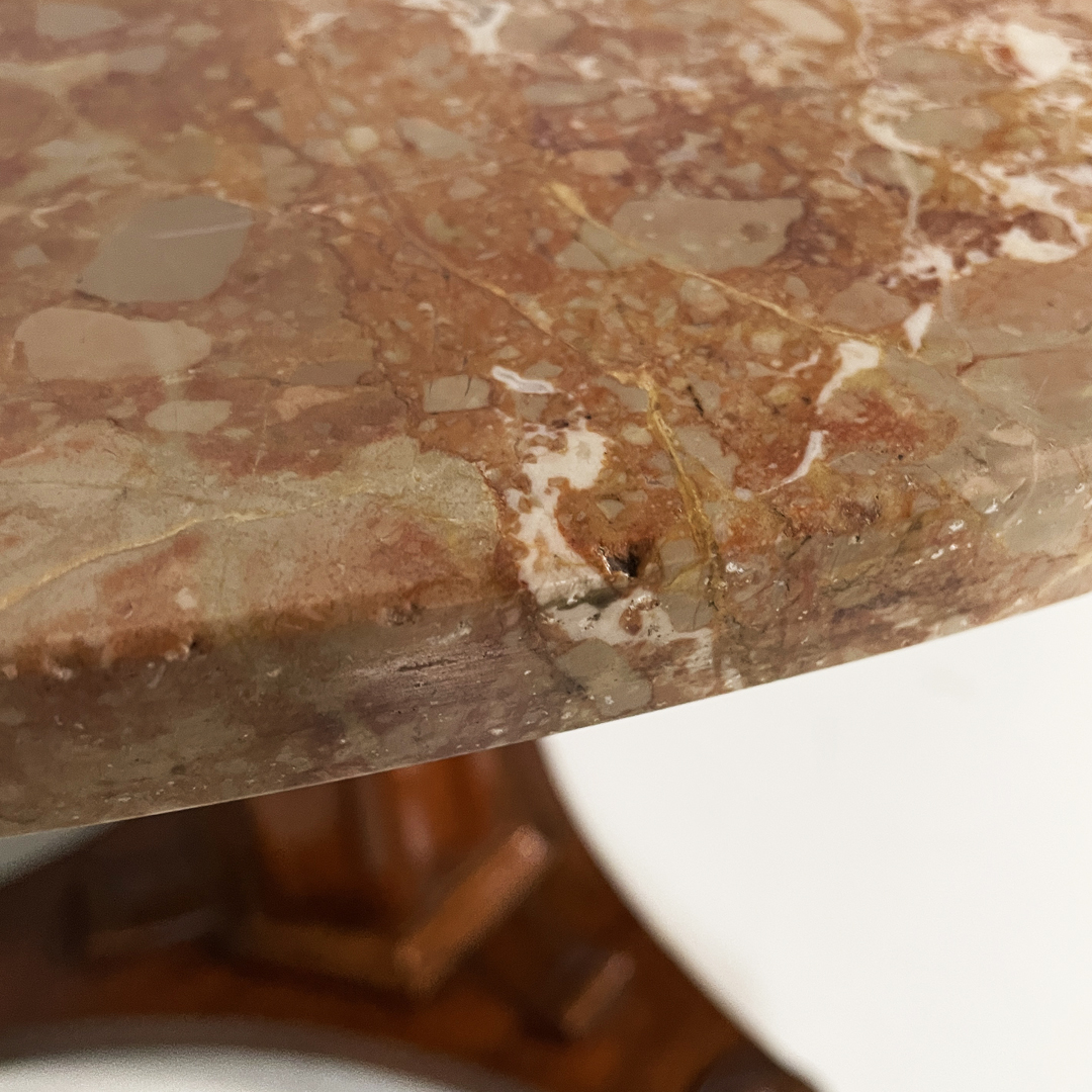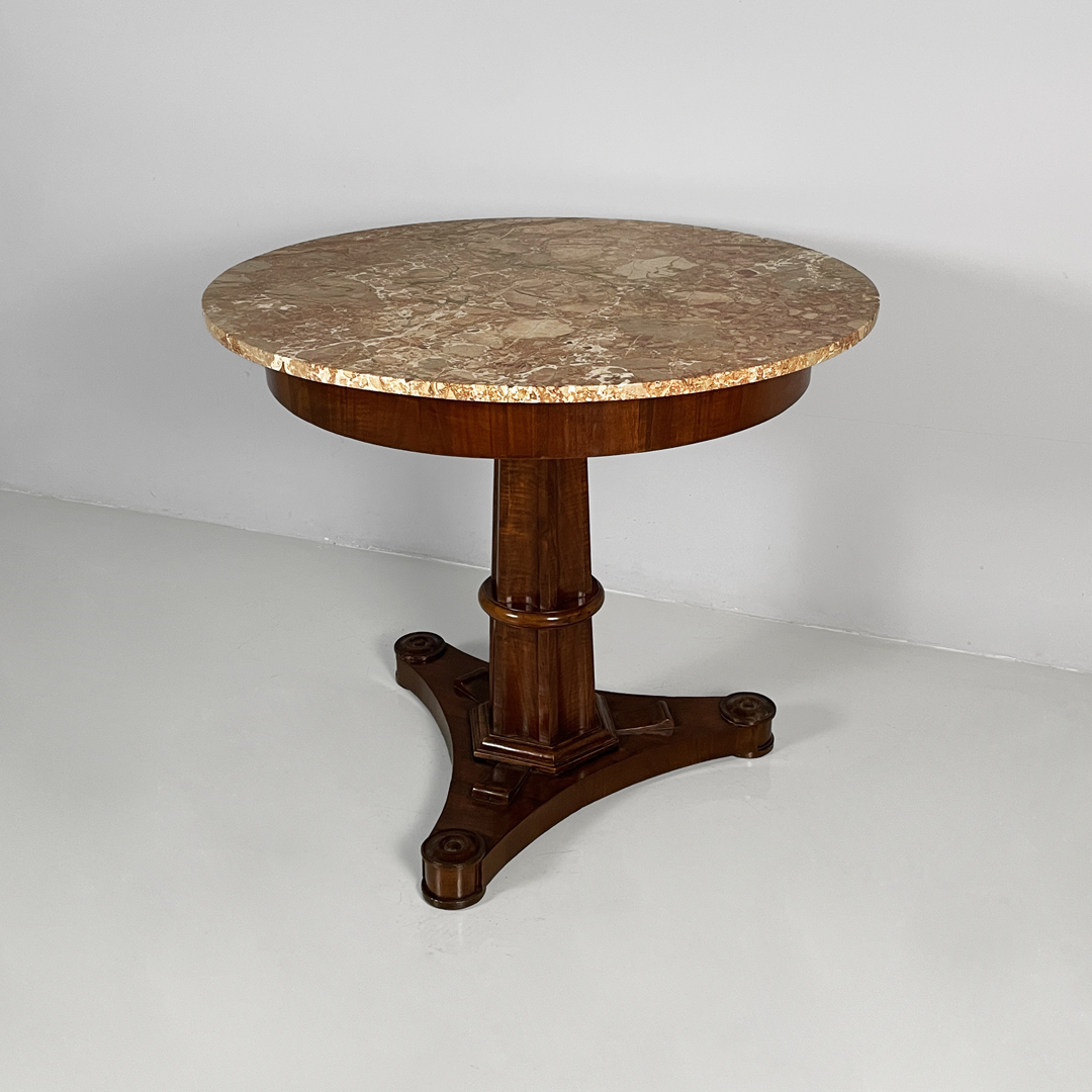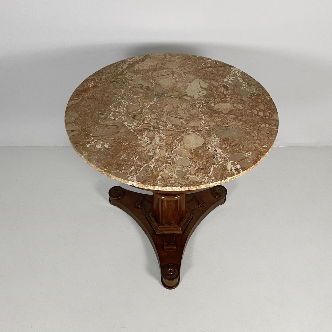 Tavolo da pranzo con piano tondo in breccia pernice. La base è in legno scuro lucidato, al centro c’è un fusto unico robusto a sezione squadrata con scanalature decorative, che poggia su una base trilobata. I tre piedi sono sagomati, con piccoli elementi decorativi circolari alle estremità. In stile Carlo X.