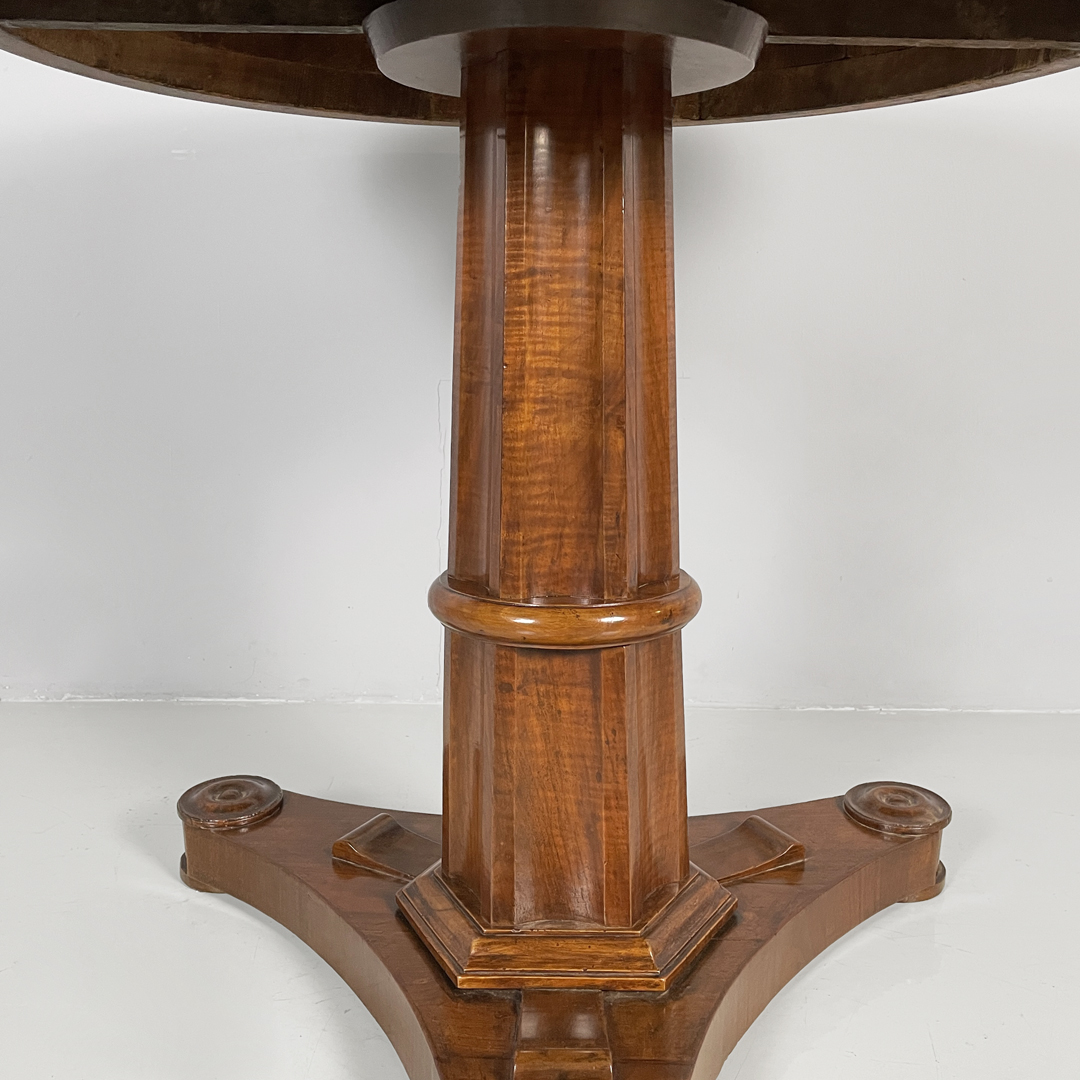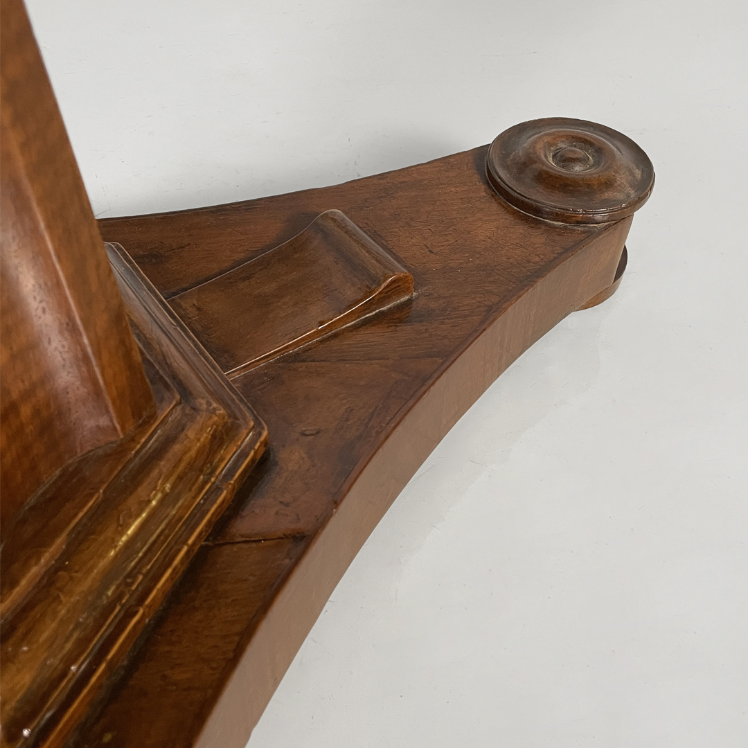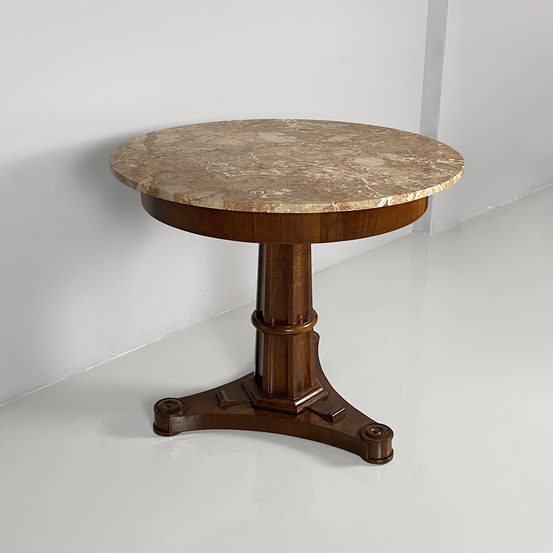 Tavolo da pranzo con piano tondo in breccia pernice. La base è in legno scuro lucidato, al centro c’è un fusto unico robusto a sezione squadrata con scanalature decorative, che poggia su una base trilobata. I tre piedi sono sagomati, con piccoli elementi decorativi circolari alle estremità. In stile Carlo X.