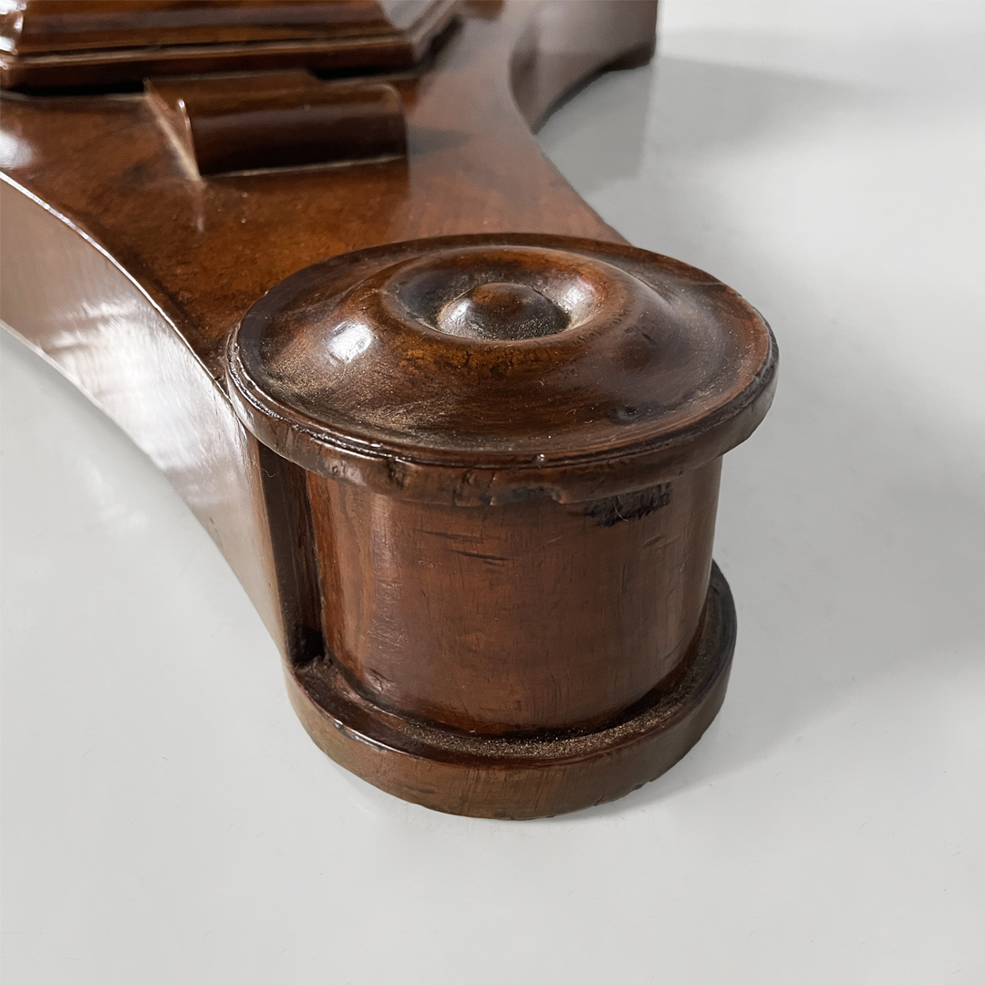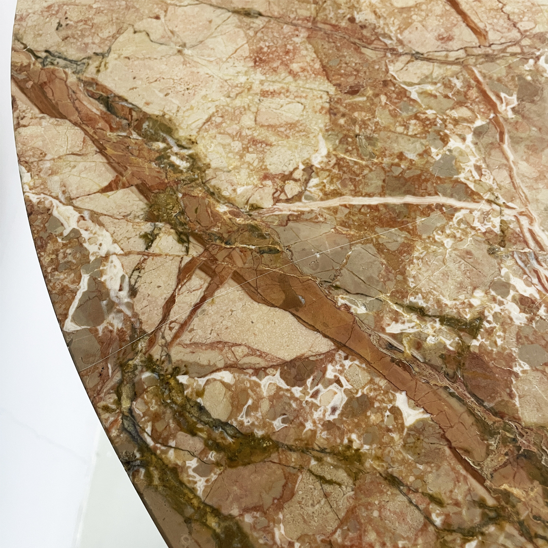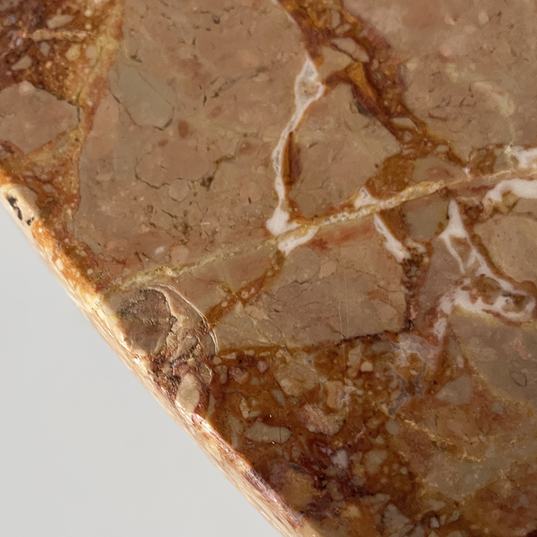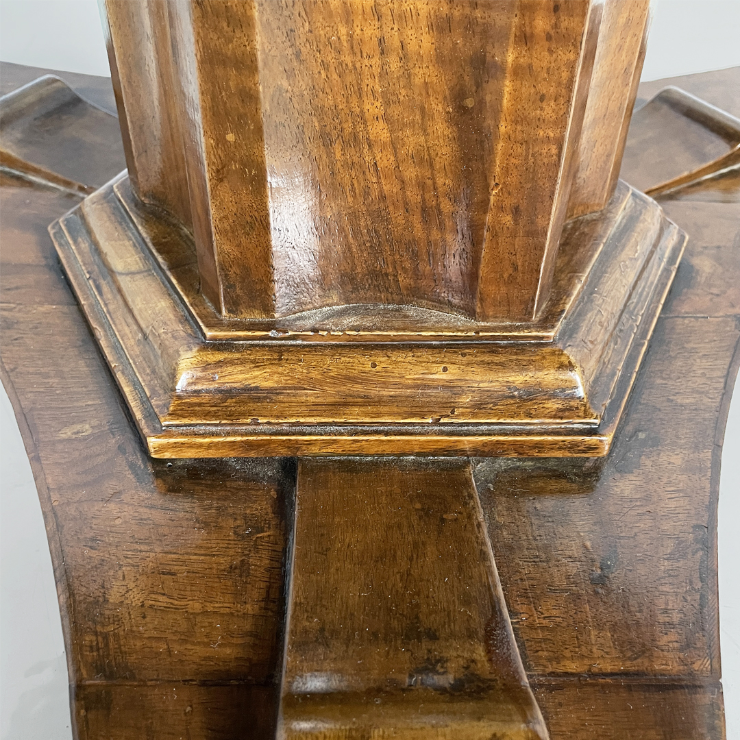 Tavolo da pranzo con piano tondo in breccia pernice. La base è in legno scuro lucidato, al centro c’è un fusto unico robusto a sezione squadrata con scanalature decorative, che poggia su una base trilobata. I tre piedi sono sagomati, con piccoli elementi decorativi circolari alle estremità. In stile Carlo X.