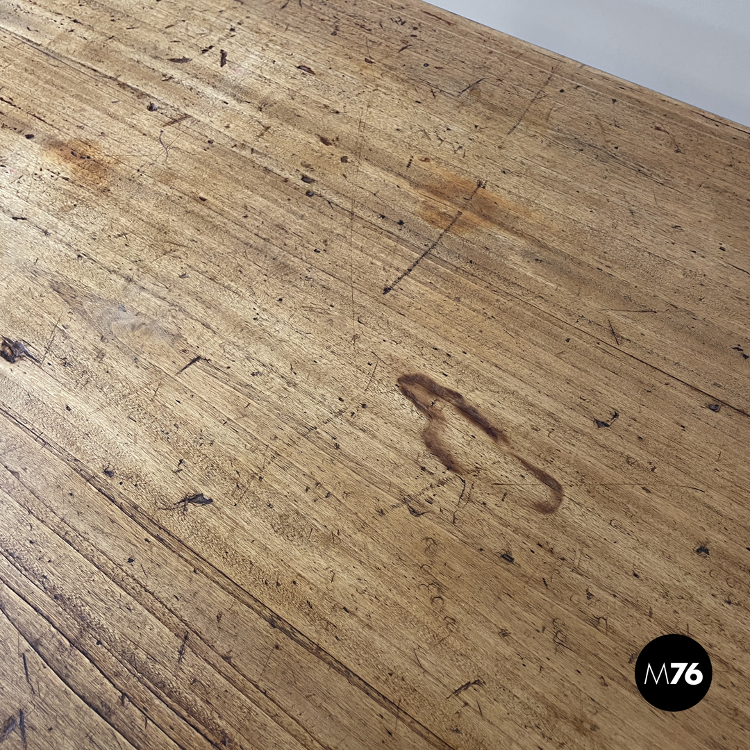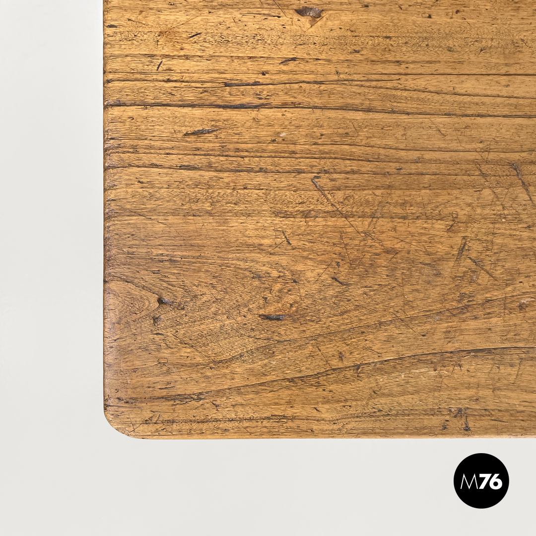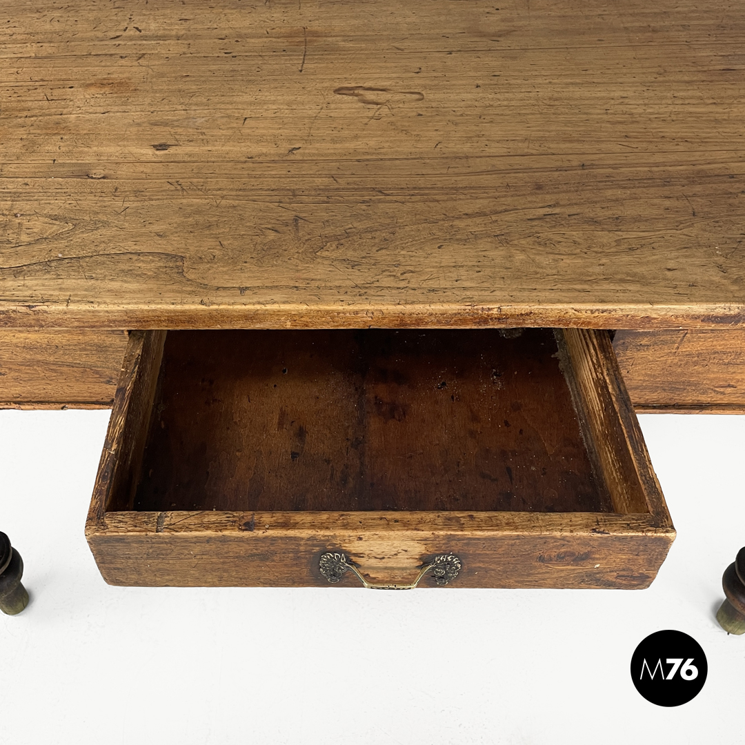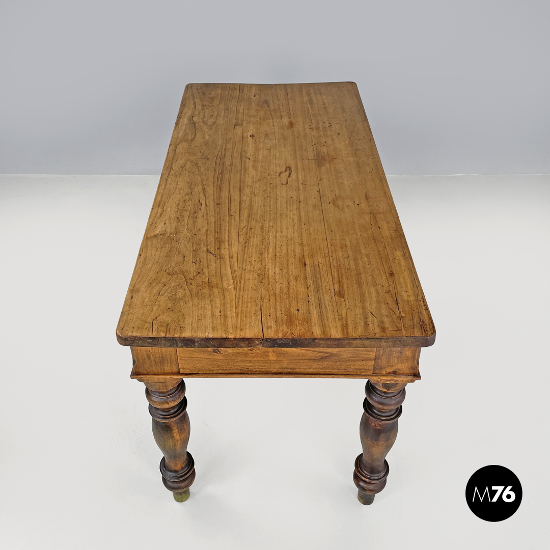 Tavolo da pranzo rettangolare interamente in legno. Presenta un cassetto centrale con maniglia in ottone con decorazione floreale. Le quattro gambe sono tornite e i piedini sono a sezione tonda.