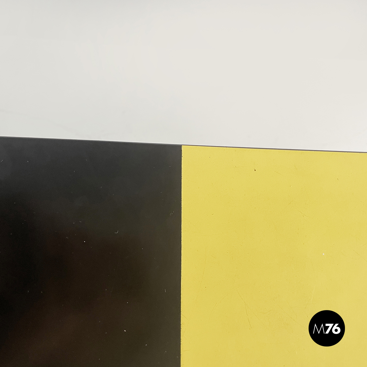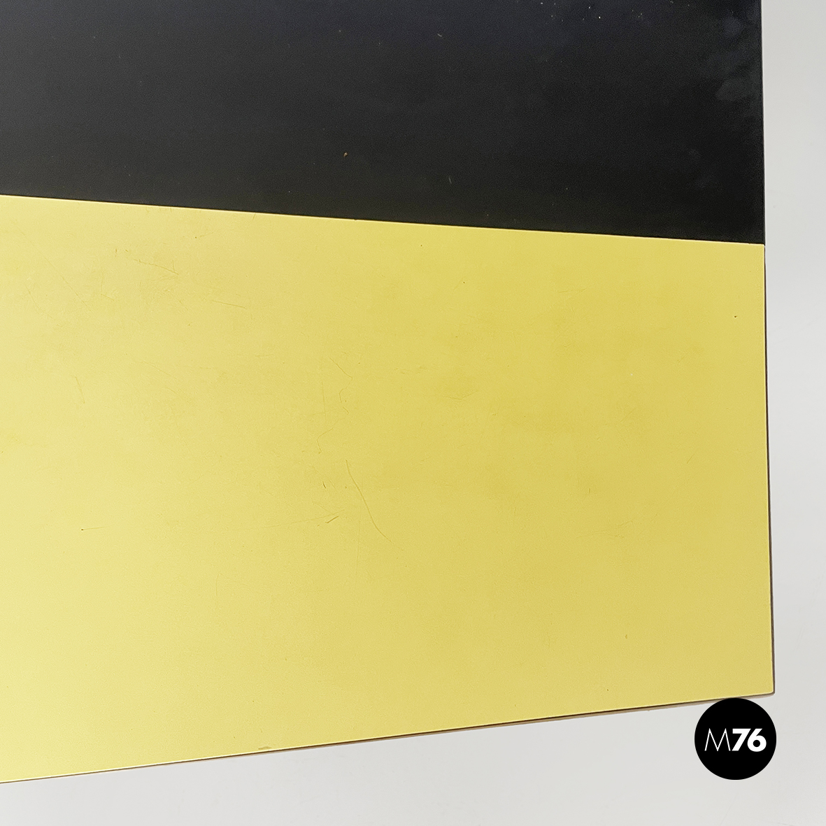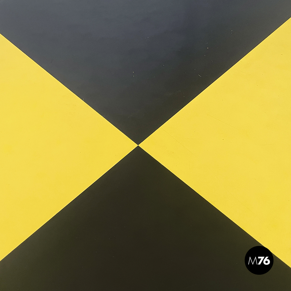 Tavolo da pranzo con piano geometrico in legno e formica. Il piano presenta una colorazione a scacchiera in giallo e nero. Le zampe sono a sezione quadrata, unite da traverse a sezione rettangolare e tondini, tutti in ferro verniciato marrone. Piedini squadrati neri.