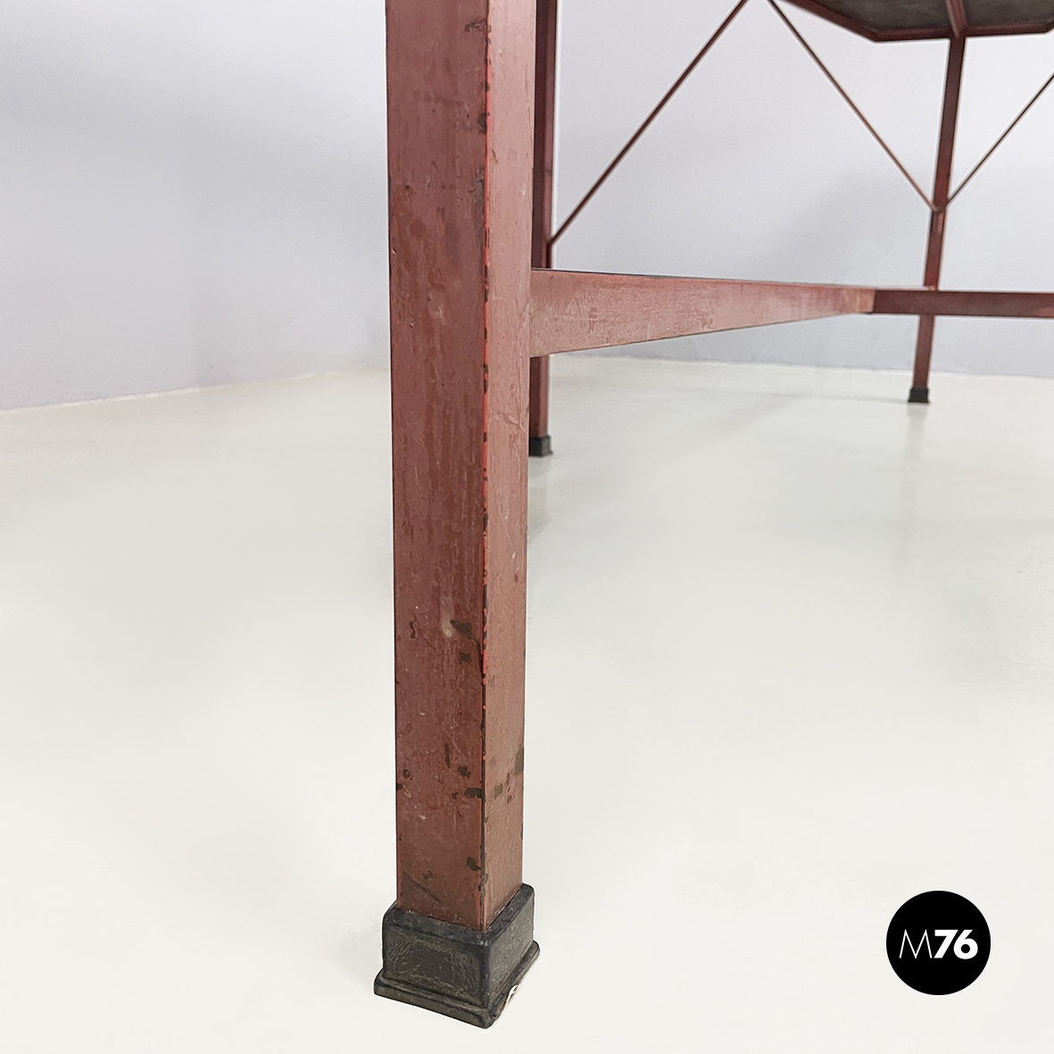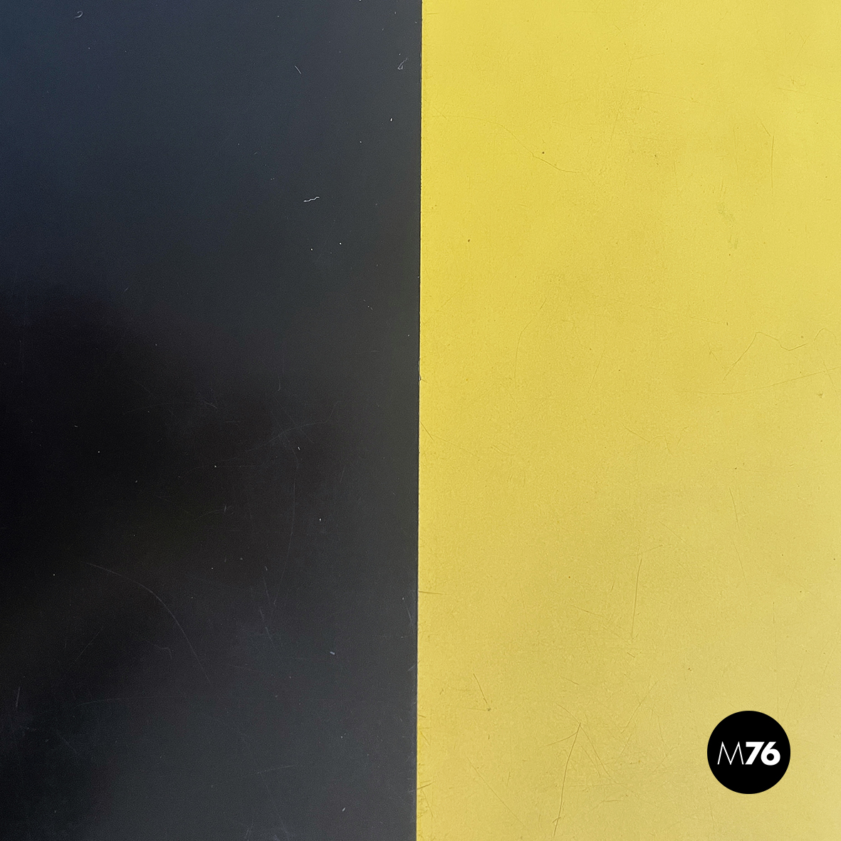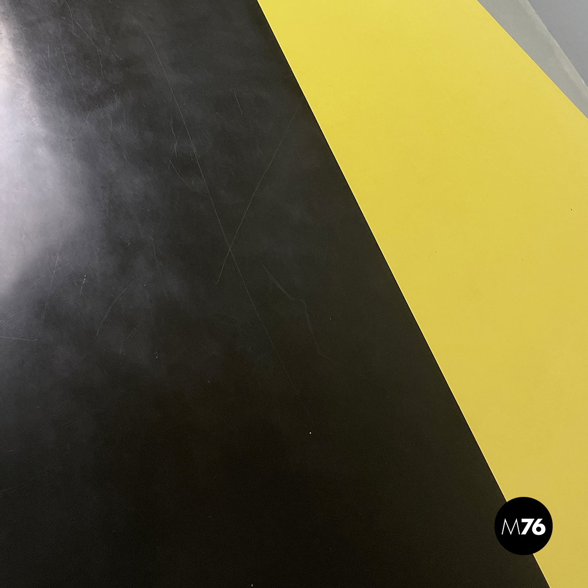 Tavolo da pranzo con piano geometrico in legno e formica. Il piano presenta una colorazione a scacchiera in giallo e nero. Le zampe sono a sezione quadrata, unite da traverse a sezione rettangolare e tondini, tutti in ferro verniciato marrone. Piedini squadrati neri.