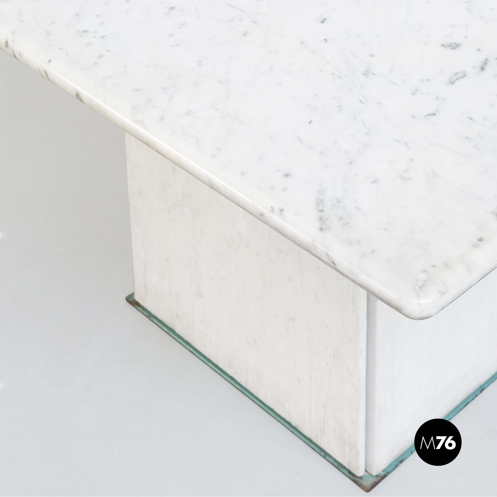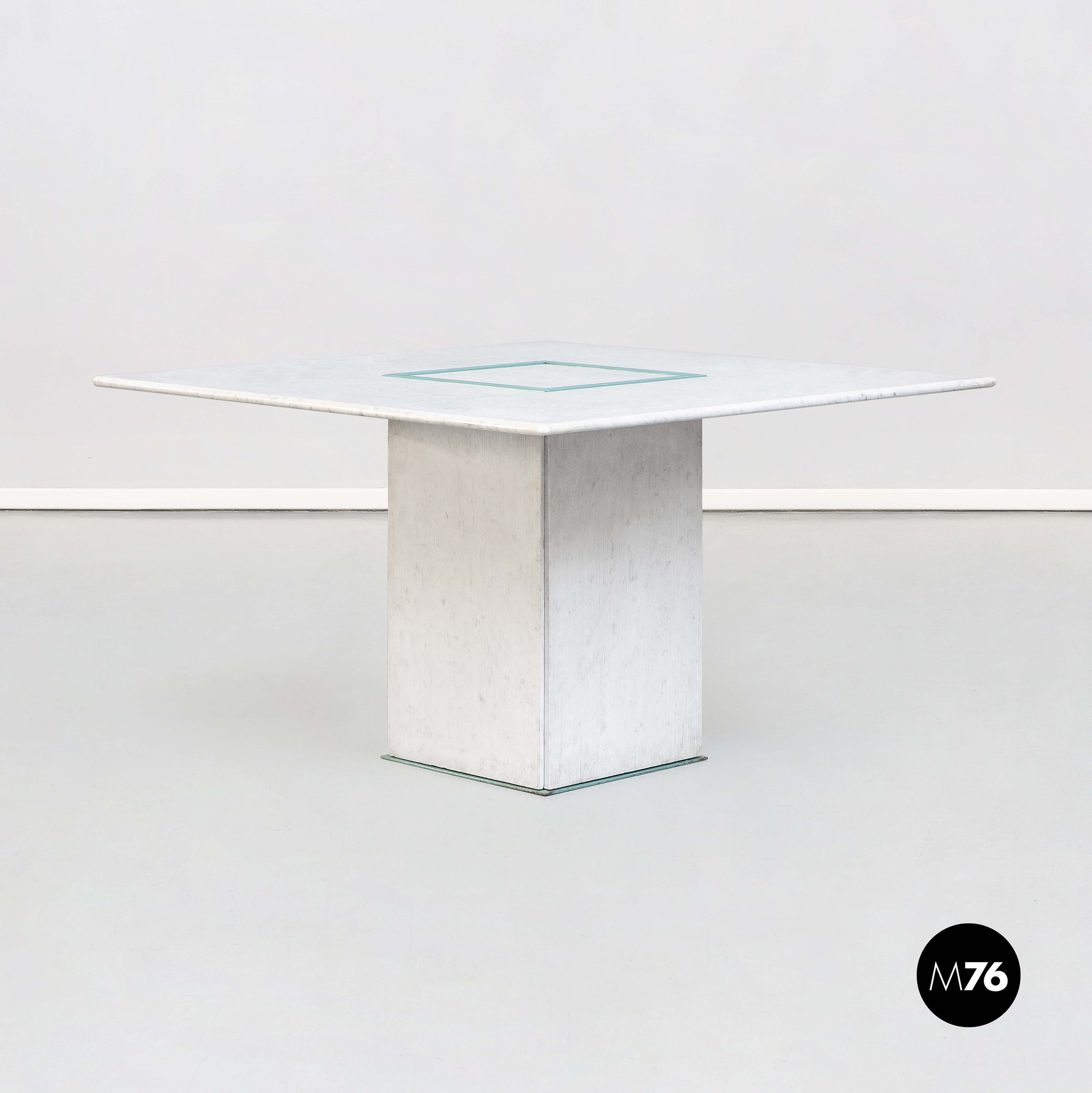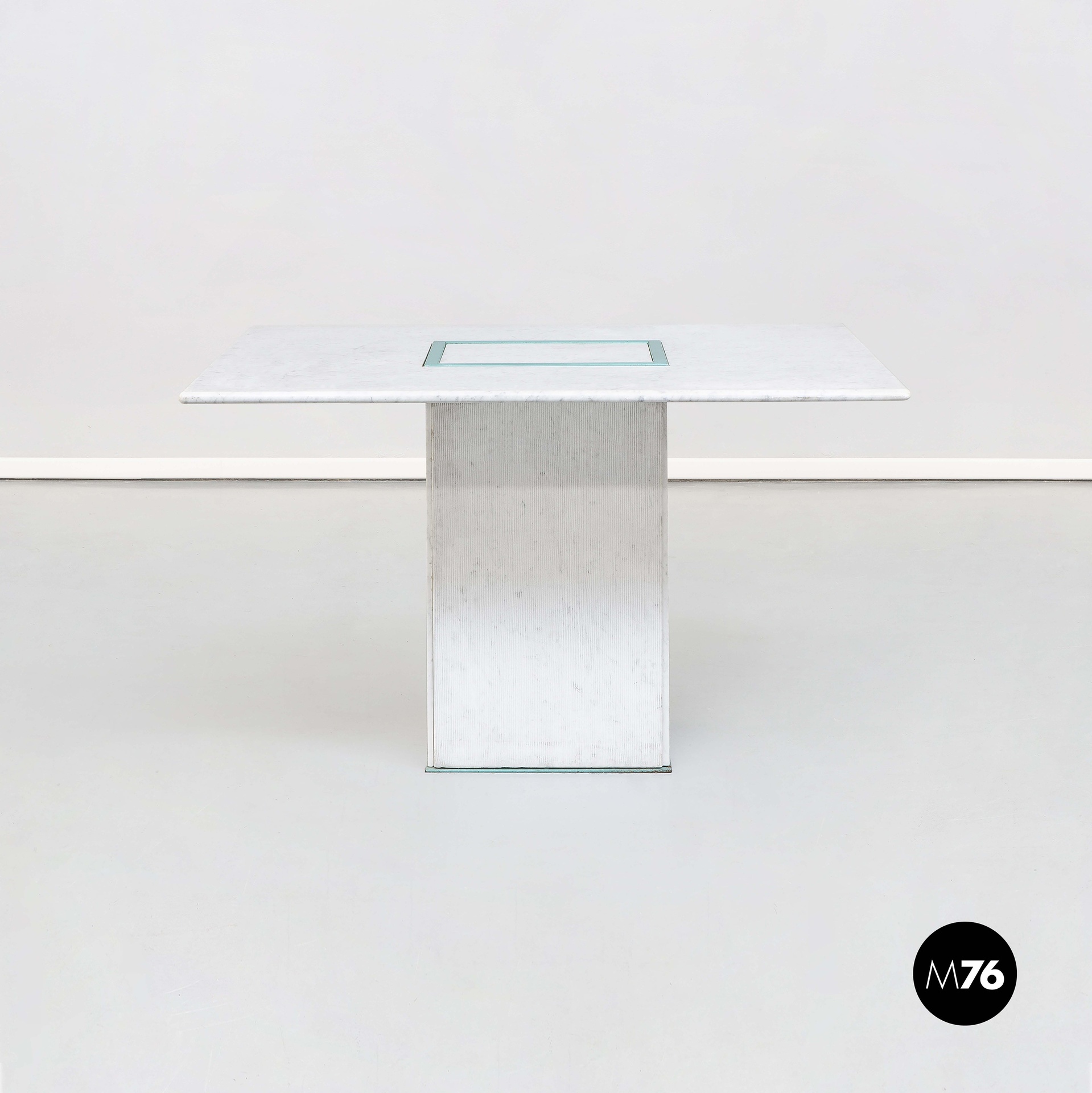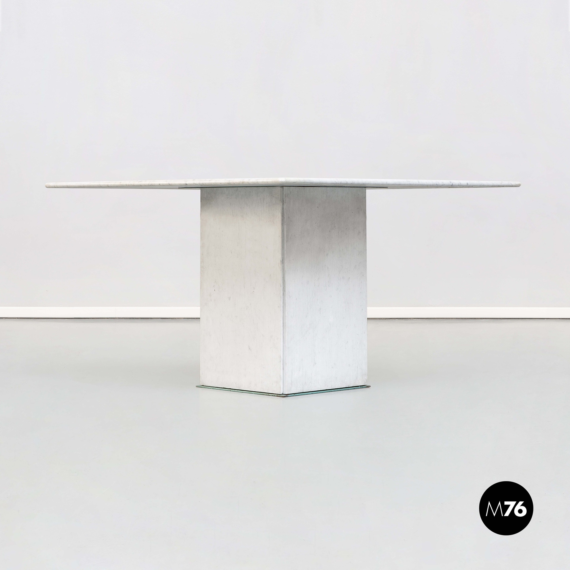 Tavolo da pranzo scultoreo con piano quadrato in marmo di Carrata con basamento squadrato e composto da una base in metallo blu su cui, su ciascun lato, poggia una lastra di marmo rigato, raccordata all’altra. Il sistema di giunzione si completa con una seconda struttura metallica di colore blu, riempita nell’intersezione delle quattro lastre rigate, con una lastra di marmo squadrata più piccola.
