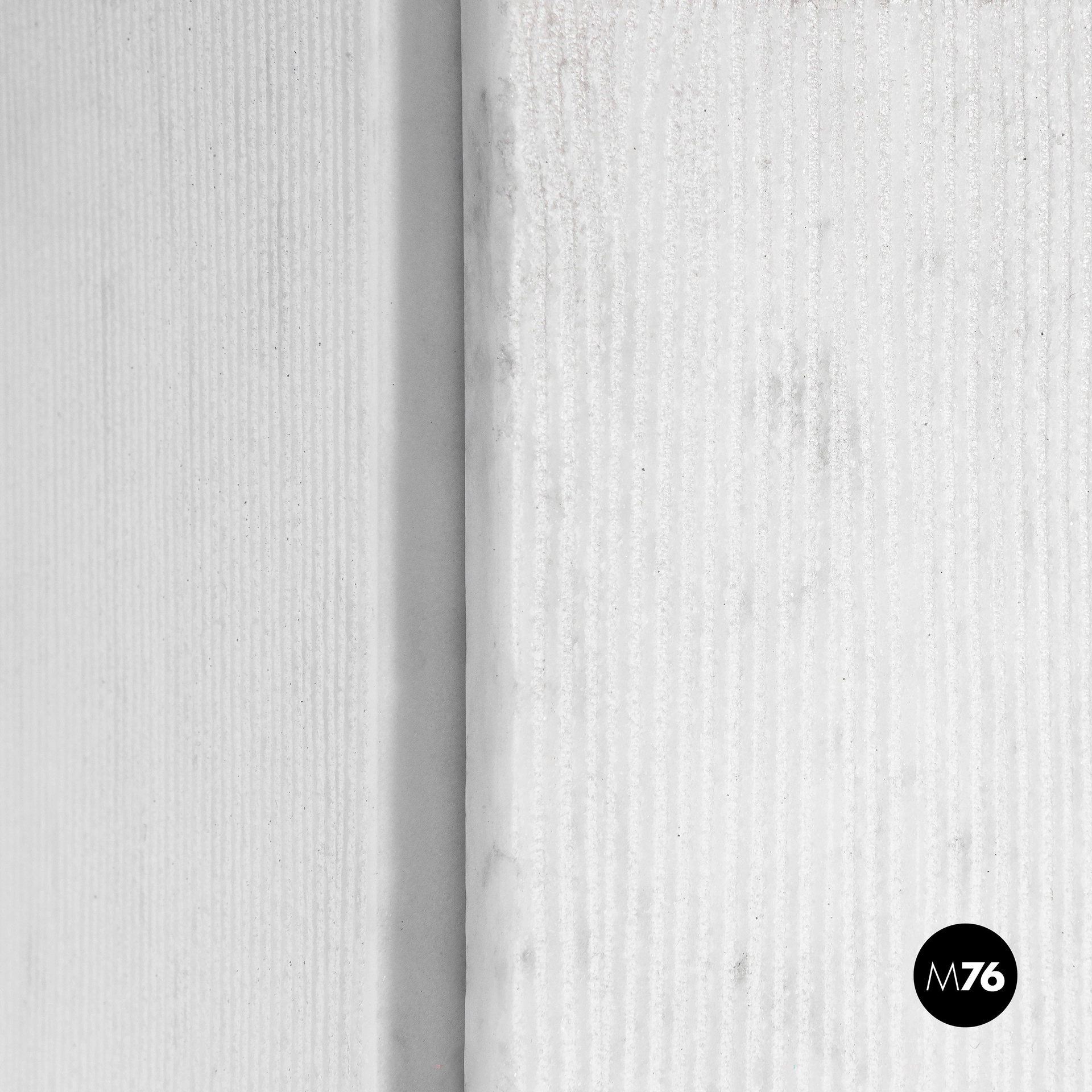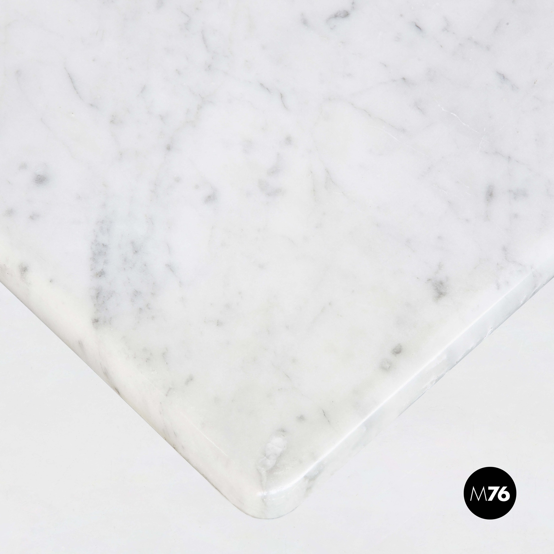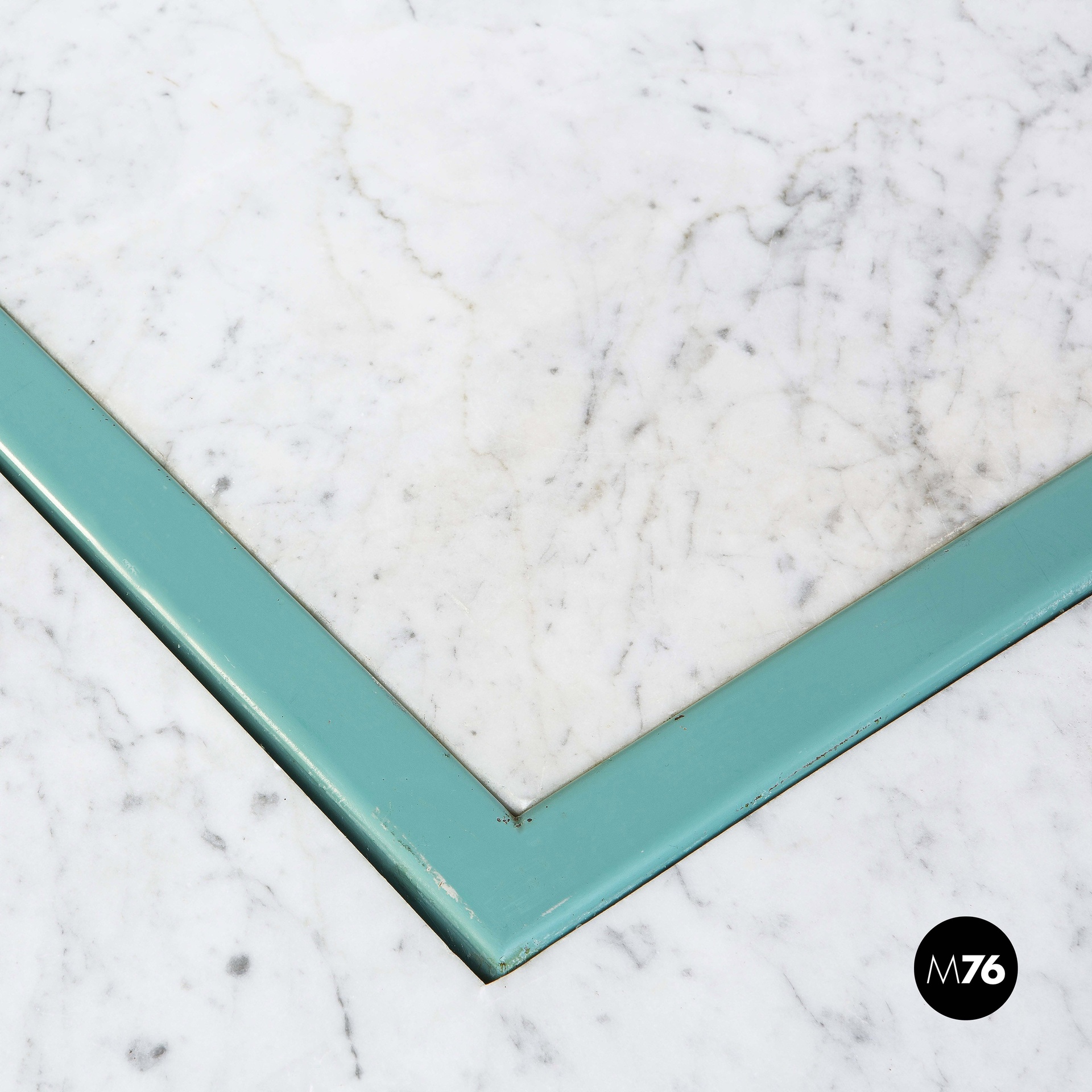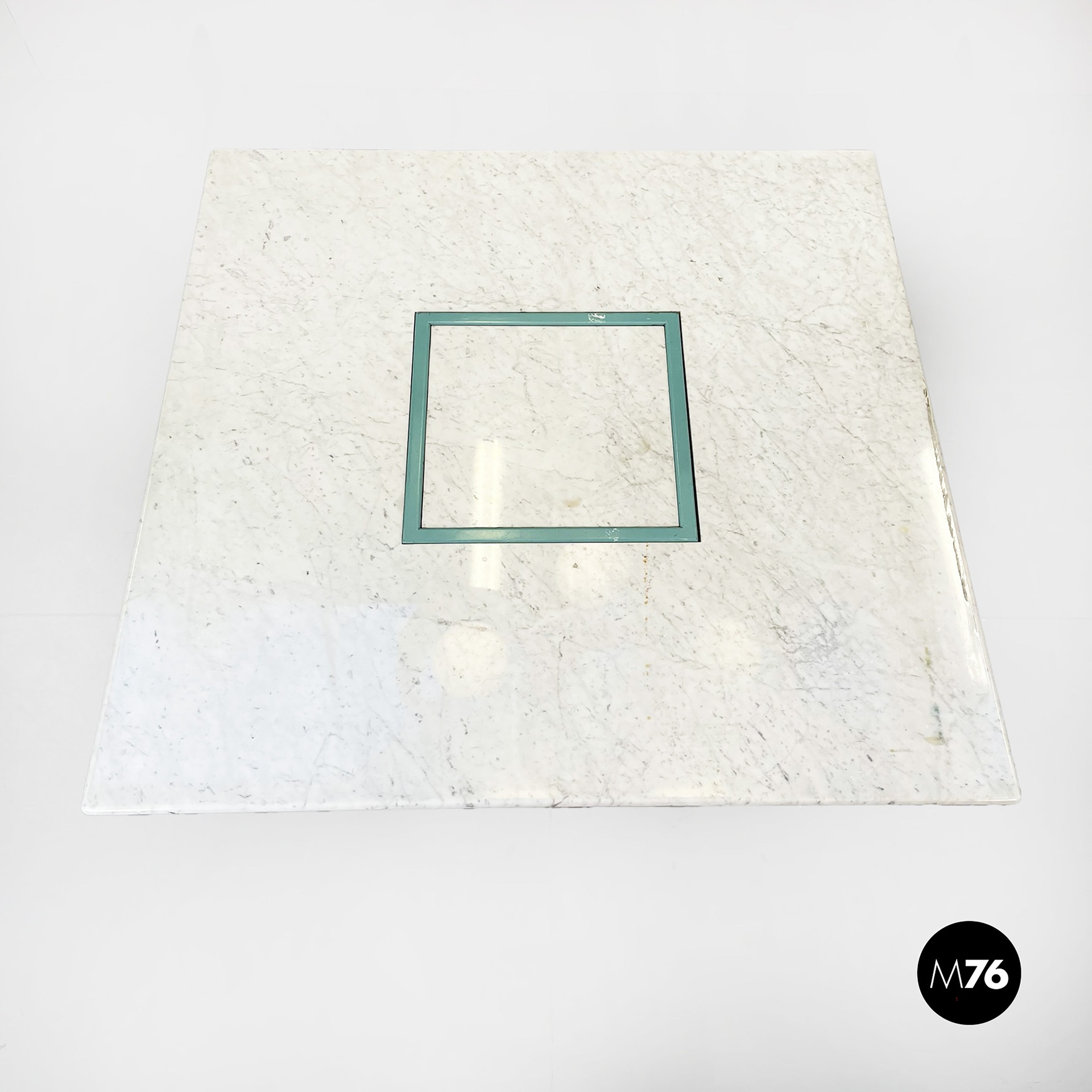 Tavolo da pranzo scultoreo con piano quadrato in marmo di Carrata con basamento squadrato e composto da una base in metallo blu su cui, su ciascun lato, poggia una lastra di marmo rigato, raccordata all’altra. Il sistema di giunzione si completa con una seconda struttura metallica di colore blu, riempita nell’intersezione delle quattro lastre rigate, con una lastra di marmo squadrata più piccola.