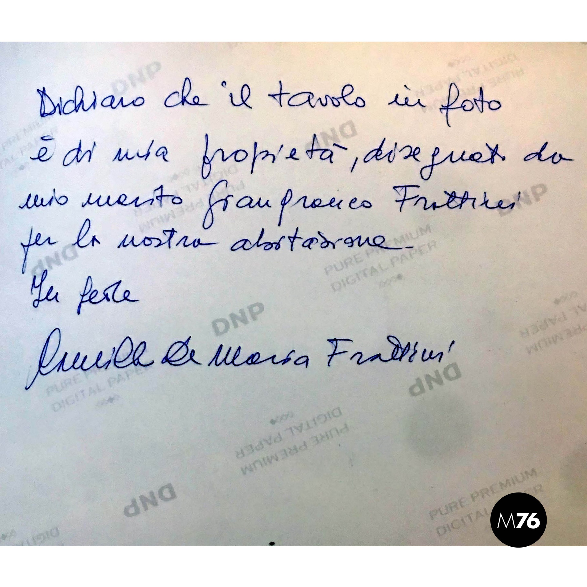 Prodotto e disegnato da Gianfranco Frattini nel 1985. Proveniente dalla sua casa privata in Italia. L’autenticità è confermata da una fotografia che rappresenta la stanza dove è stato posizionato il tavolo, firmata dietro da Camilla De Maria Frattini, moglie del designer italiano.