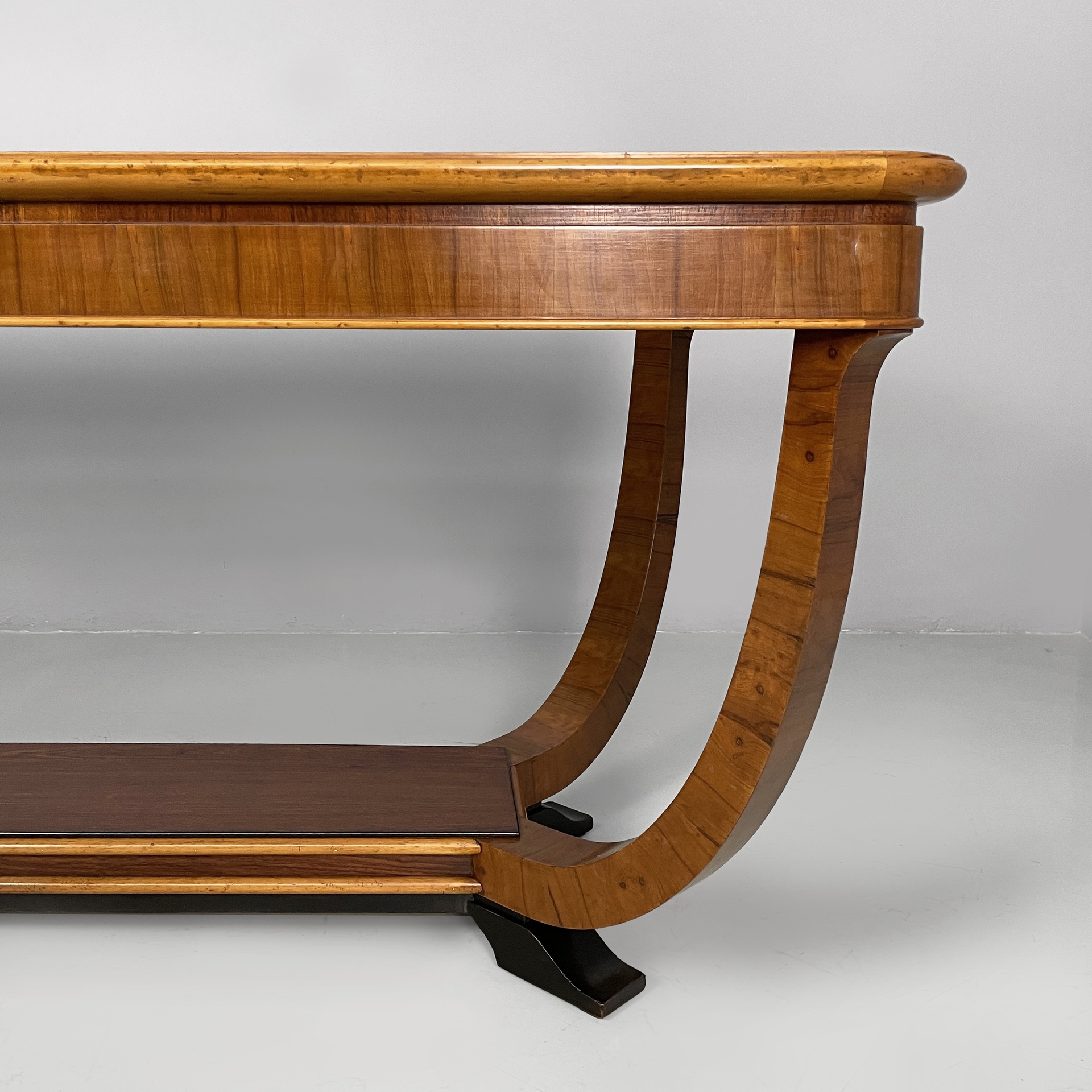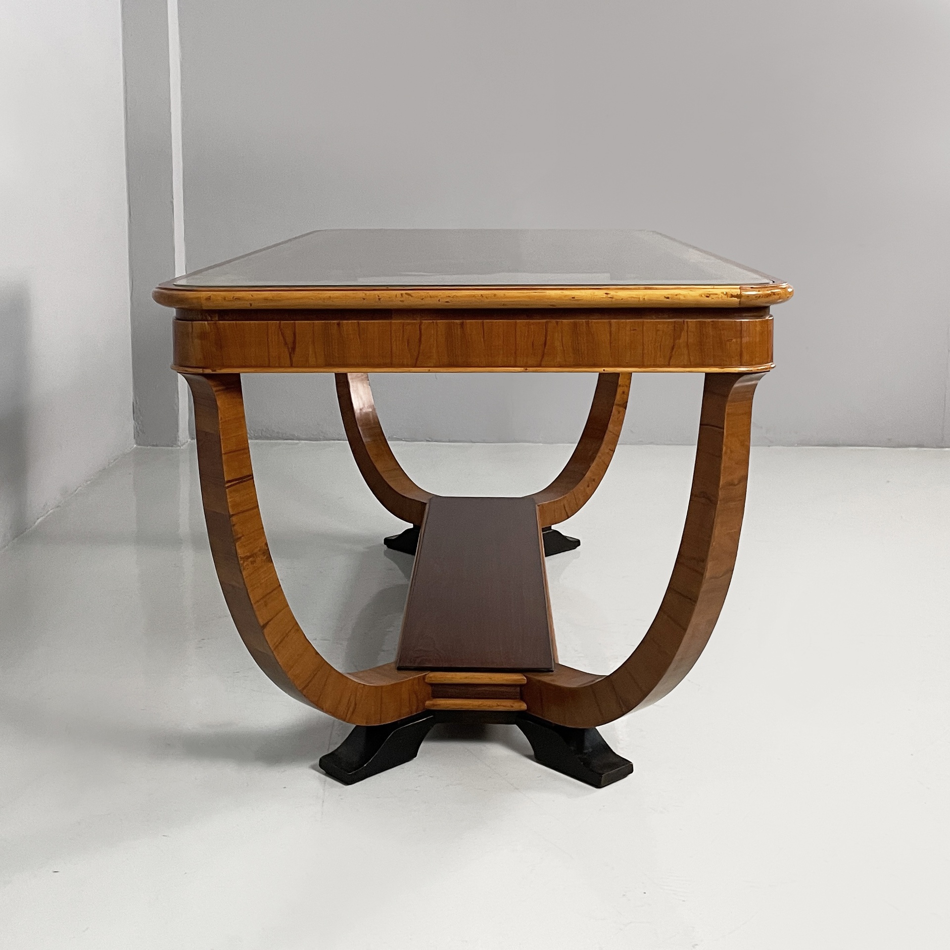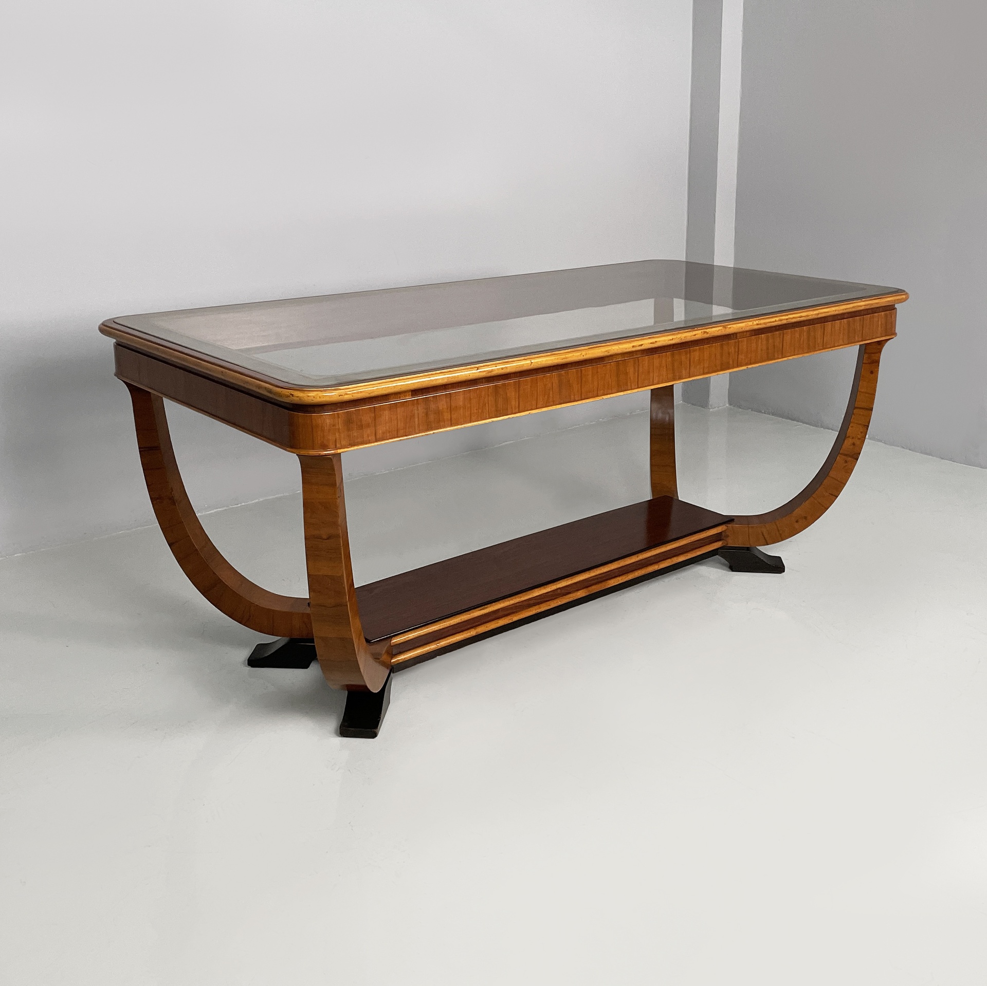 Tavolo da pranzo con piano rettangolare ad angoli arrotondati in vetro colato e struttura in legno. Il profilo del piano presenta un finitura satinata applicata sul retro. Le zampe curvate in legno si uniscono alla base rettangolare in legno chiaro e scuro. Piedini in legno nero. Art Deco.