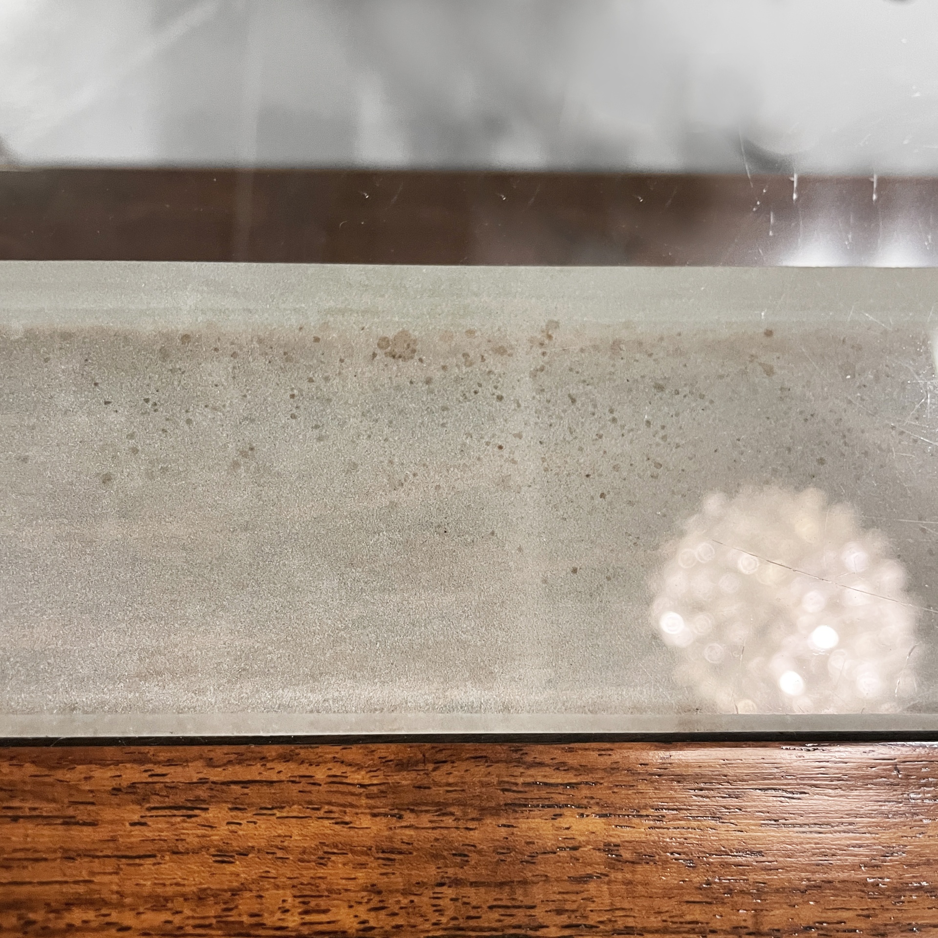 Buone condizioni. Il vetro presenta numerosi graffi e segni sparsi. Il legno presenta leggeri segni sparsi.