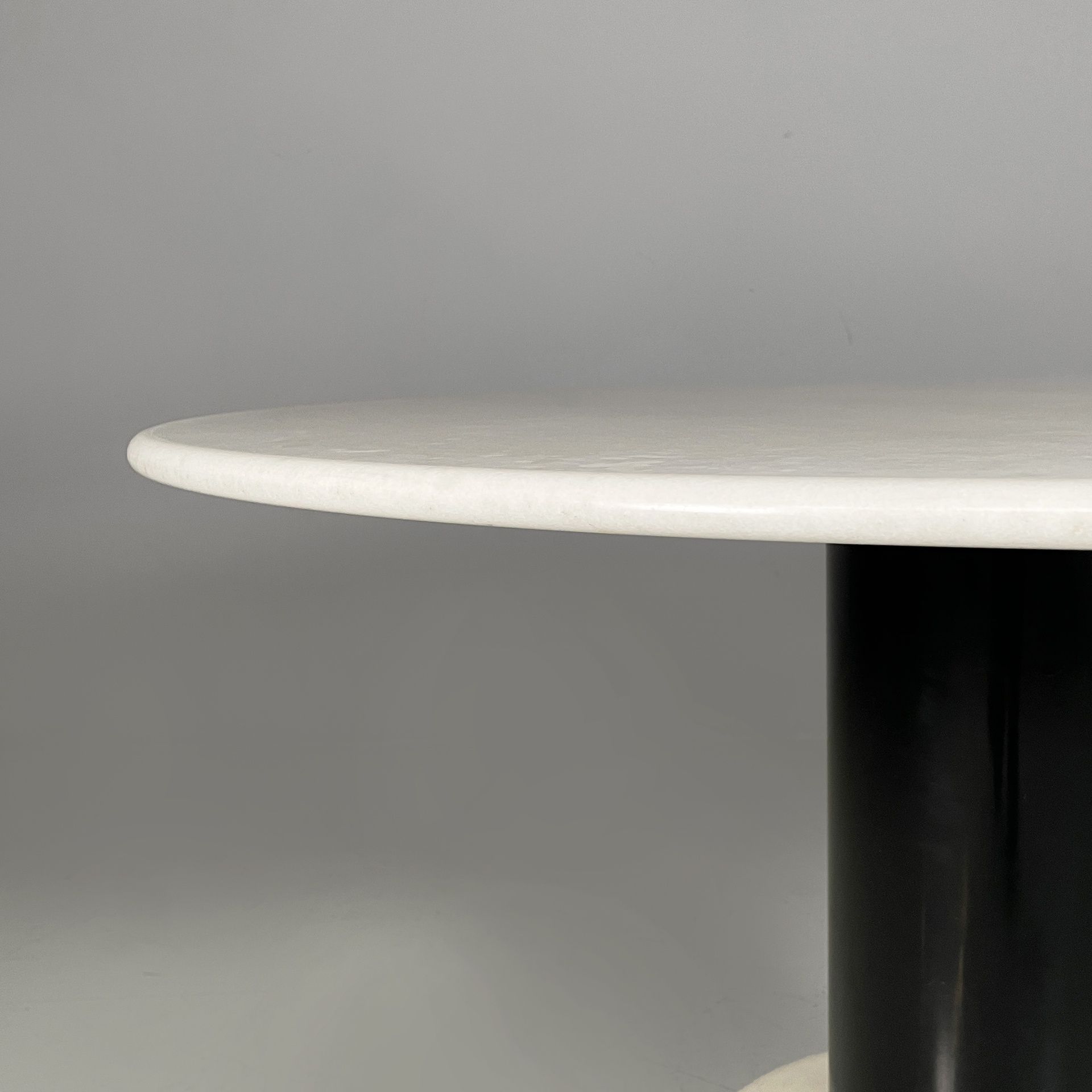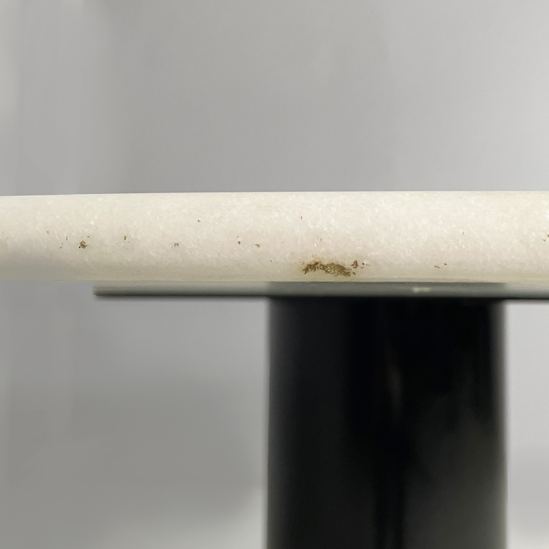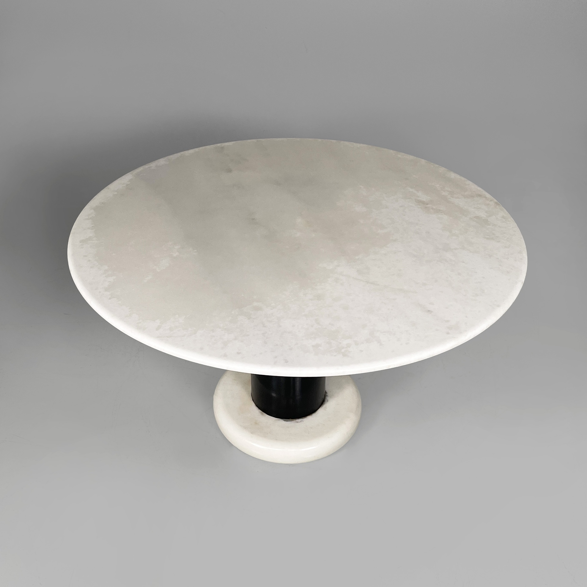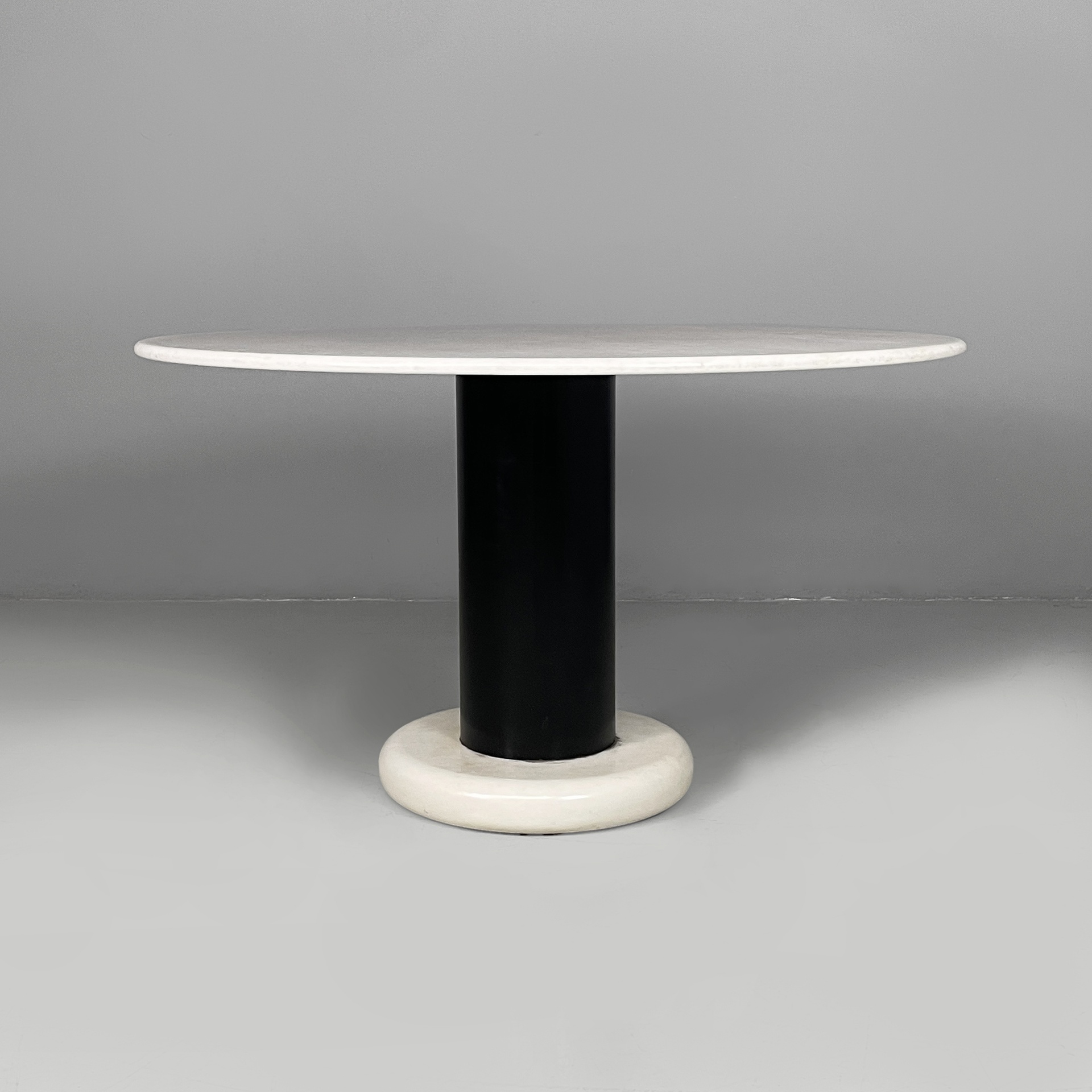 Tavolo da pranzo mod. Loto Rosso con piano tondo in marmo bianco. la struttura centrale cilindrica p in metallo verniciato nero. Base tonda in marmo bianco.