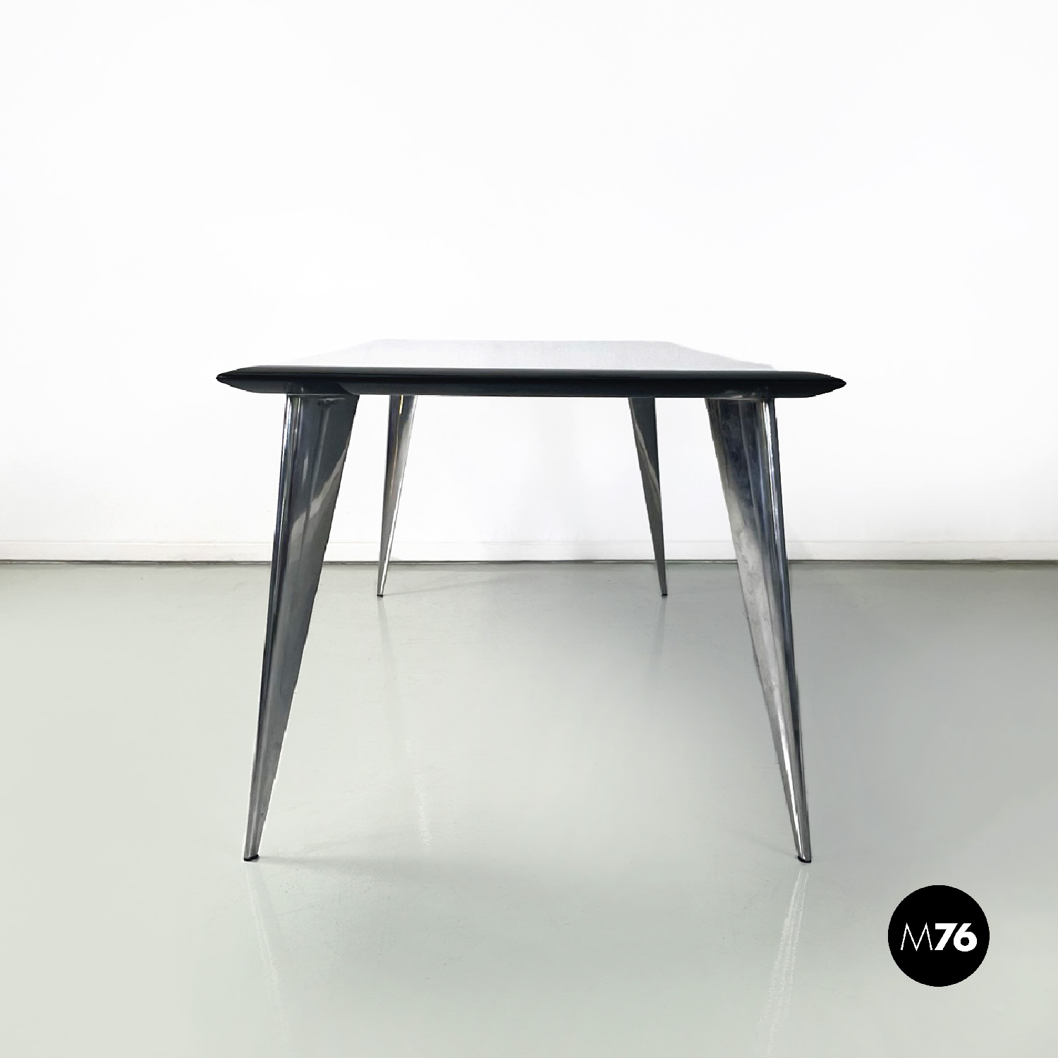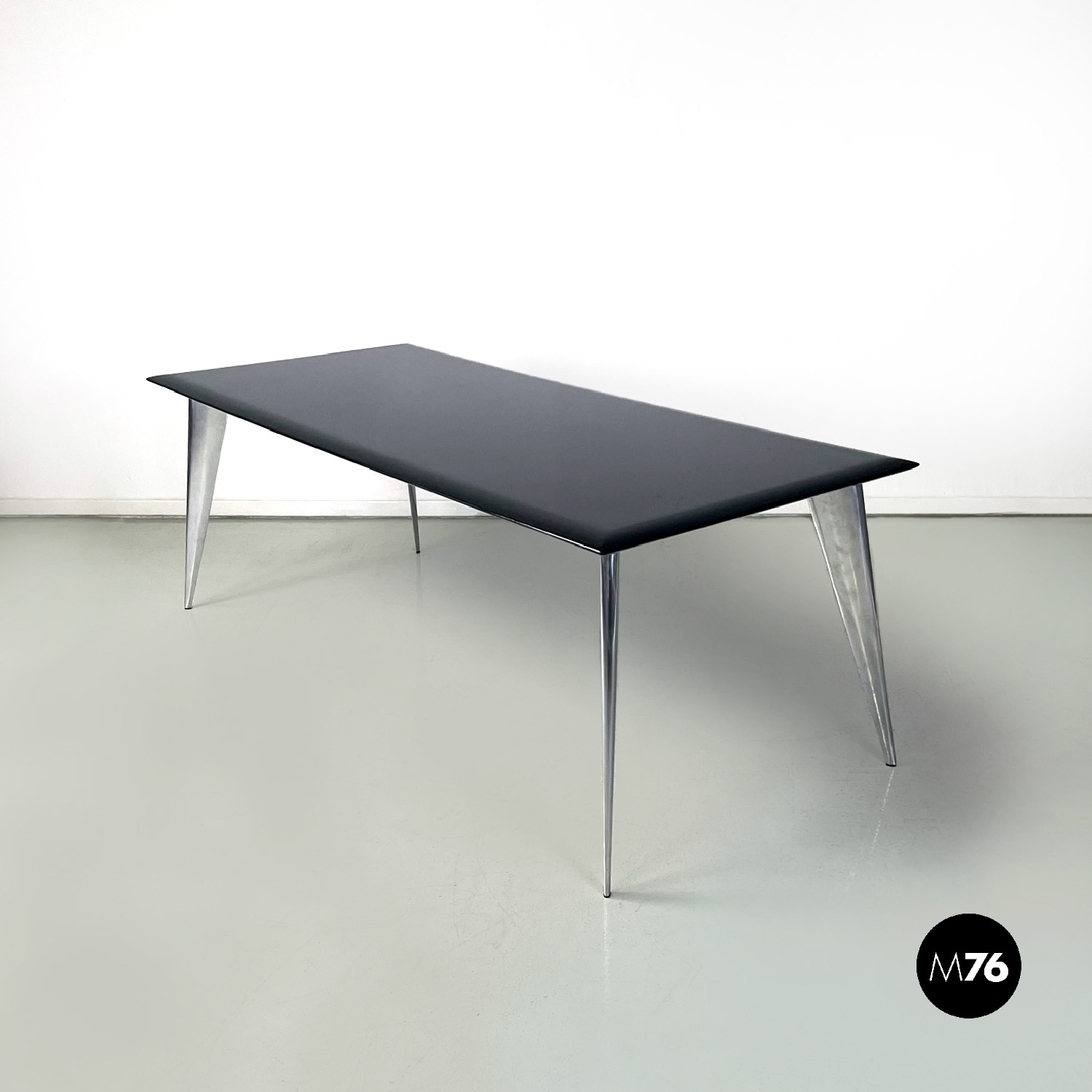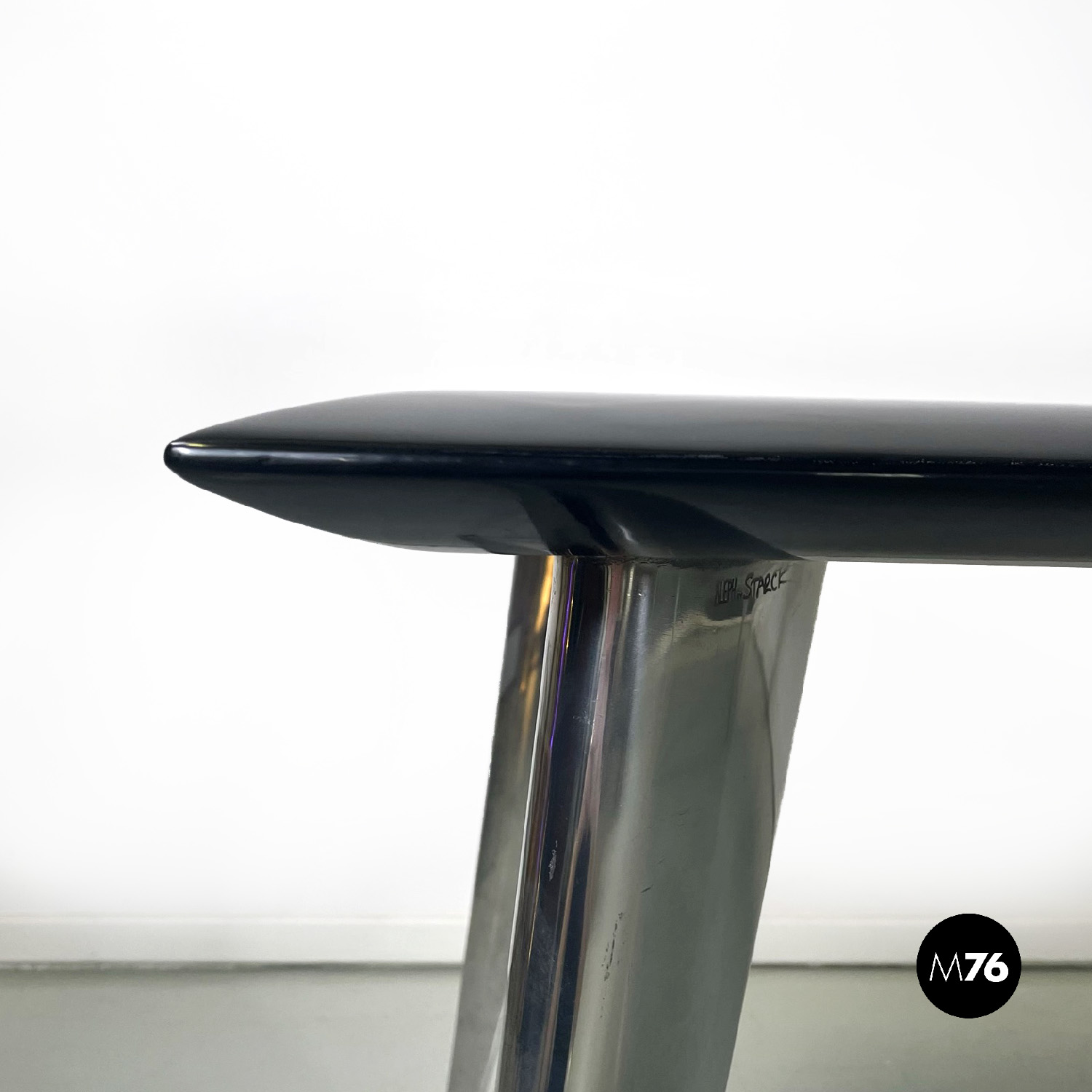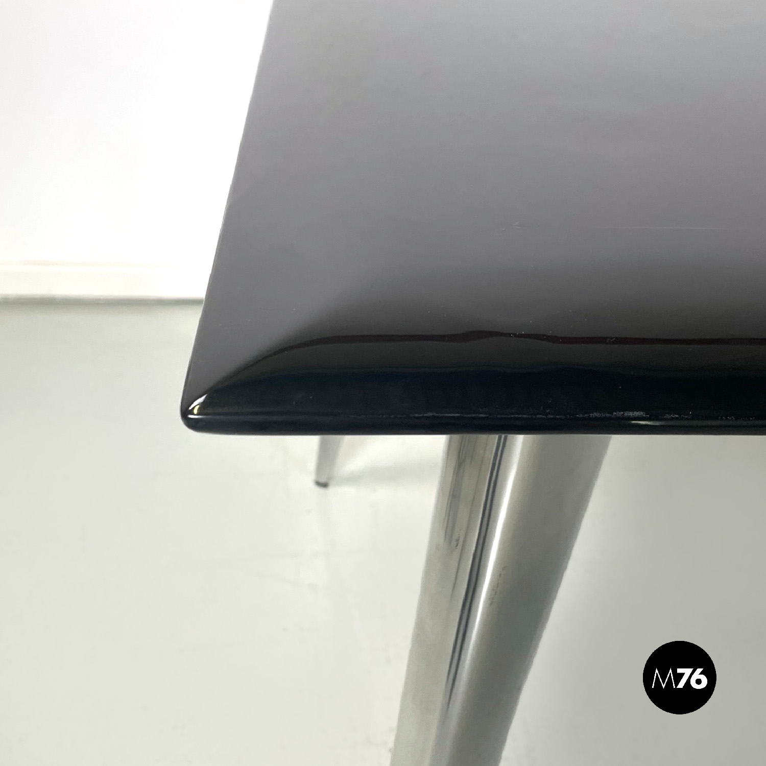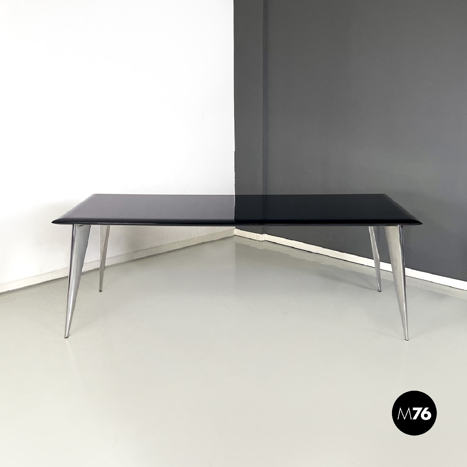 Tavolo da pranzo modello M rettangolare. Il piano è in legno verniciato nero lucido con sagomatura speculare nella parte inferiore e superiore su tutto il perimetro. Le gambe, in metallo, sono a sezione irregolare: partono dal piano con sezione ellittica che diventa tonda nell’appoggio a terra della zampa.