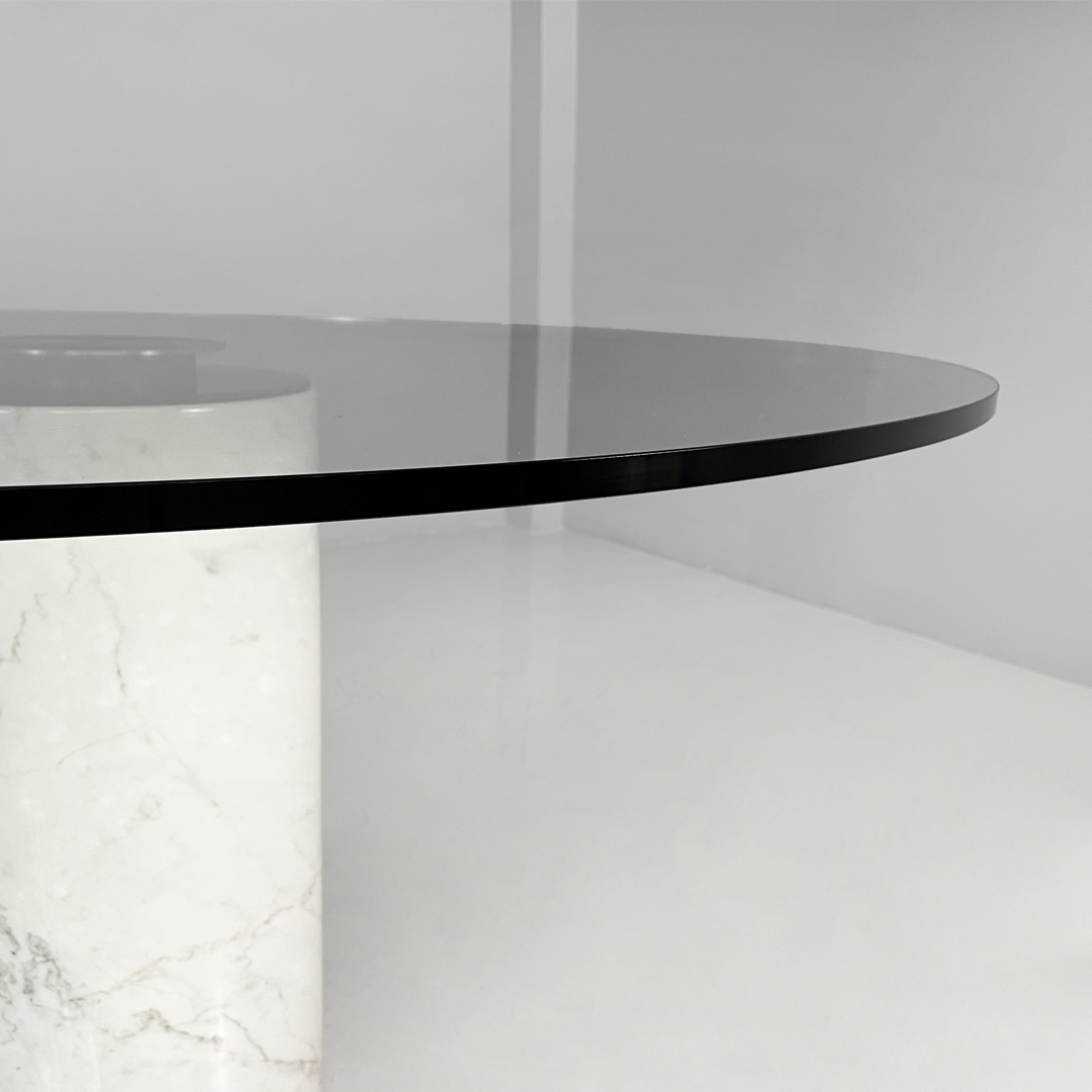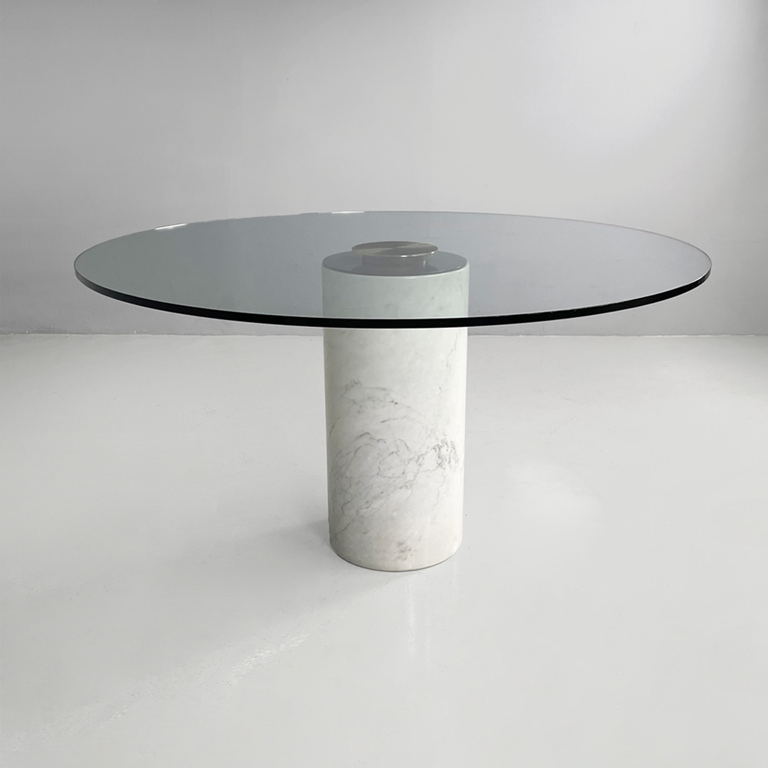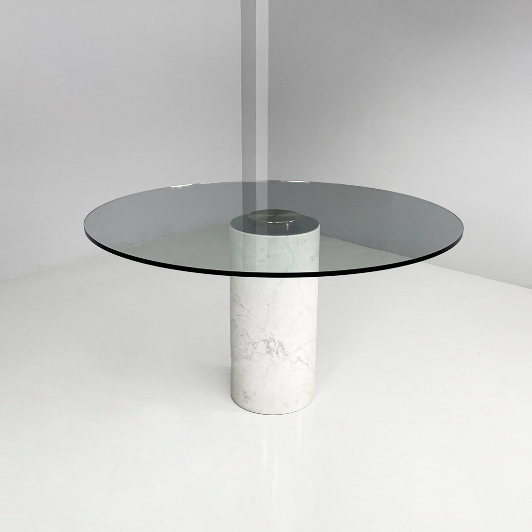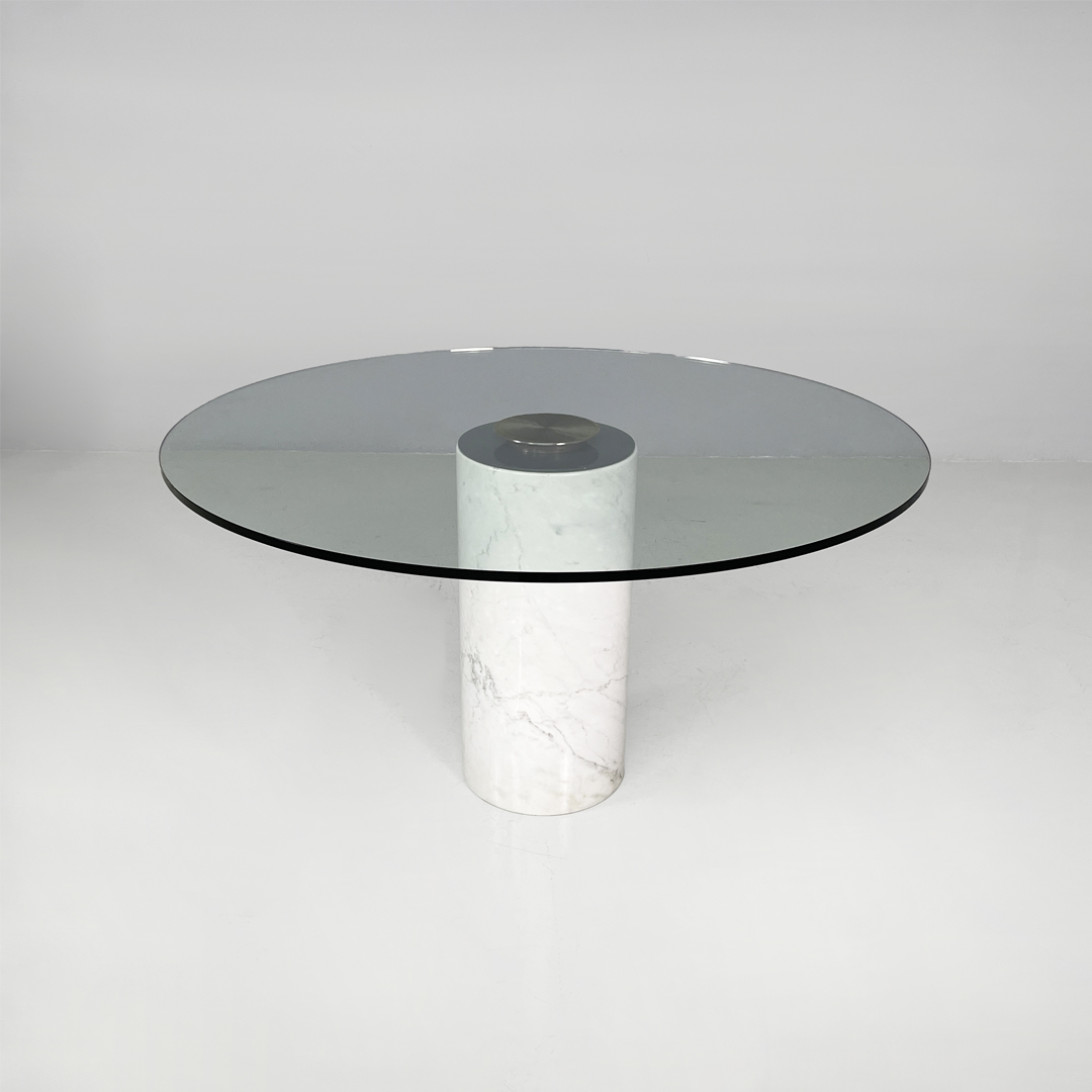 Tavolo da pranzo modello M4 in marmo e vetro. Il piano è in vetro trasparente spesso, il quale poggia centralmente sulla base tramite un sistema di fissaggio. La base è costituita da un cilindro in marmo bianco con venature grigie naturali.