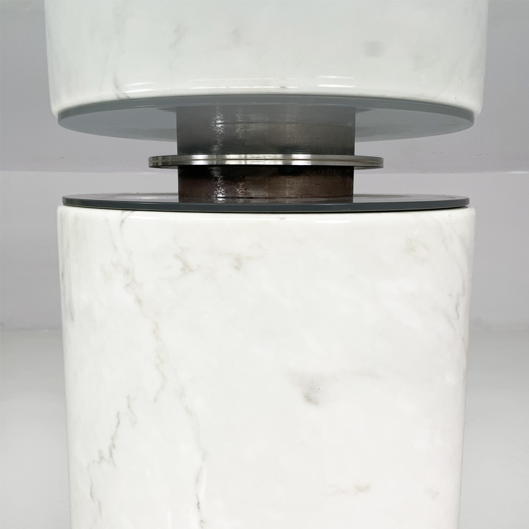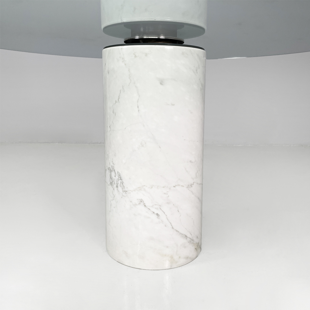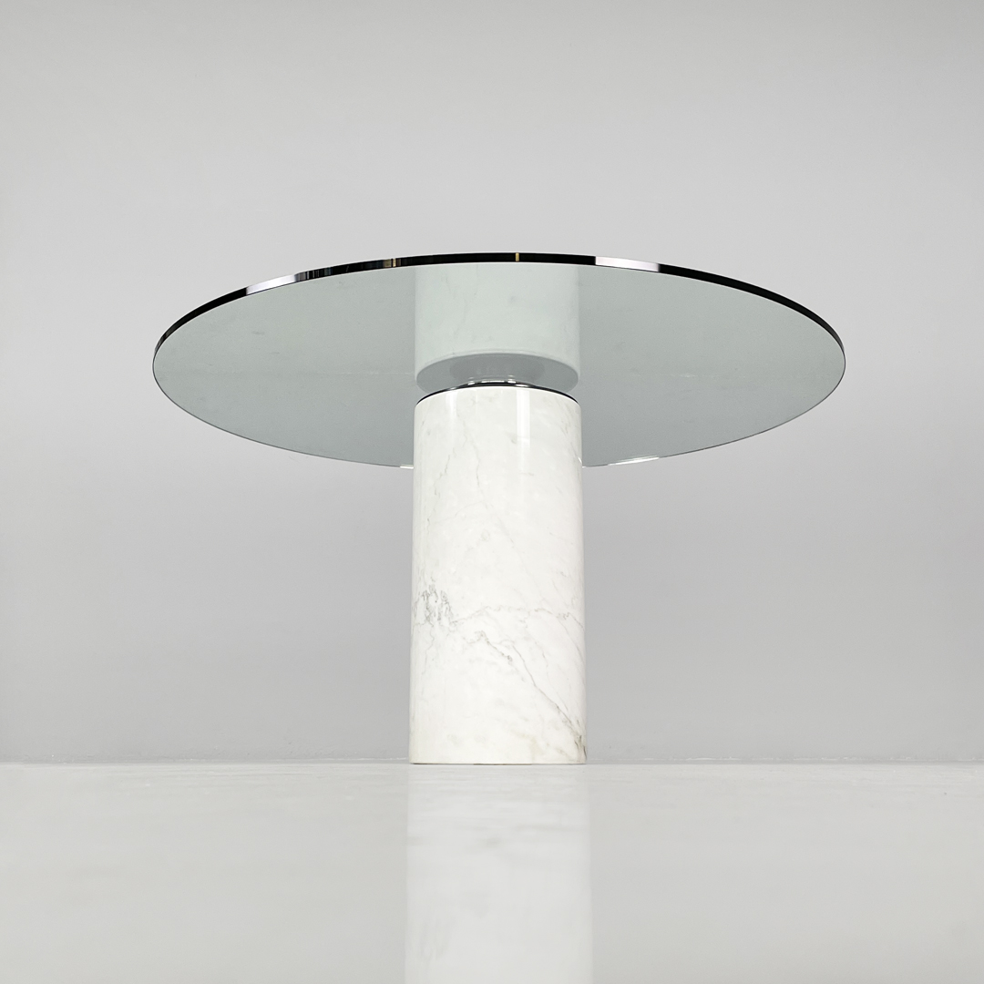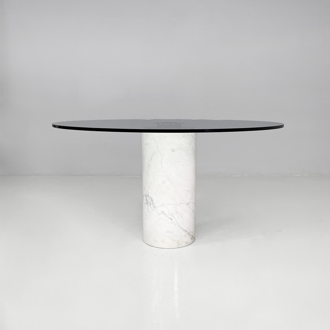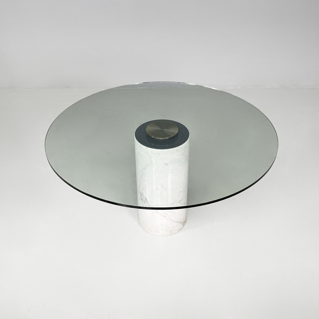 Tavolo da pranzo modello M4 in marmo e vetro. Il piano è in vetro trasparente spesso, il quale poggia centralmente sulla base tramite un sistema di fissaggio. La base è costituita da un cilindro in marmo bianco con venature grigie naturali.