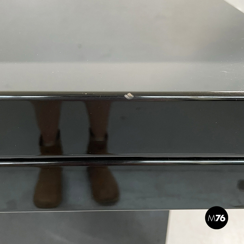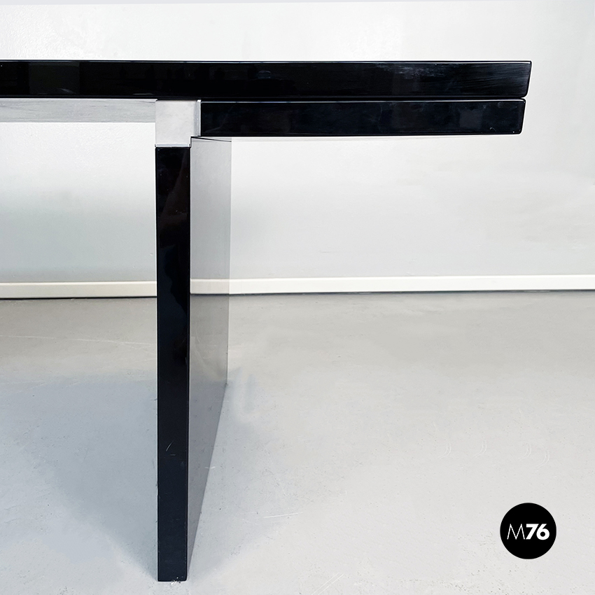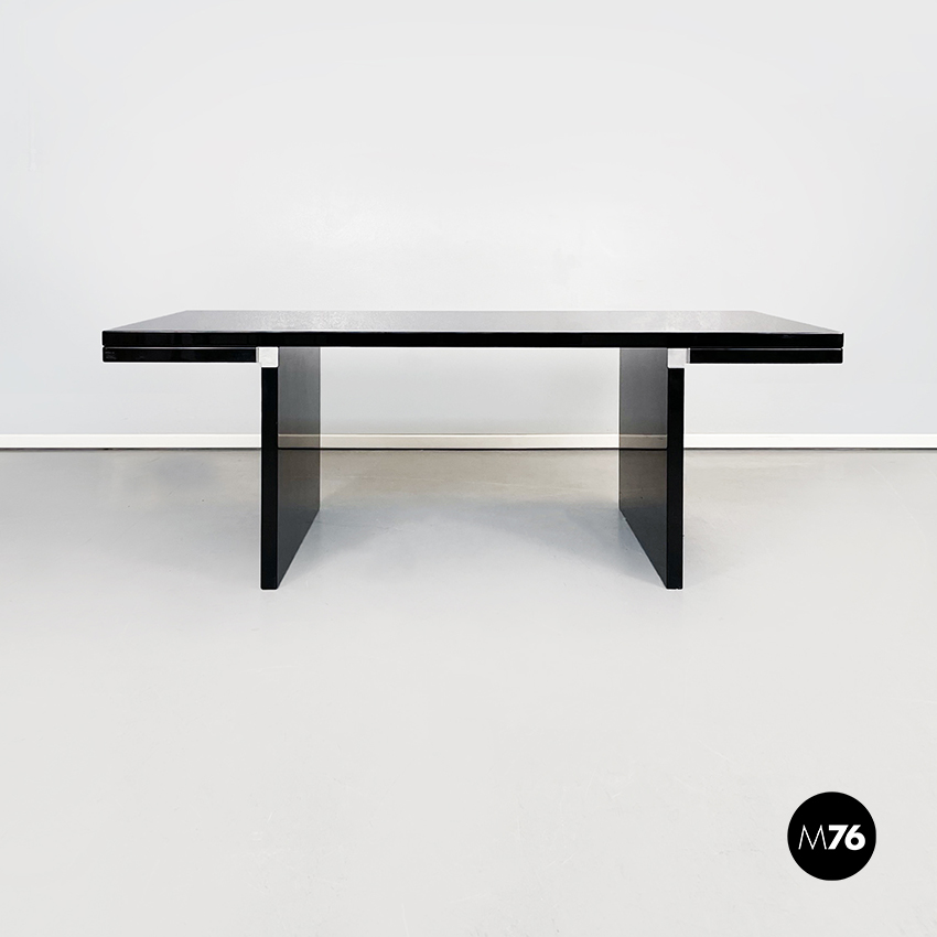 Tavolo da pranzo modello Orseolo con piano rettangolare. La struttura in legno laccato nero è realizzata tramite assemblaggio di pannelli geometrici elementari, in particolare le parti esterne del piano presentano doppio spessore. L’unione tra queste parti avviene attraverso delle giunzioni in fusione di alluminio satinato.