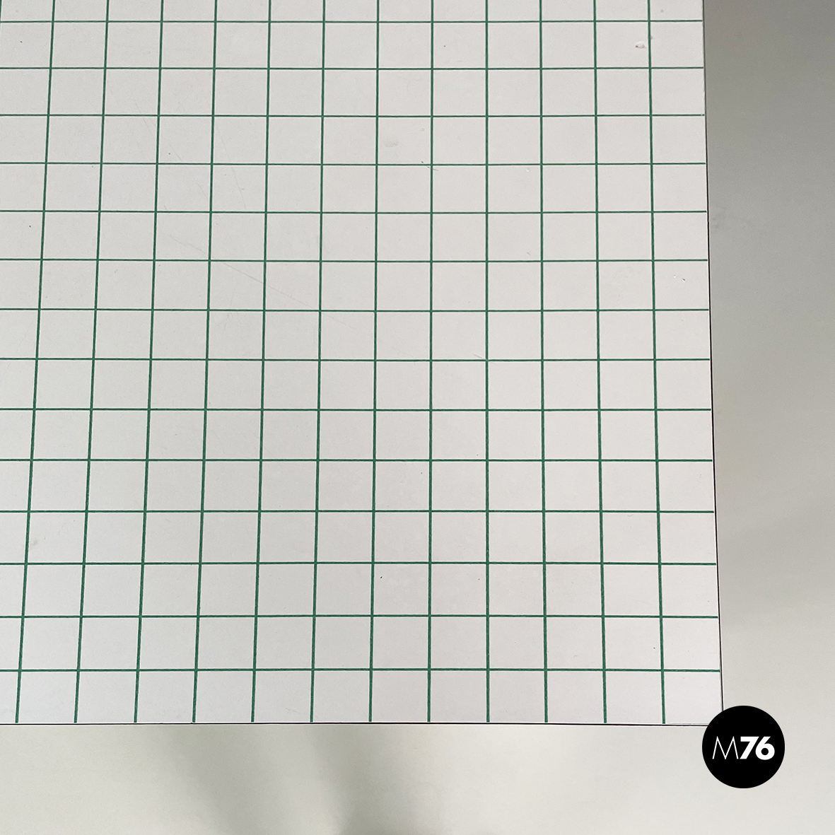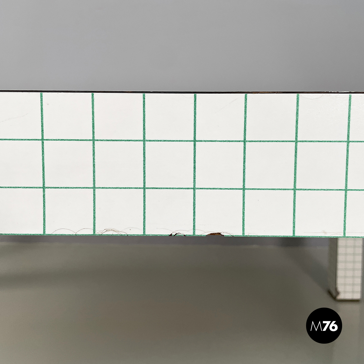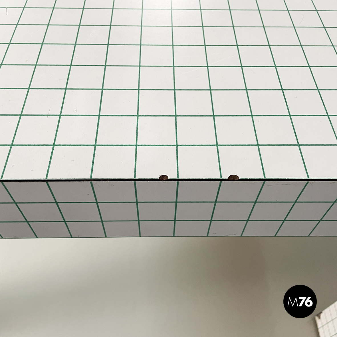 Tavolo da pranzo mod. Quaderna in legno con finitura in laminato bianco con stampa a quadrati di tre cm a righe verdi. Il piano è rettangolare, mentre le zampe sono sezione quadrata. Utilizzabile anche come scrivania.