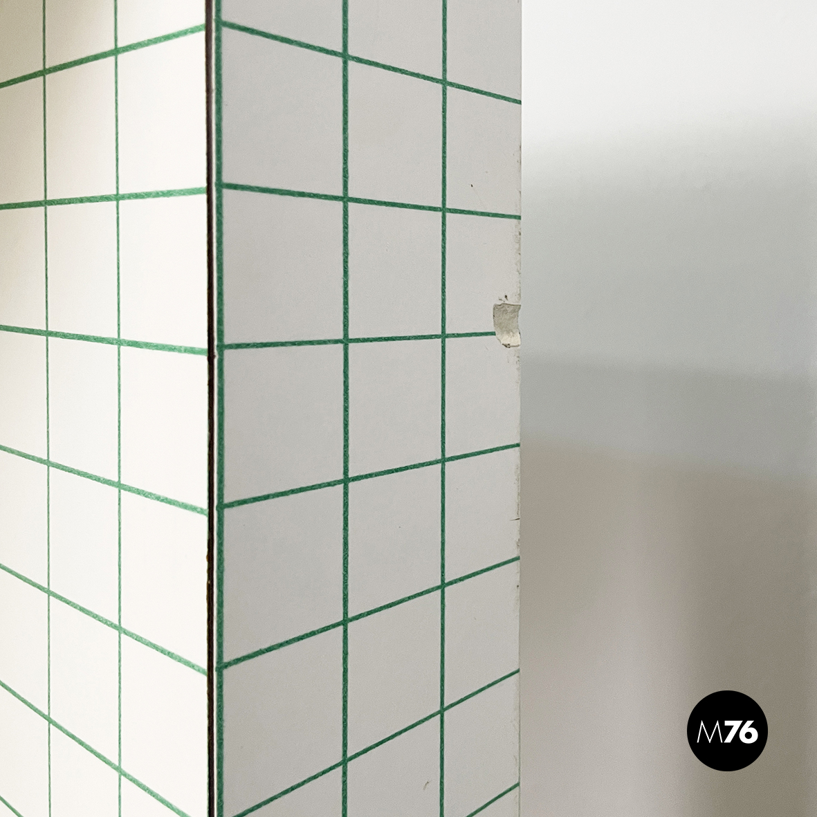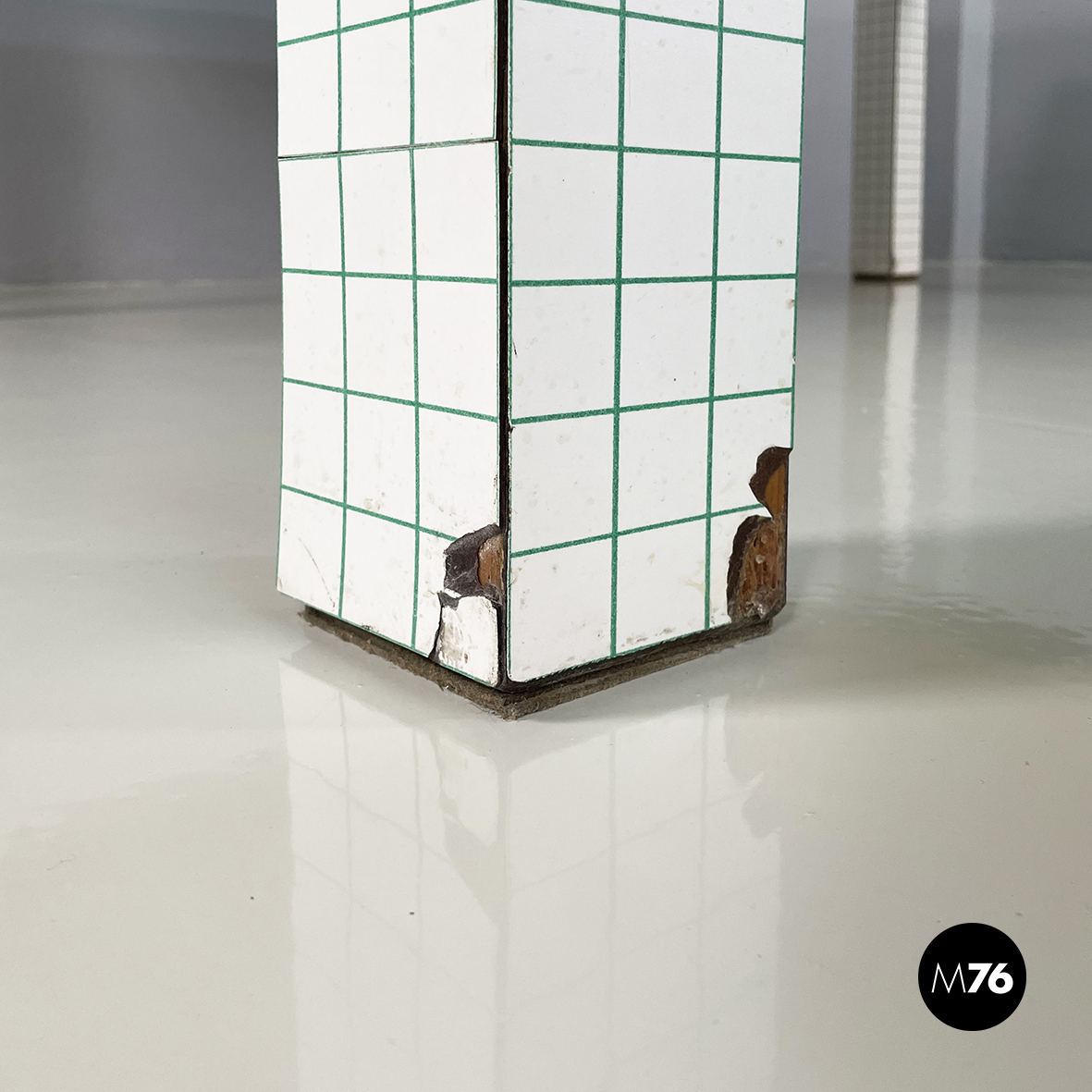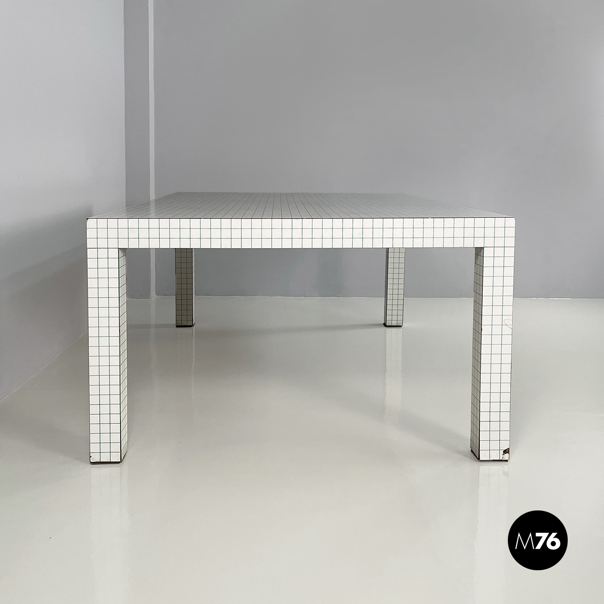 Tavolo da pranzo mod. Quaderna in legno con finitura in laminato bianco con stampa a quadrati di tre cm a righe verdi. Il piano è rettangolare, mentre le zampe sono sezione quadrata. Utilizzabile anche come scrivania.