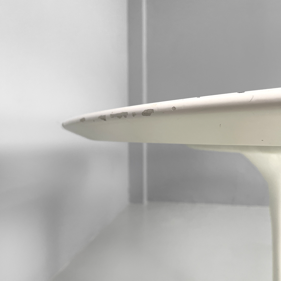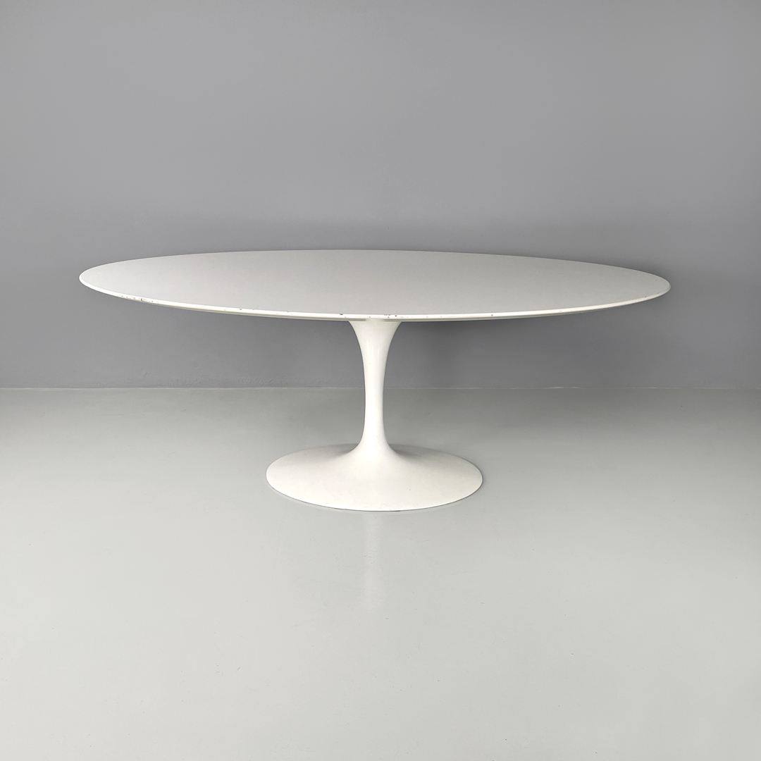 Tavolo da pranzo modello Tulip con piano ovale in laminato bianco. La zampa dal tavolo è in metallo verniciato bianco.