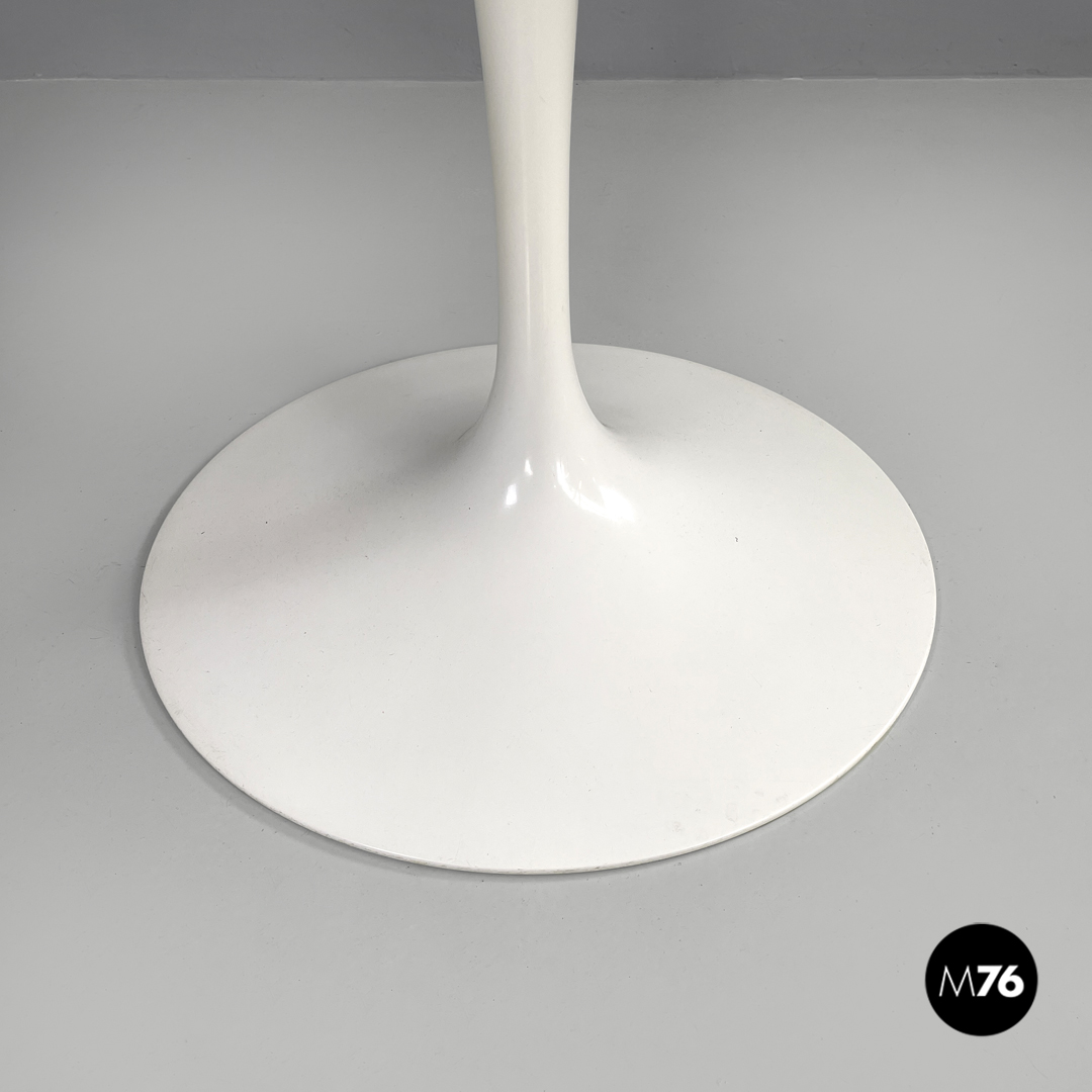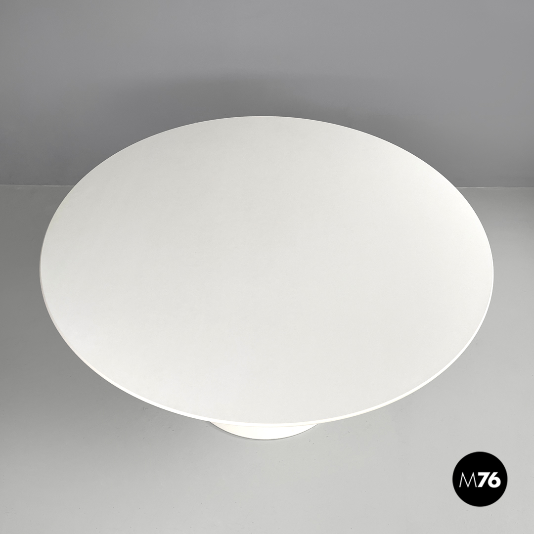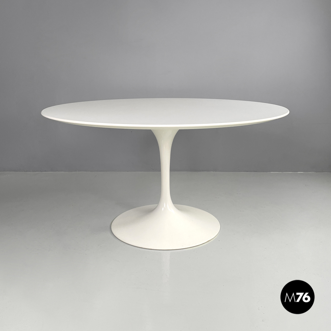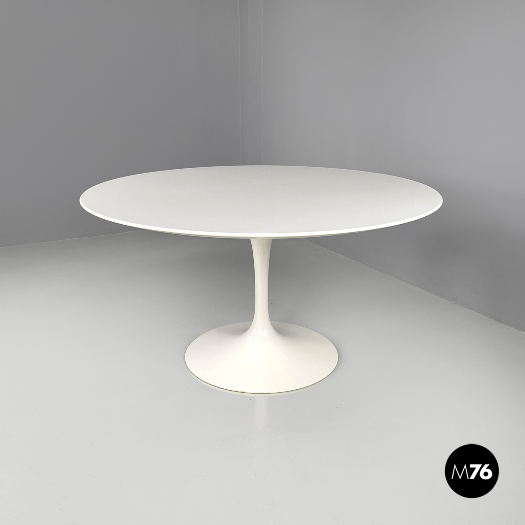Tavolo da pranzo modello Tulip con piano tondo in laminato bianco. La zampa del tavolo è in metallo verniciato bianco.
